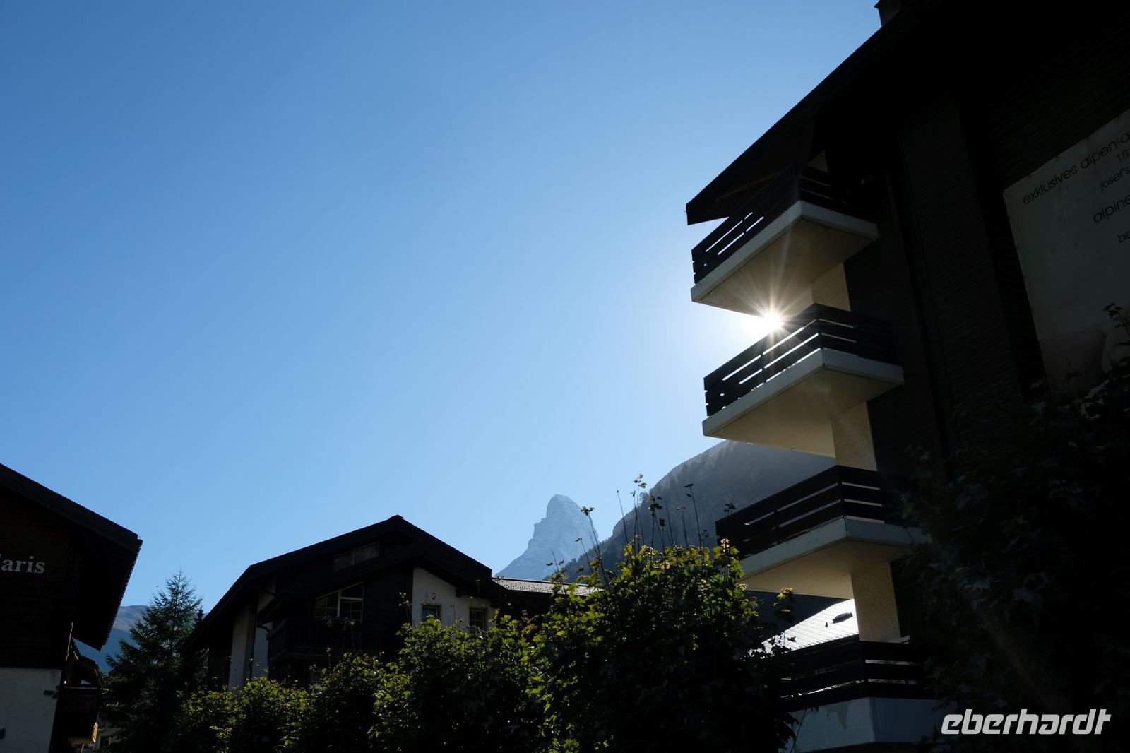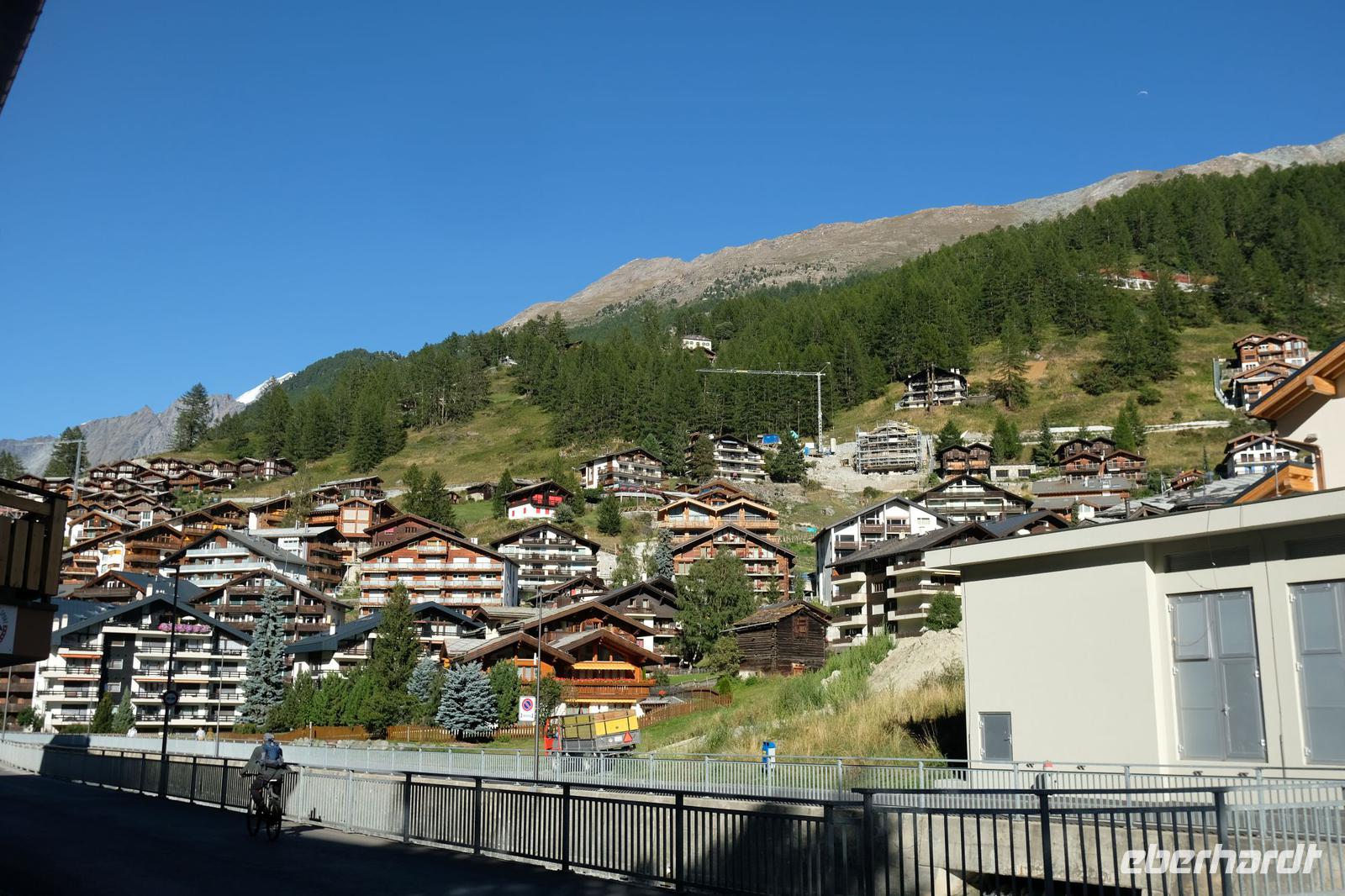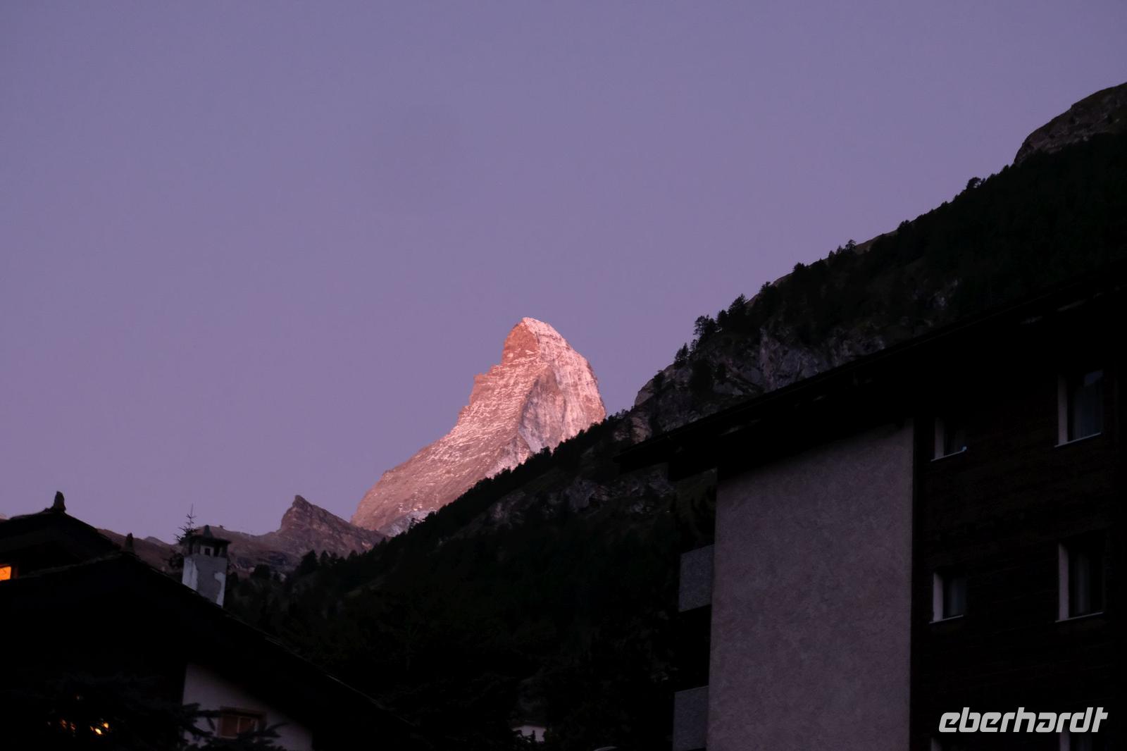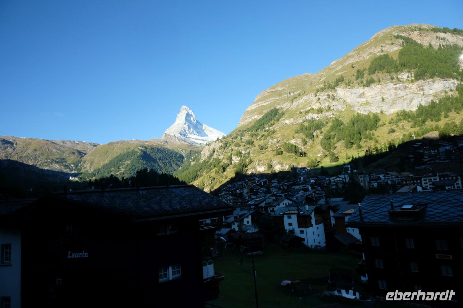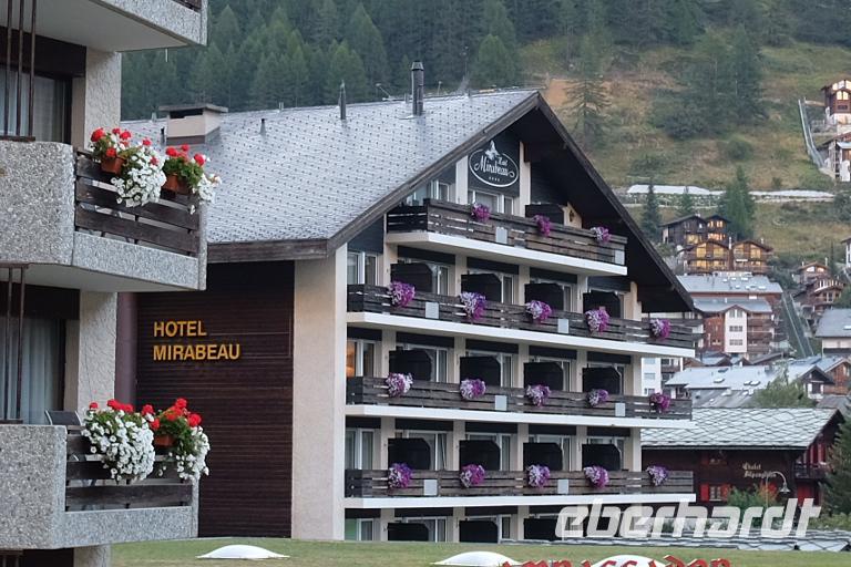 Heute war unsere Vorfreude besonders groß, denn gleich nach dem Frühstück fuhr uns Frank zum Bahnhof nach St. Moritz. Nachdem wir im 1. Klasse-Panoramawagen unsere bequemen Sitze eingenommen hatten, fuhr der Glacier-Express pünktlich nach Zermatt los. Die großen sauberen Scheiben garantierten einen wunderbaren Blick auf die kommenden Ereignisse. Die Fahrt durch das Albula-Tunnel und die Albula-Viadukte und Kehrtunnel war genauso schnell vorbei wie die Fahrt über das Landwasserviadukt. Die wundervolle Rheinschlucht prägte sich in unseren Köpfen genauso ein wie die immer näher rückenden schneebedeckten Berge. Auf dem Oberalppass bei 2044 m hatten wir den höchsten Punkt unserer Tagesreise erreicht. Schnell ging es dann wieder durch Kehren und dem Furka Bahn-Tunnel in den Goms. Am späten Nachmittag, kurz vor Zermatt sahen wir auch ganz kurz das Matterhorn. Vom Bahnhof Zermatt unternahmen wir einen Spaziergang zum Hotel Mirabeau, was für die nächsten 2 Nächte unser Zuhause sein sollte. Zu unserer Freude wurden die Koffer durch das freundliche Hotelpersonal auf die Zimmer gebracht. Nach der Begrüßung bekamen wir ein leckeres Abendessen und hatten danach noch Zeit den Ort etwas kennenzulernen.
