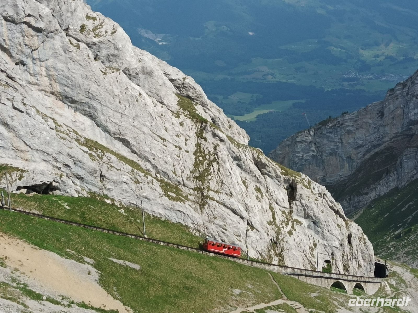 Viel zu schnell ist die Zeit in Zermatt vergangen. Wir reisen heute weiter. Unsere Koffer brauchen wir nur vor unser Zimmer stellen oder bringen ihn an die Rezeption, und können danach in Ruhe frühstücken. Das Personal des Hotels und unser Fahrer Roy kümmern sich um den Transport. Wir haben noch Zeit, um uns in Ruhe von Zermatt verabschieden zu können. Gegen 09.00 Uhr fahren wir mit der Bahn nach Täsch. Heute müssen die Koffer schon nach den Ausstiegsstellen für morgen geladen werden. Unser Ziel für heute ist der Pilatus und dafür benötigen wir nur eine kleine Tasche. Nach 09.00 Uhr beginnen wir unsere Fahrt mit dem Bus. Wir fahren noch einmal einen Teil der Glacier Express-Strecke ab. Durch das Matter-und Rohnetal (Goms). Ein Erlebnis ist die Fahrt über den Grimselpass (2165m) immer mit Blick auf die Furkastraße und dem „Rhonegletscher". Bei der Fahrt ins Tal haben wir den Blick auf die Anlagen der Kraftwerke Oberhasli AG. Hier stoppen wir auch noch einmal um den guten schweizer Käse zu kaufen. Probieren dürfen wir den Käse auch und mit einem guten schweizer Weißwein stoßen wir auf die Reise und Eberhardt-Travel an. Danach fahren wir weiter. Unser Ziel für heute ist der Pilatus(Hausberg von Luzern und bekanntester Aussichtspunkt der Zentralschweiz). In Alpnachstad angekommen, haben wir die Chance eine Bahn zeitiger zu fahren. Es bleibt noch Zeit zu fotografieren und wir können uns in Ruhe auf die Fahrt mit der steilsten Zahnradbahn der Welt freuen. Die Fahrt dauert 30 min dabei erleben wir eine Steigung bis 48%. Auf der 4,6 km langen Strecke sehen wir die unterschiedlichen Vegetationsstufen und haben auch eine gute Sicht auf den Vierwaldstättersee.