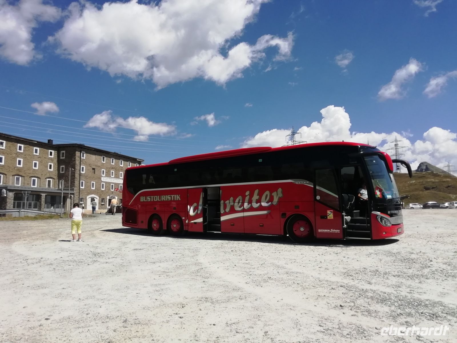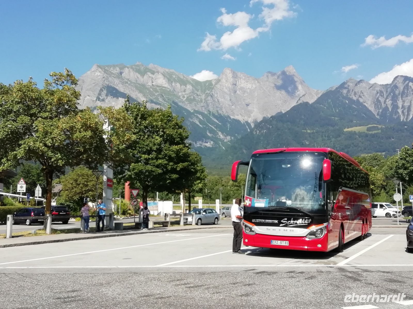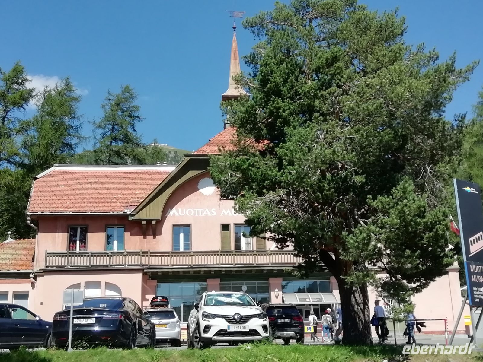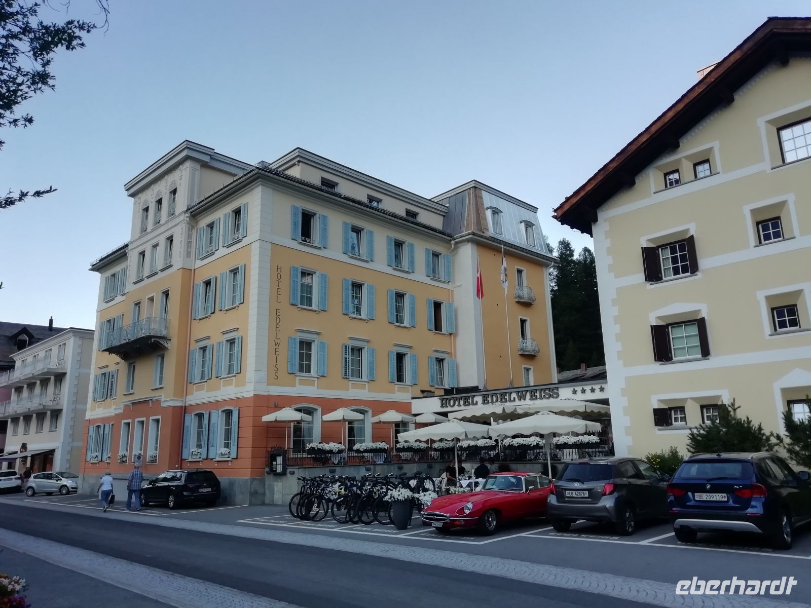 Pünktlich 6 Uhr am Morgen starten die ersten Eberhardt-Reisegäste im 5-Sterne-Bus in Dresden zur Premium-Reise in die Schweiz. In Kesselsdorf, Chemnitz und Zwickau steigen weitere Gäste zu. Trotz Ferienbeginn in Sachsen kommen wir gut voran. Gegen Mittag sind wir in Ansbach. Mit 20 Gästen ist unsere Reisegruppe hier nun komplett. Es geht vorbei an Nürnberg und Ulm Richtung Bodensee. Durch den Pfändertunnel erreichen wir Österreich und fahren bald danach am Grenzübergang Diepoldsau in die Schweiz. Hier machen wir eine letzte Pause an der Raststätte „Heidiland“. Wir kommen durch Chur, Thusis und Tiefencastel. Dann „klettern“ wir hinauf zum Julierpass. Hier legen wir einen Fotostopp ein, um das Passschild zu fotografieren. Nun trennen uns nur noch wenige Kilometer von Sils-Maria, wo sich unser 4-Sterne-Hotel „Edelweiß“ befindet. Es wurde bereits 1876 gegründet und ist noch ein Hotel der „guten alten Schule“. Schnell sind die Zimmer bezogen. Diese präsentieren sich im typisch Bündner Stil mit Arvenholzmöbeln. Als Willkommensgruß erhalten wir eine kleine Engadiner Nusstorte. Dann erwartet man uns zum 5-Gang-Menü im benachbarten Hotel „Post“. Bei Vorspeise, Suppe, Hauptgang und Dessert können wir sogar noch aus zwei verschiedenen Angeboten wählen.