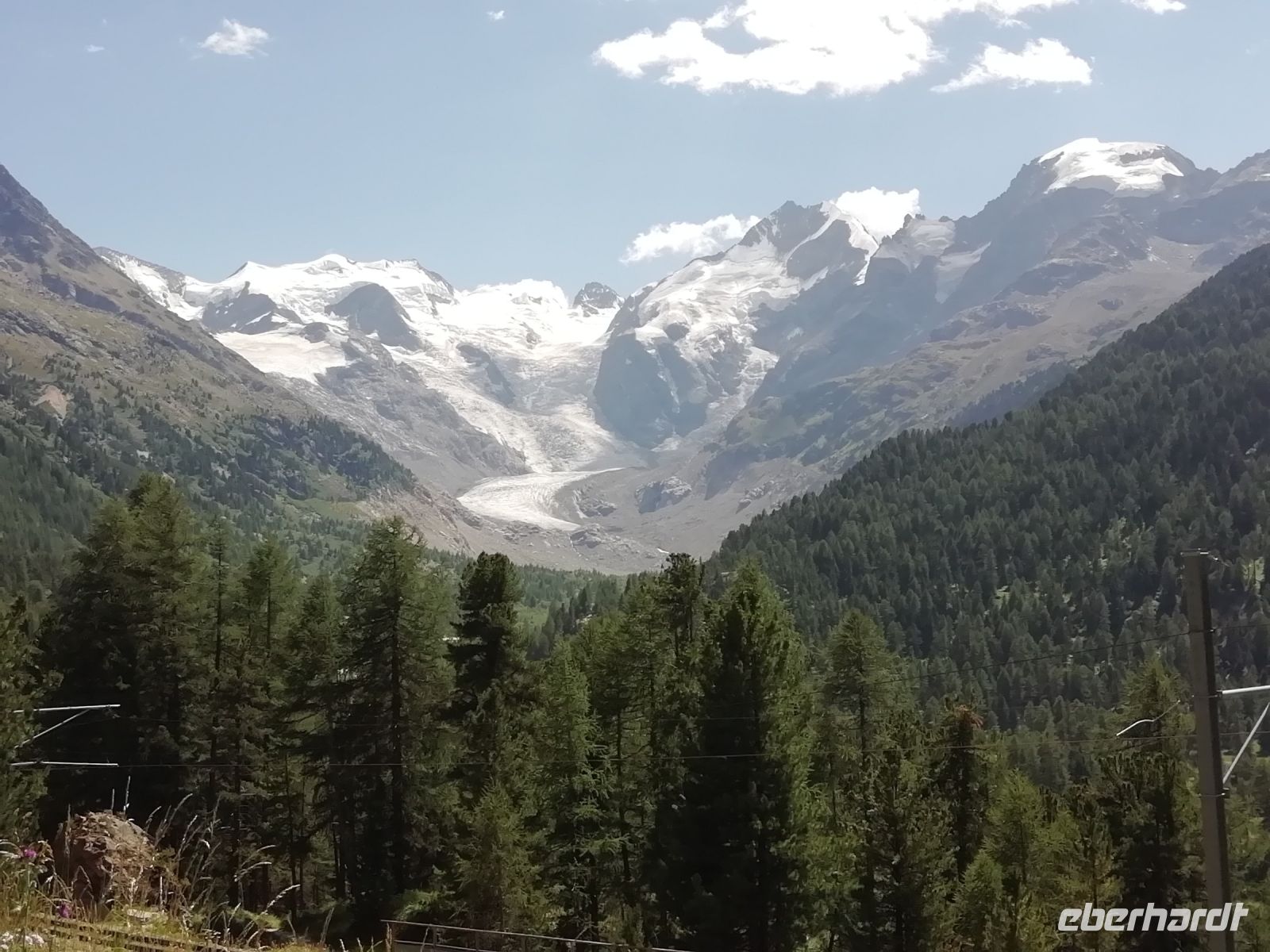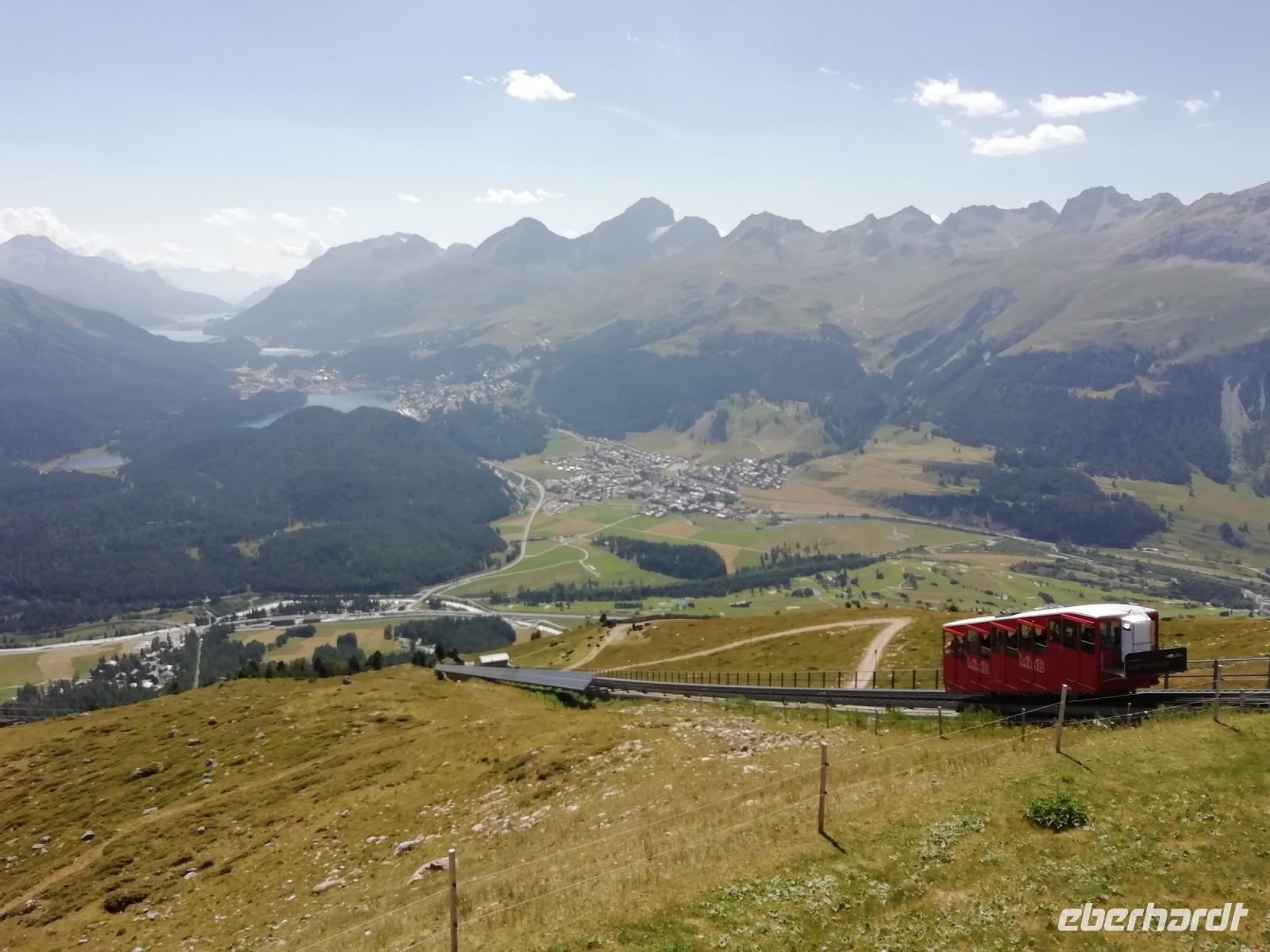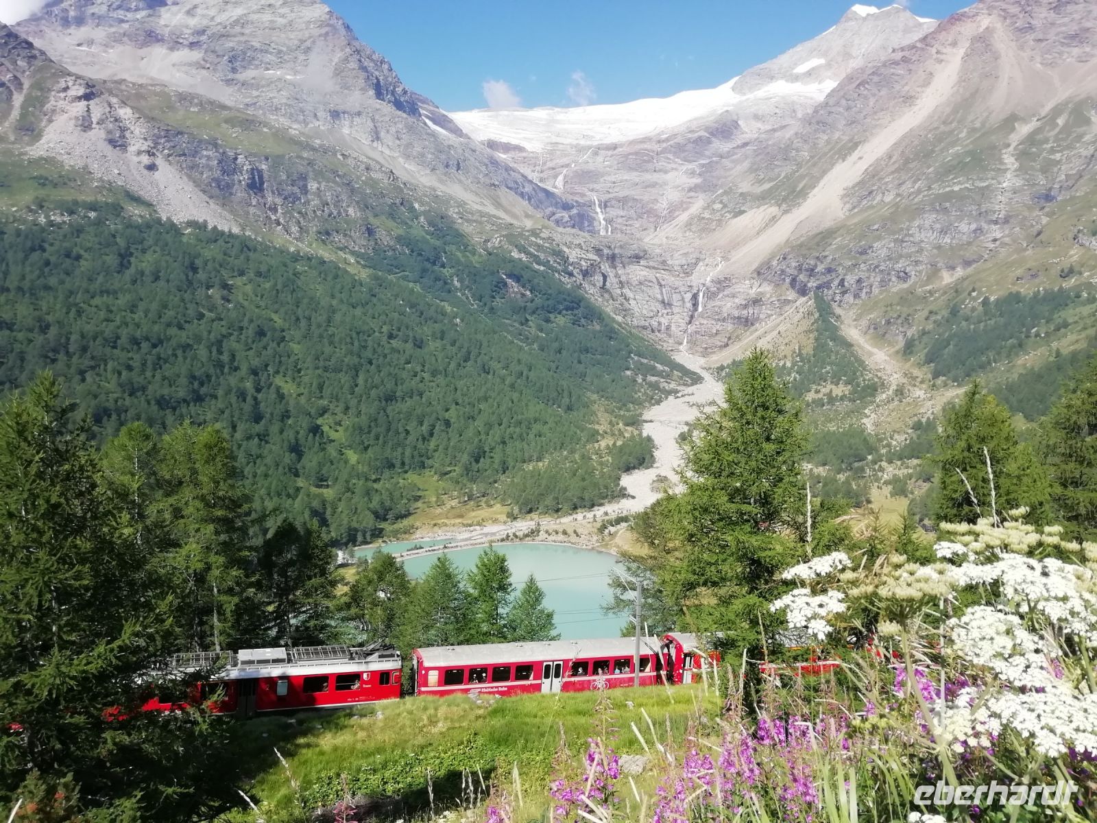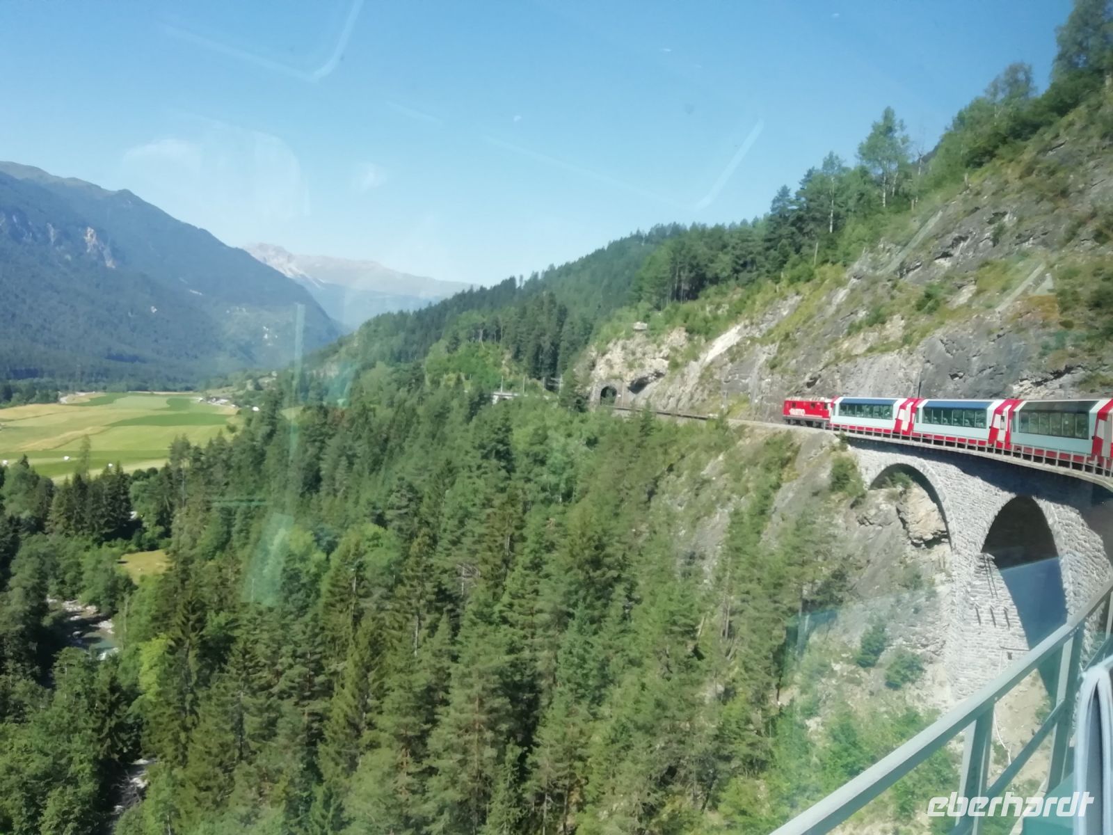 Auch heute geht es mit dem Bus und dem fröhlichen „Guten-Morgen-Lied“ nach dem Frühstück wieder nach St. Moritz. Es steht unsere erste Bahnfahrt auf dem Programm. Im Bernina-Express können wir unsere reservierten Plätze im Panoramawagen der 1. Klasse einnehmen. Pünktlich auf die Minute fährt der Zug ab. Die Berninastrecke gilt als Meisterwerk der Ingenieurbaukunst. Über Pontresina geht es mit schönem Blick auf den Morteratschgletscher hinauf zur Station Ospizio Bernina. Mit 2253 m.ü.M. ist es die höchstgelegene Station auf dem Netz der Rhätischen Bahn. Wir erhalten als Andenken an diese Fahrt ein besonders Souvenir: einen kleinen Bernina-Waggon mit süßer Füllung. Vorbei am Aussichtspunkt Alp Grüm, wo wir für einen Fotostopp aussteigen, fahren wir weiter durch das Puschlav, drehen mit dem Zug eine Schleife auf dem Kreisviadukt von Brusio und erreichen schließlich Tirano in Italien. Hier empfangen uns fast tropische Temperaturen. Deshalb lassen sich die meisten Gäste erstmal ein Eis schmecken. Einige laufen zur Basilika Madonna di Tirano mit den reich verzierten Fresken und der aus Kiefernholz geschnitzten Orgel, andere machen einen Spaziergang durch die Altstadt. Dann fährt uns Frank mit dem Bus wieder zurück. Dabei können wir vieles, was wir vom Zug aus gesehen haben, nun aus einer anderen Perspektive betrachten. Am Kreisviadukt von Brusio, auf dem Berninapass und am Morteratschgletscher machen wir einen Fotostopp. Da wir mit der Gästekarte einige Bergbahnen kostenlos nutzen können, halten wir an der Talstation vom Punt Muragl an. Mit der Standseilbahn fahren wir hinauf auf eine Höhe von 2454 m. Hier unternehmen wir einen kleinen Spaziergang oder sonnen uns in den Strandkörben.