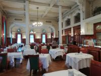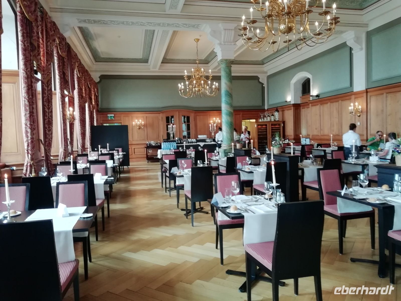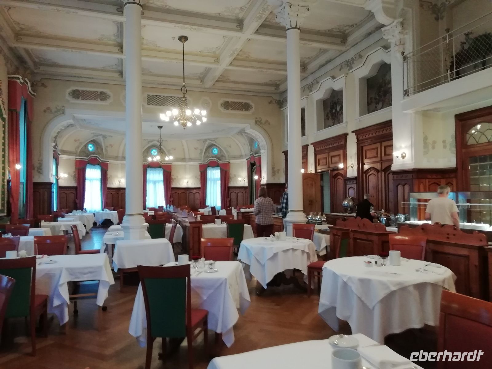 Zum Frühstück bedienen wir uns am Buffet im denkmalgeschützten Jugendstil-Speisesaal des Hotels. Dieser ist einzigartig im Engadin und bildet auch bei den kommenden Mahlzeiten einen stilvollen Rahmen.