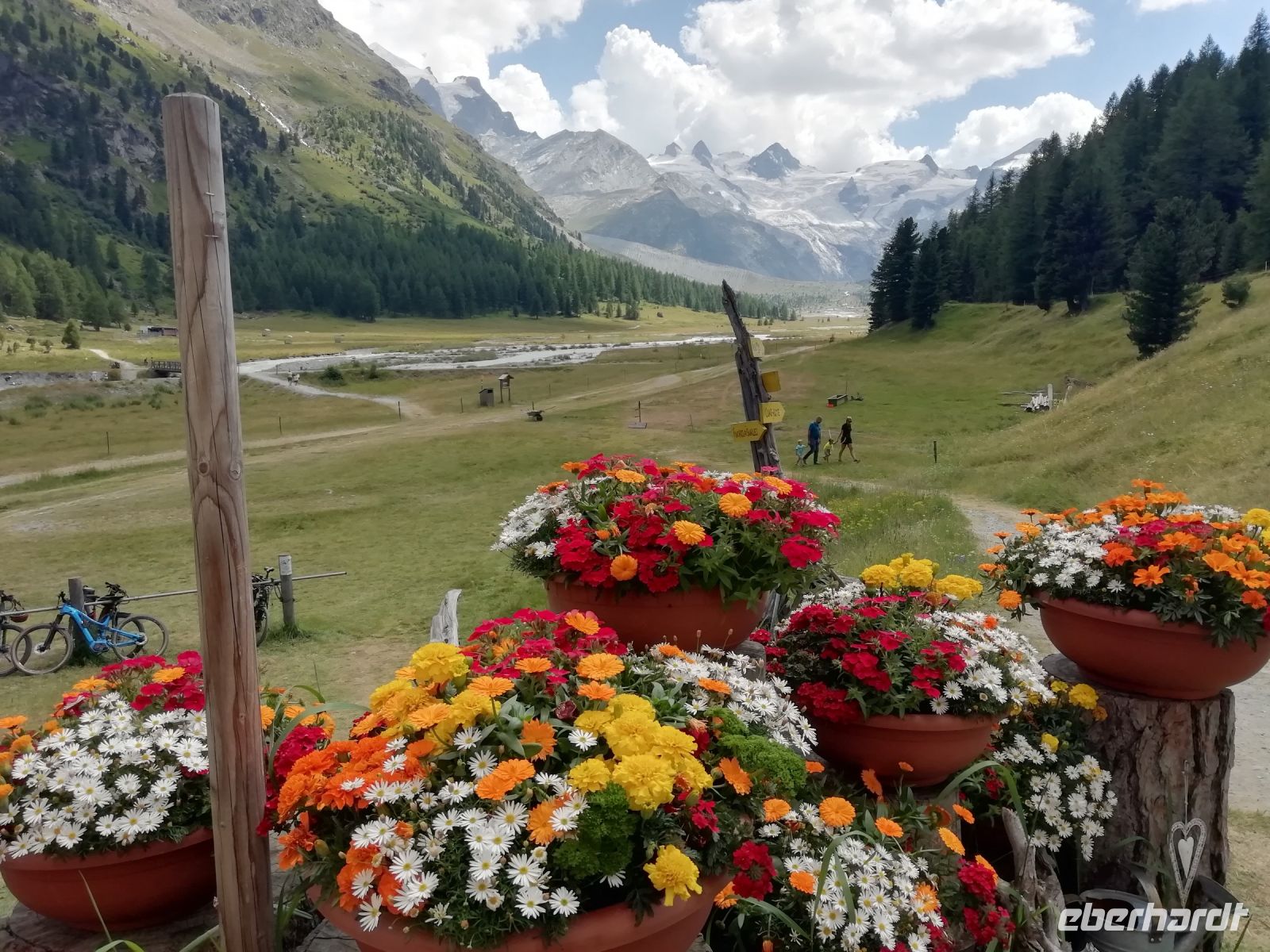 Nach dem Frühstück fahren die meisten Gäste mit der Bahn hinauf zum Gornergrat. Bereits während der 40minütigen Fahrt bietet sich uns immer wieder ein fantastischer Blick. Oben angekommen, genießen wir die Zeit auf dem Gipfel in der Sonne und können uns am unbeschreiblichen Panorama kaum satt sehen. Die Rundumsicht mit den beeindruckenden Gletschern, dem Kleinen Matterhorn und dem Monte-Rosa-Massiv ist einfach toll. Am meisten wird natürlich das Matterhorn fotografiert. In der neu eröffneten Erlebnisausstellung können wir dann das Matterhorn nah ran zoomen, die Bergwelt zu allen vier Jahreszeiten erleben oder uns mit der 3-D-Brille auf einen Gleitschirmflug begeben. Bei der Talfahrt legen die meisten Gäste an der Station Rotenboden einen Halt ein, um zum Riffelsee zu gehen.