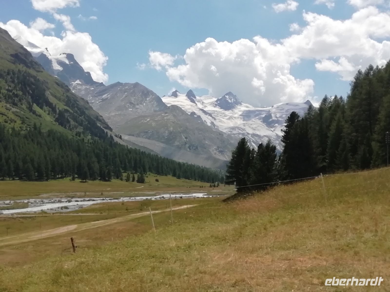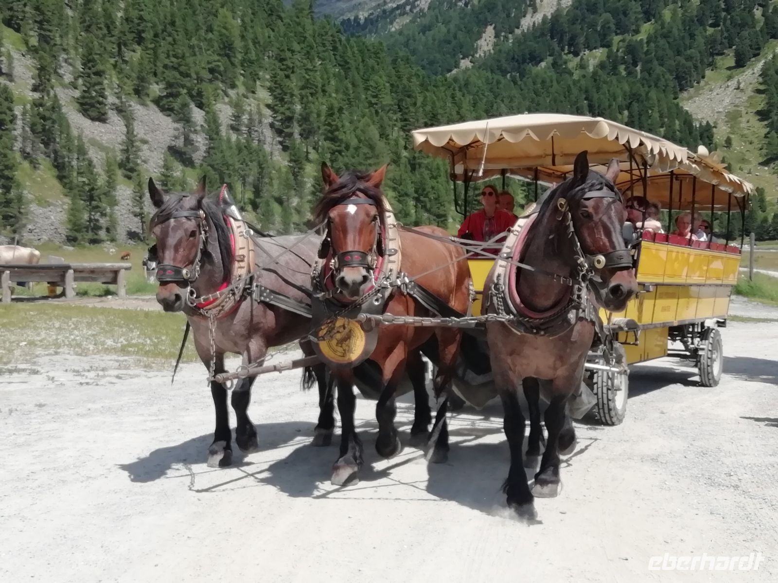 Danach bringt uns Frank mit dem Bus in den Nachbarort Pontresina. Nach einem Mittagessen am Bus geht es mit zwei Pferdekutschen ins wildromantische Roseggtal. Die 7 Kilometer lange Strecke führt durch ein Naturreservat für alpine Flora und Fauna. Heiß brennt die Sonne auf uns nieder. Am Ziel auf 2000 m Höhe erwartet uns ein wundervoller Blick auf den Rosegg-Gletscher. Wir unternehmen einen kleinen Spaziergang und machen eine Kaffeepause auf der Sonnenterrasse. Dann fahren wir mit 3 PS wieder zurück.