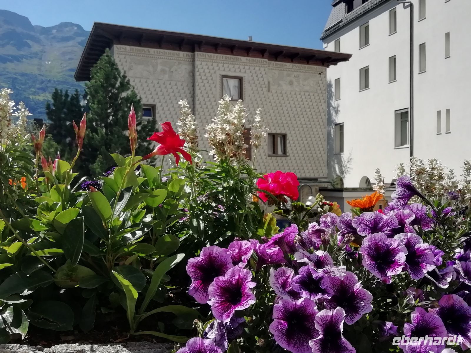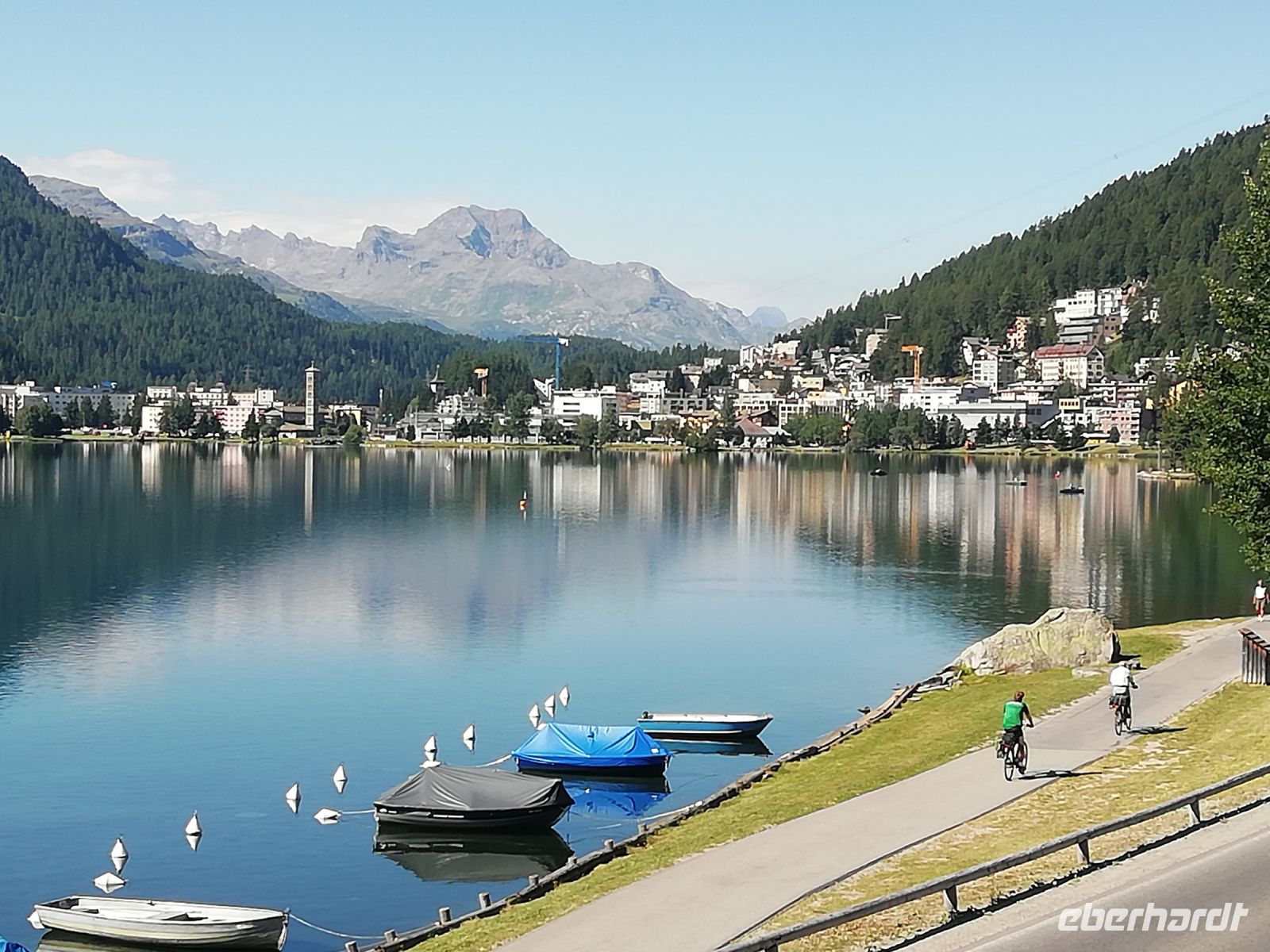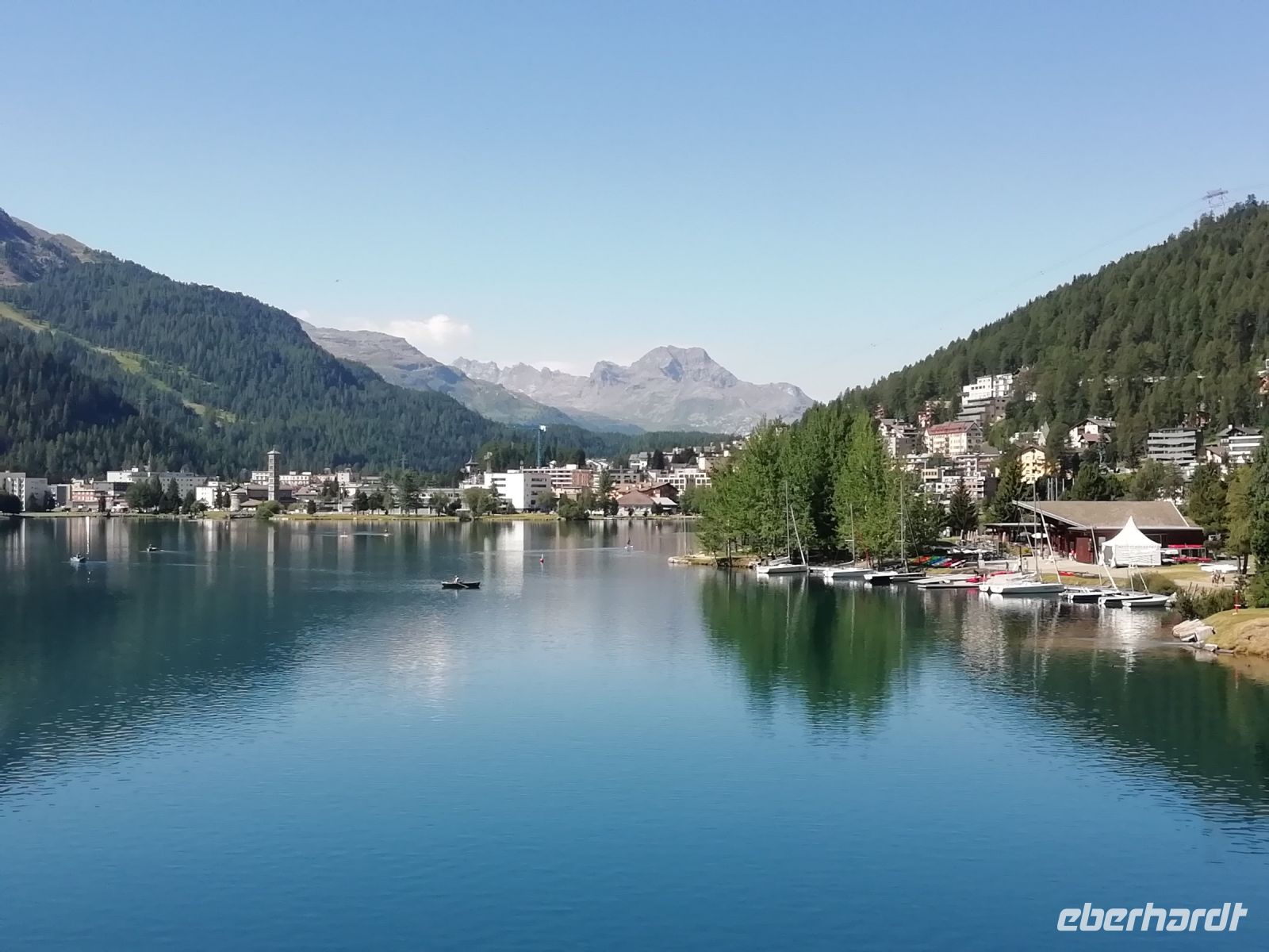 Unsere Fahrt führt uns weiter durch St. Motz Dorf, vorbei am Kulm-Hotel und am Wahrzeichen des Ortes, dem schiefen Turm. Nun geht es entlang der berühmten Bobbahn-Linie nach Celerina. Hier sehen wir zahlreiche typische Engadiner Häuser. Wieder am Bahnhof angekommen, verlassen wir den Bus, laufen durch das Parkhaus und genießen den Blick auf den St. Moritz-See, der im Winter dick zugefroren und so Austragungsort für das bekannteste Pferderennen der Schweiz und für den „Polo World Cup“ ist. Dann bringt uns die längste Rolltreppe der Schweiz hinauf ins Zentrum. Hier findet man zahlreiche Nobel-Boutiquen und Hotelpaläste. So kommen wir auch zum 5-Sterne-Hotel „Badrutts-Palace“. Wir schauen uns die ältesten Häuser des Dorfes sowie die Kirche an und beenden unseren Rundgang am Schulhausplatz. Es bleibt noch Zeit für individuelle Erkundungen oder einen Spaziergang am See.