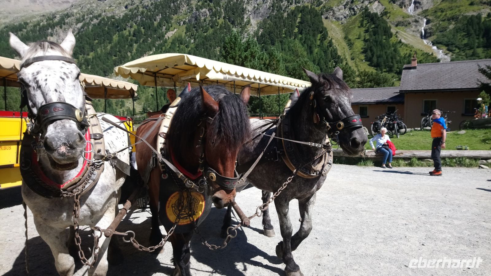 Nach Busanfahrt ging es am Nachmittag mit 3 PS auf Pferdekutschen von Wohlis Pferdeomnibus ab Pontresina durch das Rosegtal zum Hotel Roseg. Herrliche Landschaft, ausgezeichneter Blick auf den Roseg-Gletscher, tolle Gatronomie - alles perfekt.