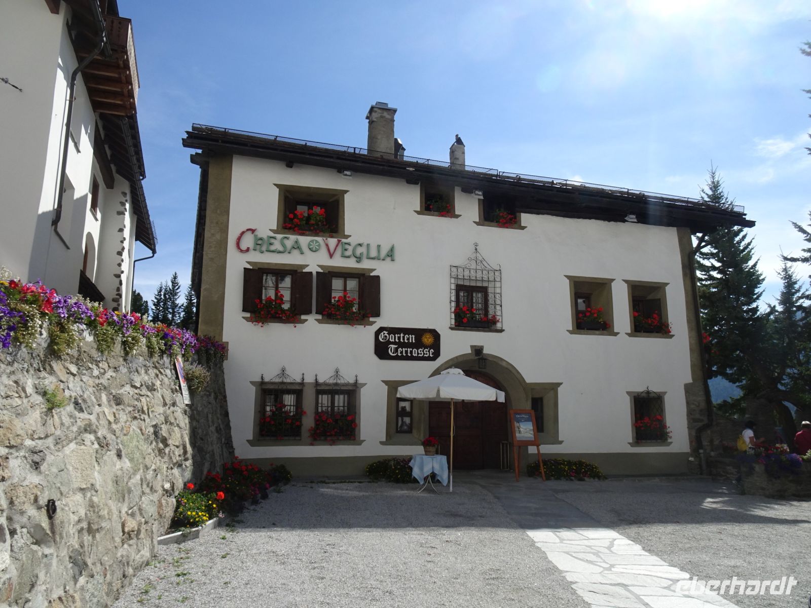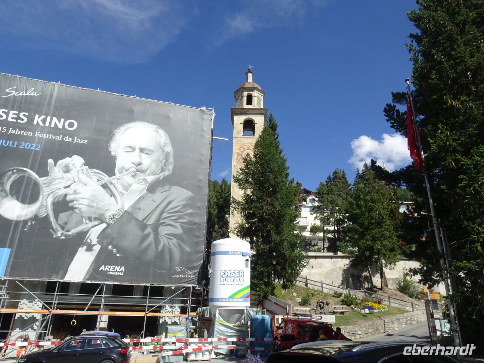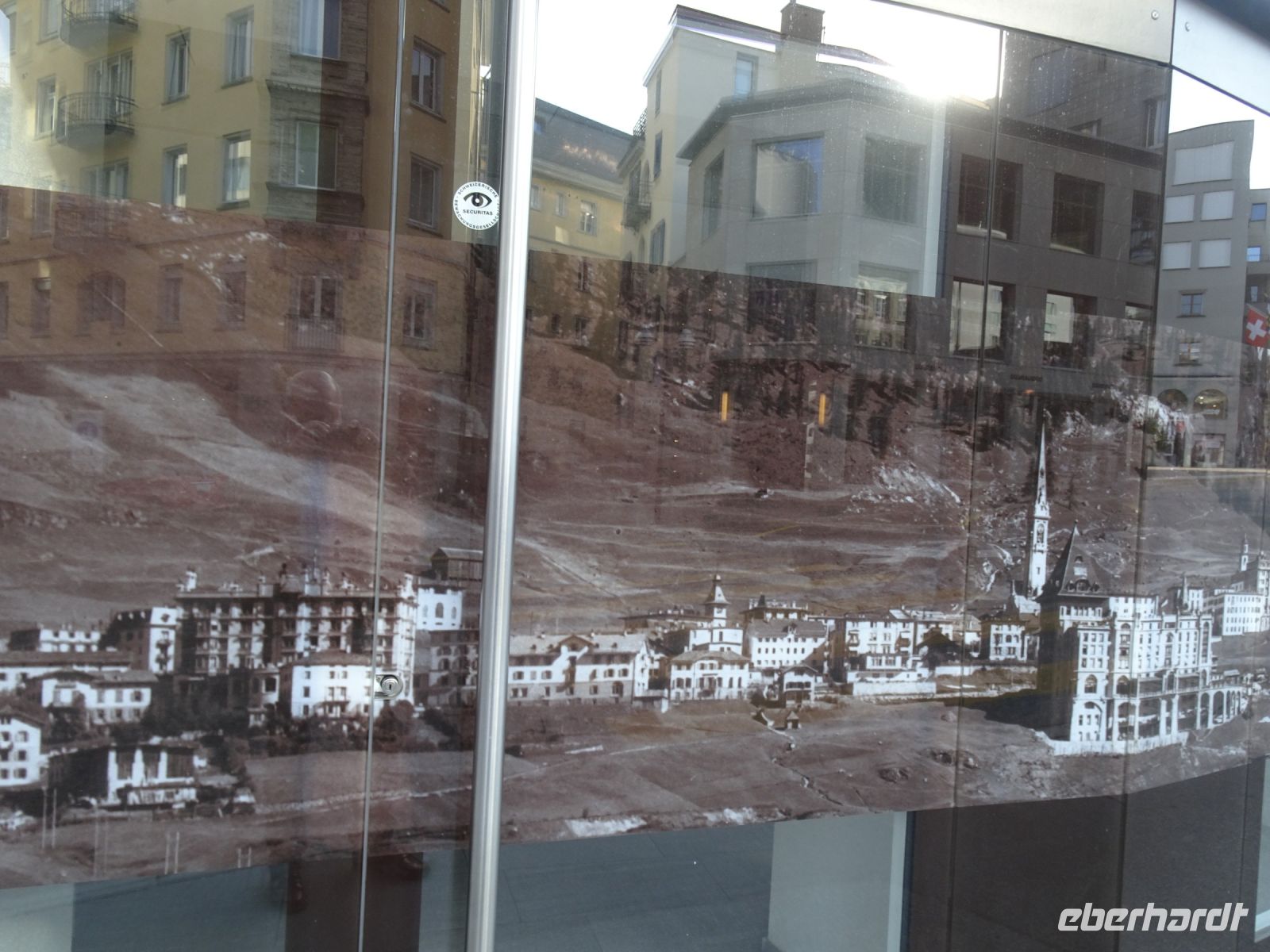 Vorbei an den Wohnlagen der internationalen Prominenz fuhren wir zurück zum Hotel und anschließend weiter zu Fuß durch St. Moritz Dorf. Bis zum Schiefen Turm ging unser Spaziergang. Anschließend hatten wir Freizeit, manche ließen sich einen Kaffee in der traditionsreichen Confiserie Hanselmann mit Blick auf den See schmecken.