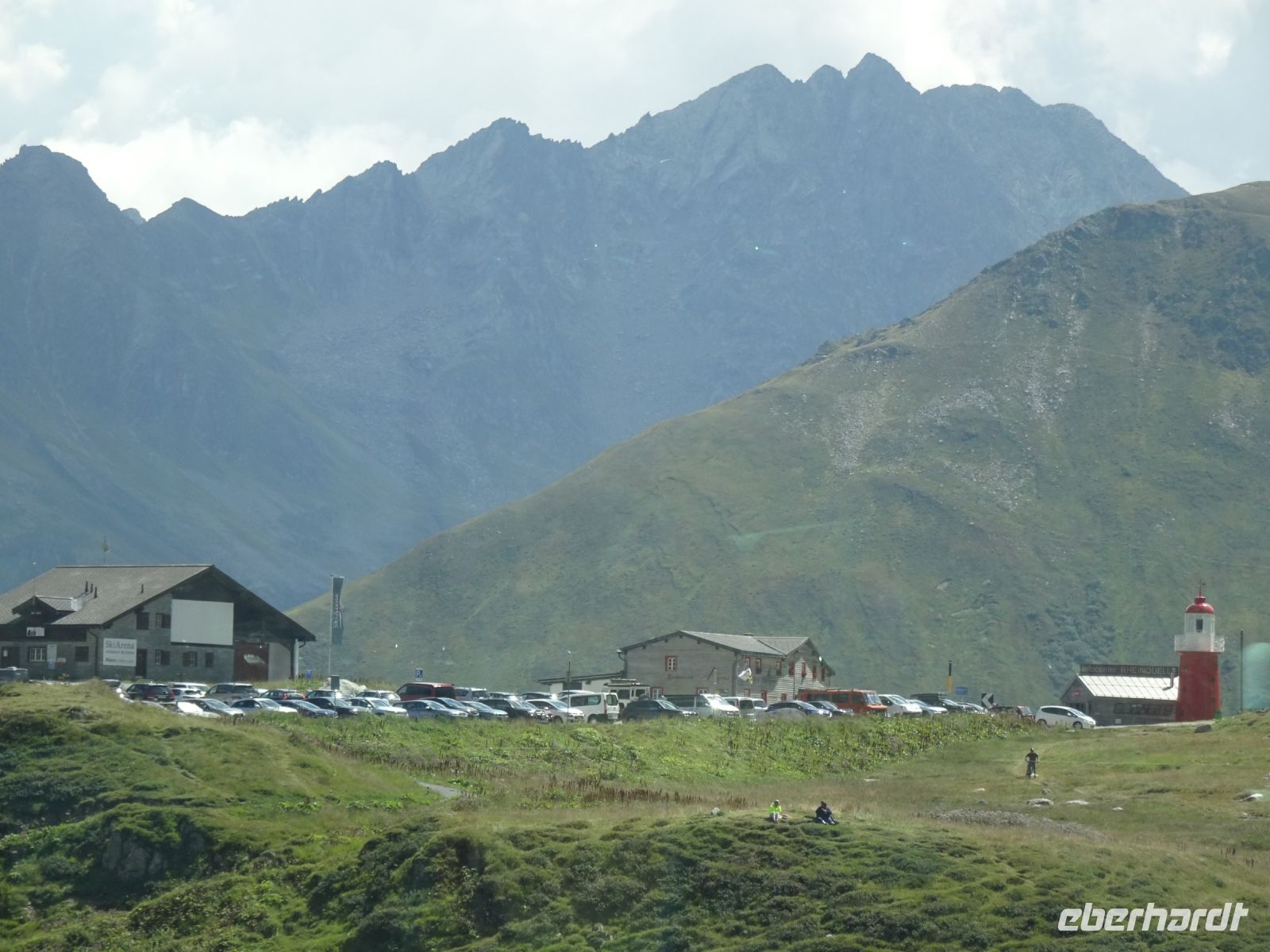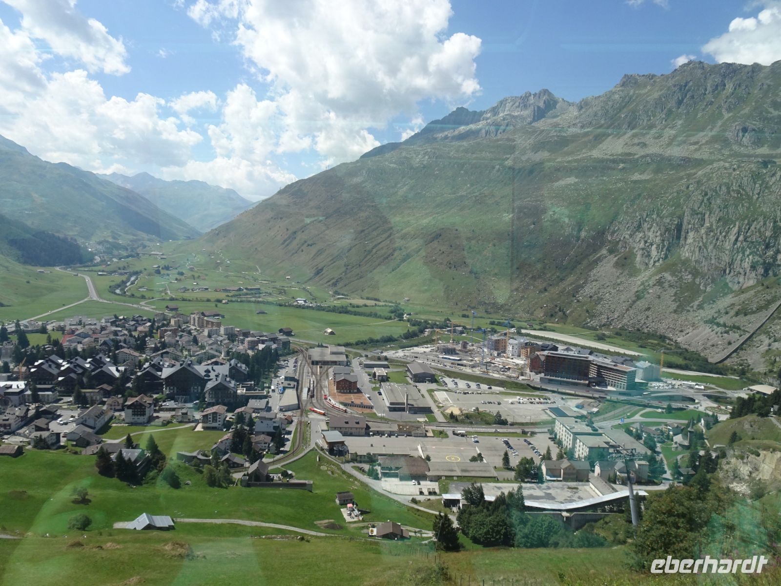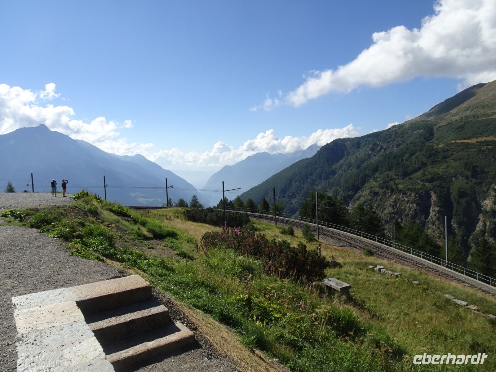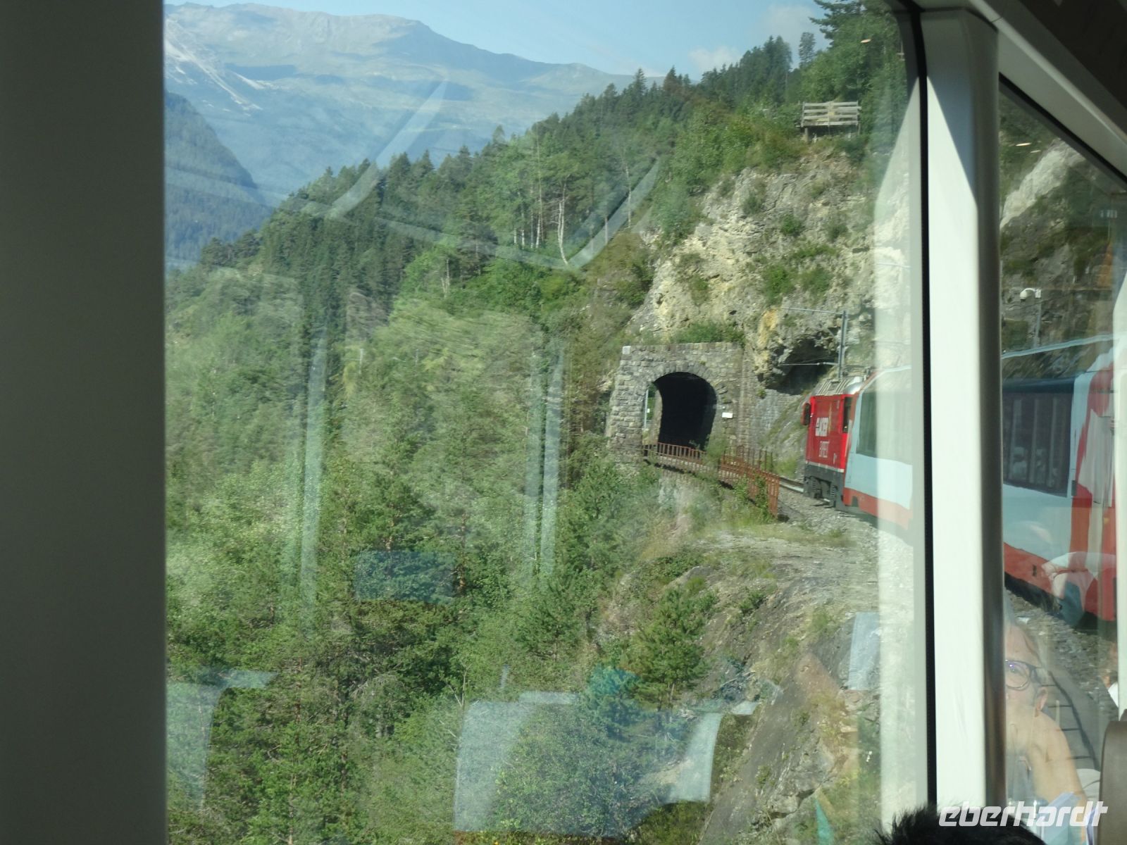 Trotz eines Halts in Thusis ließen wir die dort auf dem Bahnsteig ausharrende "Wartende" sitzen. Vorbei am Zusammenfluss von Vorder- und Hinterrhein bei Reichenau ging es anschließend durch die Rheinschlucht bei Flims ("Grand Canyon der Schweiz") vorbei an Disentis zum Oberalppass - und das teilweise mit Zahnradantrieb auf Grund der Steigung. Den Leuchtturm hier in der Nähe der Rheinquelle sahen wir kurz, leider kein Fotostopp, da auch die Schweizer Bahn mit leichten Verspätungen zu kämpfen hatte. Steiler Abstieg nach Andermatt im Kanton Uri, hoch über dem Gotthardtunnel tief unter uns im Berg - eine hochinteressante Strecke. Und dann weiter durch den über 11 km langen Furkabasistunnel in das Goms und entlang der in der Nähe des Furkapasses entspringenden Rhone bis zur Stadt Brig am Simplon. Und das alles in der ersten Klasse in einem prächtigen Panoramawagen mit bester kulinarischer Betreuung. Für uns gab es einen schmackhaften Tagesteller oder auch ein vegetarisches Gericht. Und selbstverständlich beste Getränke!