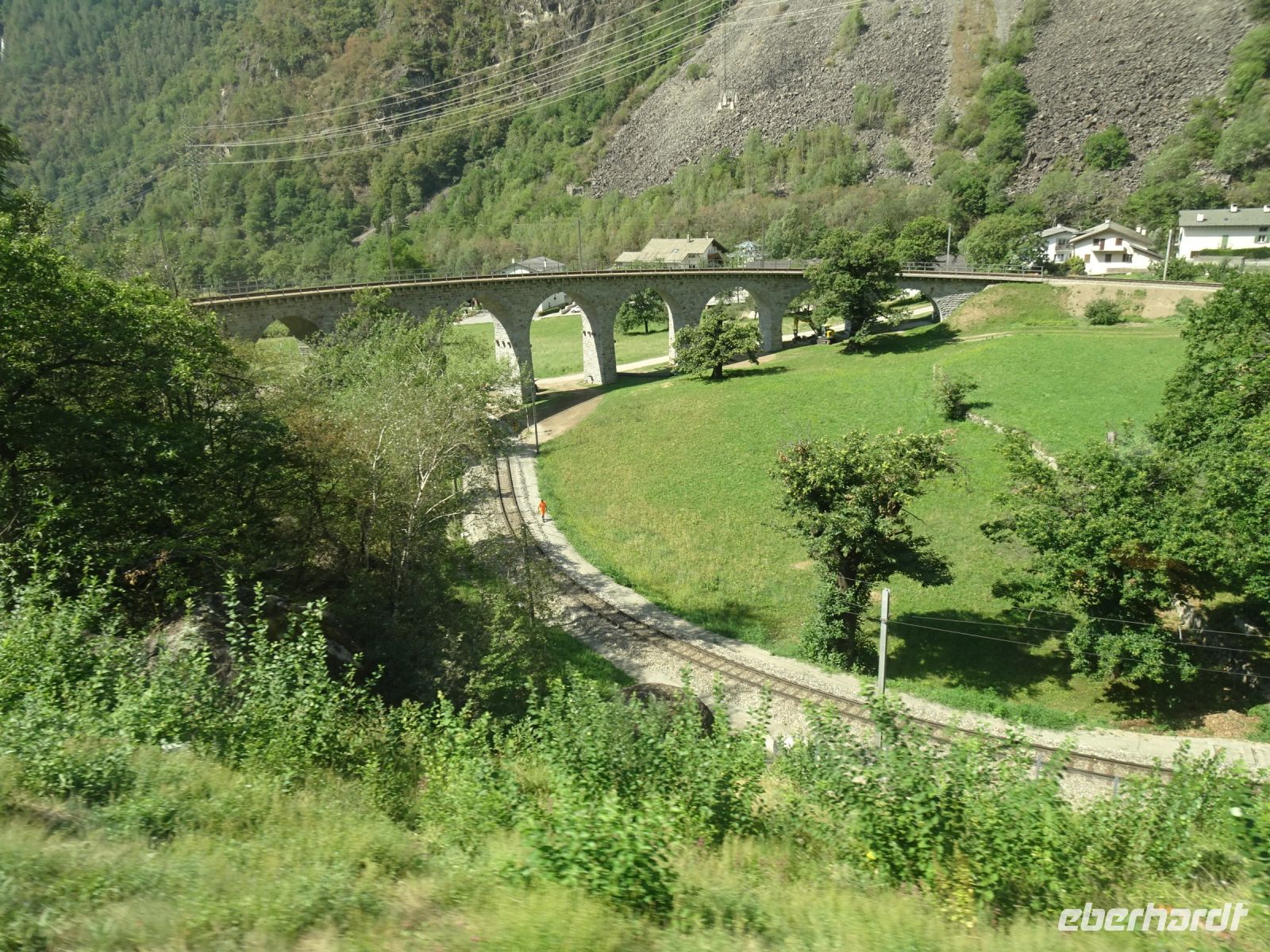Teilweise nutzt der Bernina-Express die reguläre Straße als Fahrweg. Achtung - wir kommen! Dann der Kreisviadukt von Brusio - eine technische Meisterleistung und ein attraktives Fotomotiv. Als kleine Aufmerksamkeit wurde uns im Express ein Lindt-Schokoladenzug und Kräutertee aus dem Puschlav gereicht. Viele haben diese "Last" gleich "entladen".