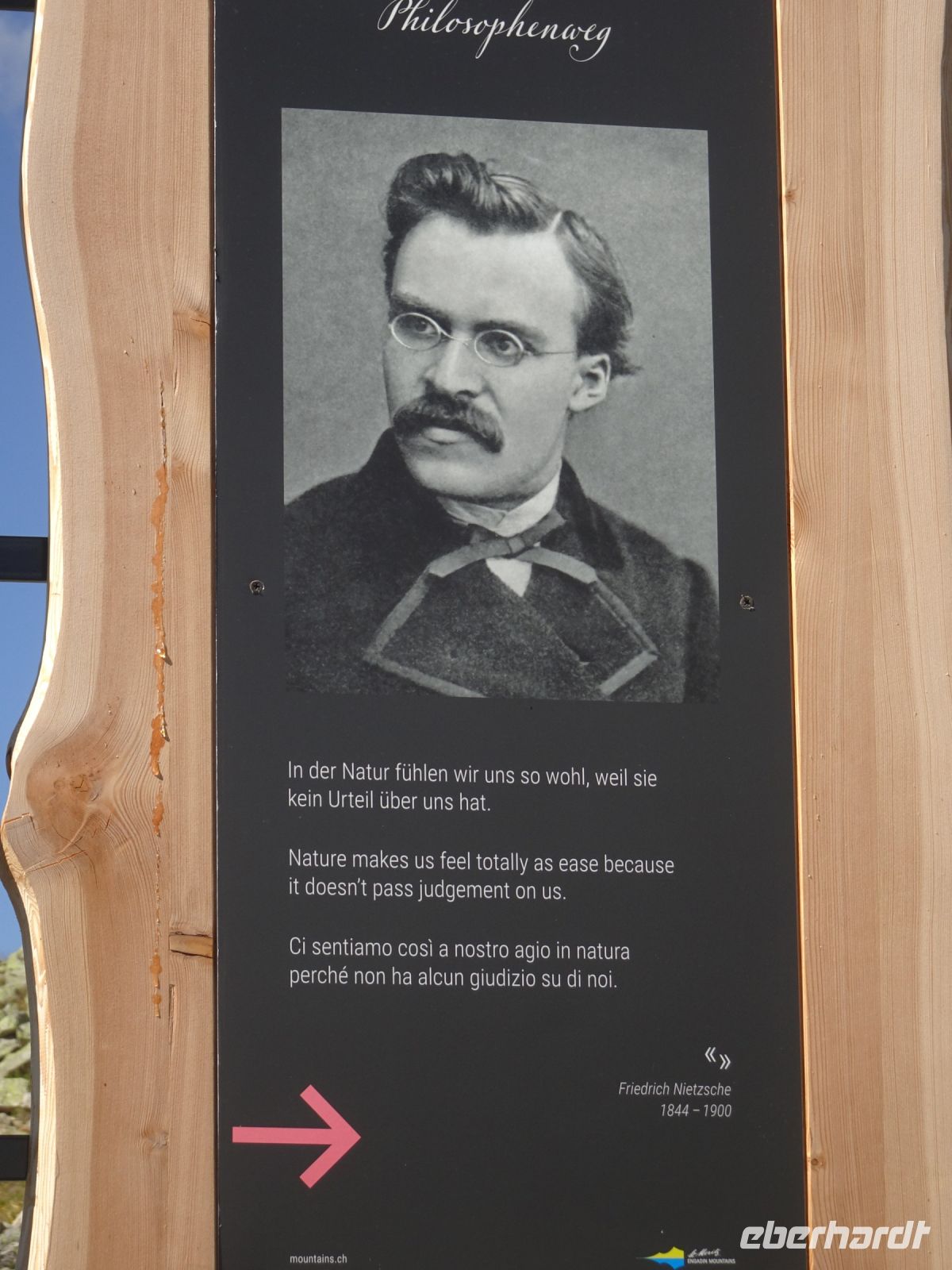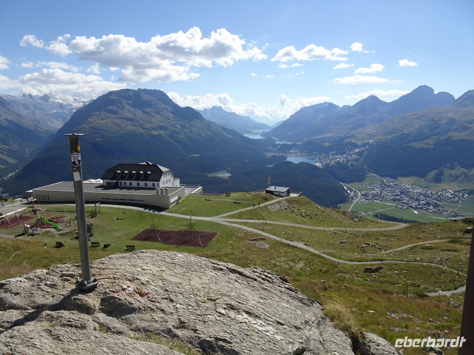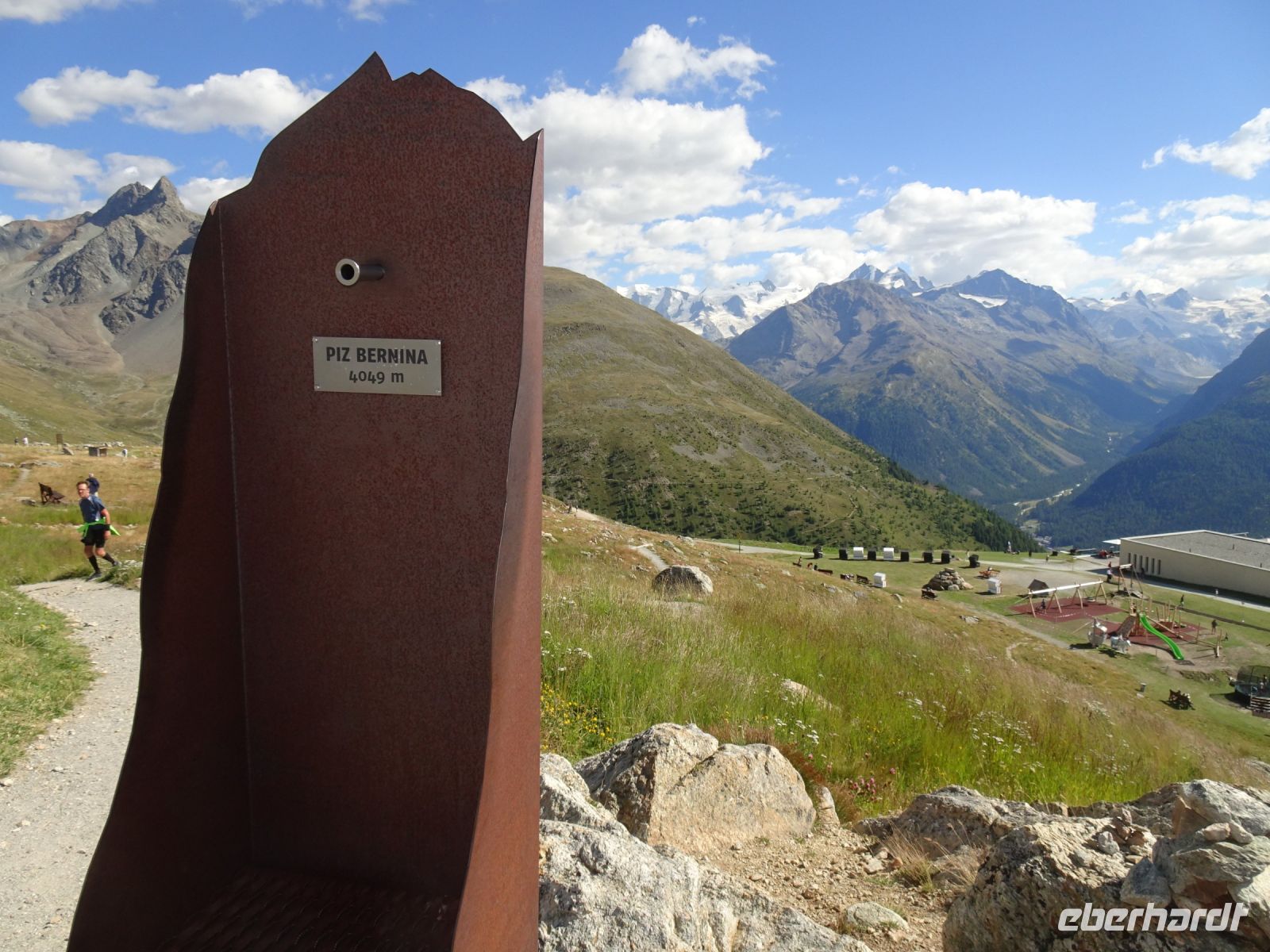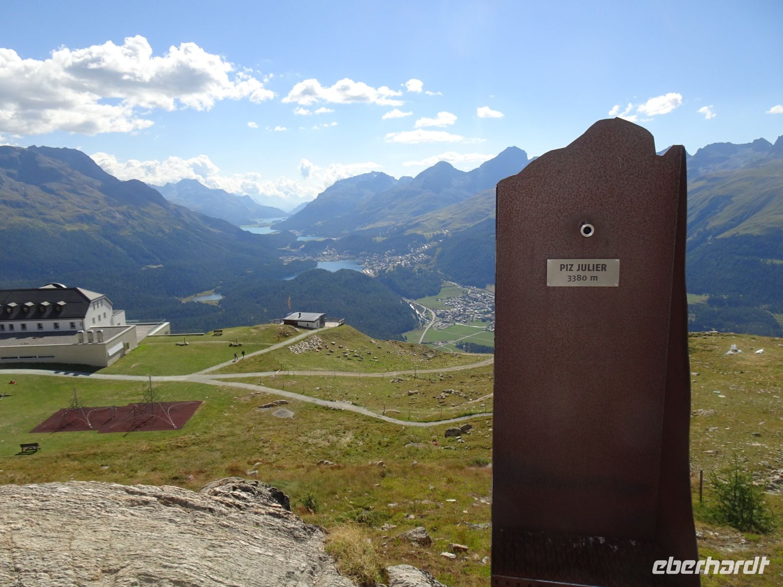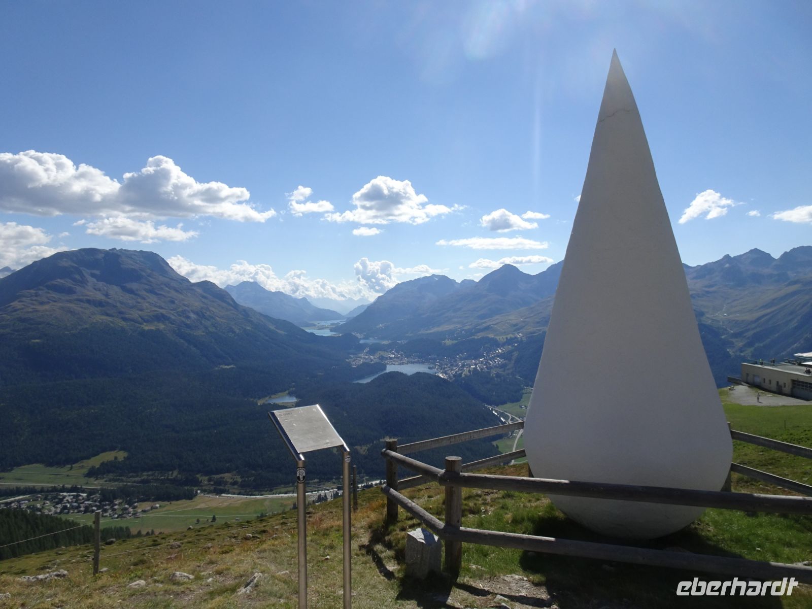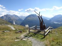 Wir hatten Glück - für uns gab es eine Sonderfahrt. Mit dem Philosophenweg, den auch Friedrich Nietzsche beging, und einigen Kunstwerken ein prächtiger Aussichtspunkt auf St. Moritz und die Seen des Oberengadin. Aber auch die Kunstwerke der Konditoren ließen sich einige Reisegäste nicht entgehen - bei einem Blick auf die Berge, wie z. B. Piz Bernina und Piz Julier.