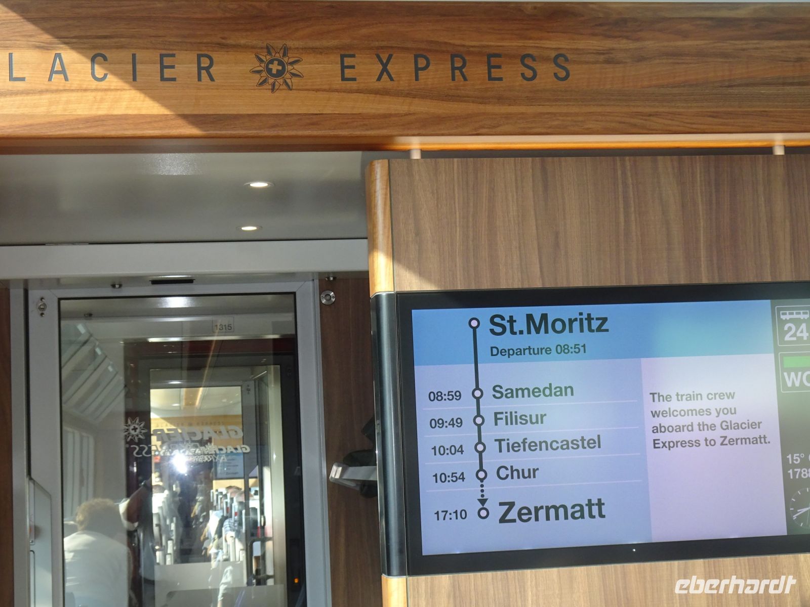 Wir haben sehr gut gefrühstückt. Nach einem kurzen Fußmarsch zum Bahnhof St. Moritz bestiegen wir unseren Erste Klasse Panoramawagen des Bernina-Express nach Tirano.