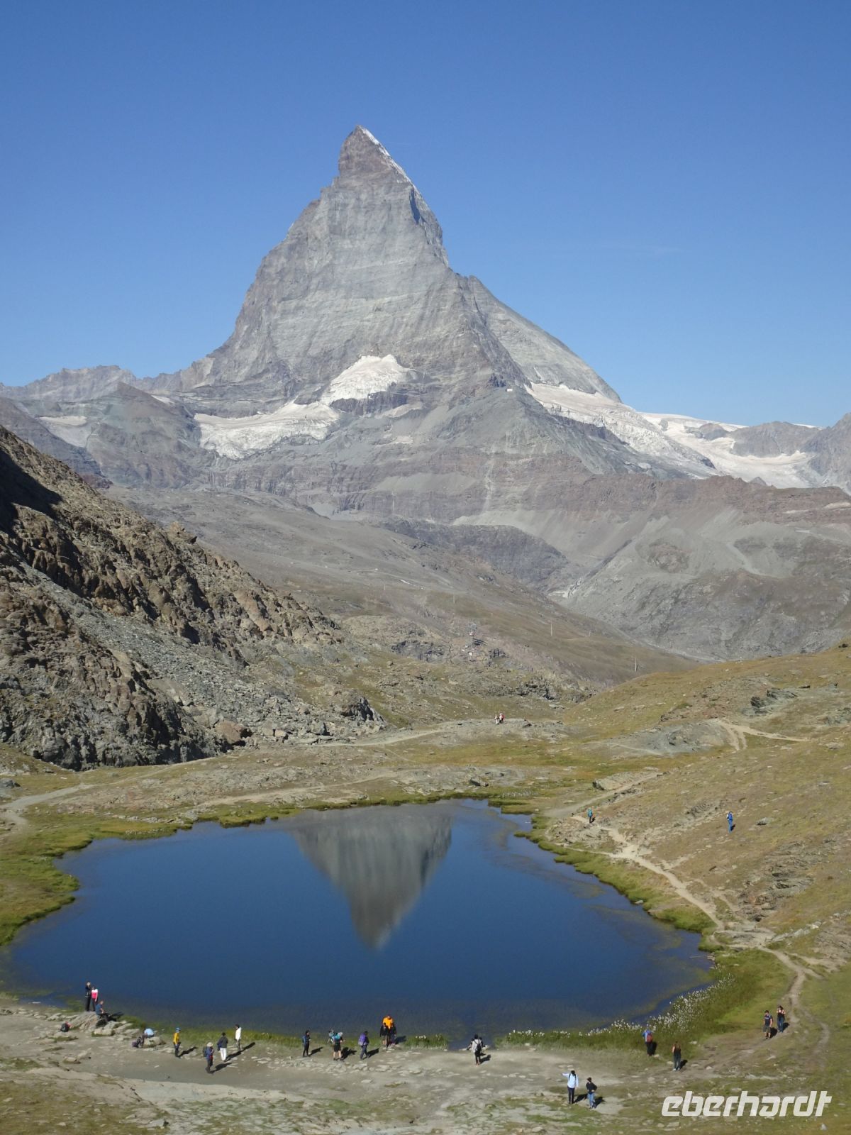 Es war prächtiges Wetter angekündigt, und so entschloss sich die überwiegende Zahl der Reisegäste für einen Ausflug auf das Gornergrat mit der Gornergratbahn. Da das Hotel unmittelbar neben der Talstation lag, konnten wir bereits um 9:12 Uhr starten. Zwischenstopp Rotenboden: wer wollte, konnte bis zum Riffelsee absteigen, um hier die berühmte Matterhornspiegelung zu erleben. Die Oberfläche war einigermaßen ruhig, also beste Fotomotive. Danach ging es weiter zum Gornergrat. Nach kurzen Erläuterungen zu möglichen Aktivitäten unternahm jeder seine eigene Tour.