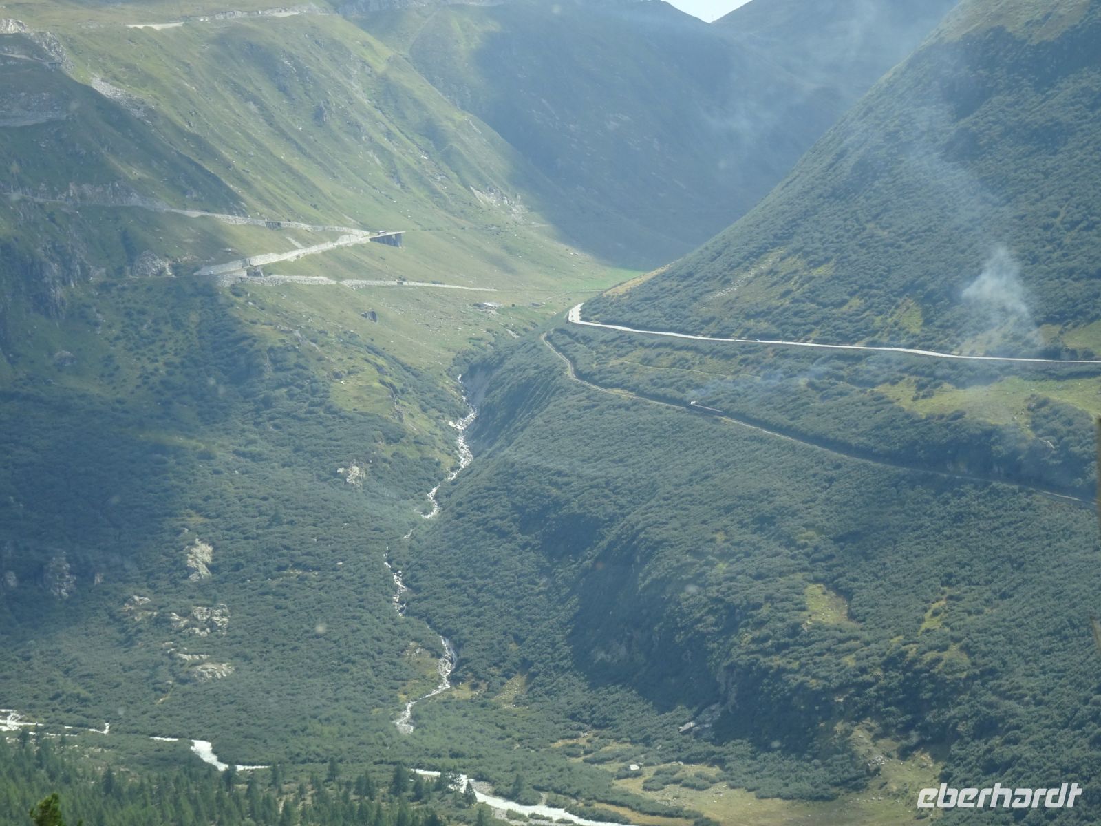 Durch das Mattertal weiter in das Rhonetal, vorbei an der hoch oben liegenden Aletscharena mit der Talstation Betten ging es durch das Goms. Bei der Auffahrt zum Grimselpass sahen wir verdächtige Rauchwolken - ein Zug der privaten Furkadampfbahn schnaufte hoch zum Furkapass - ein beeindruckender Anblick.