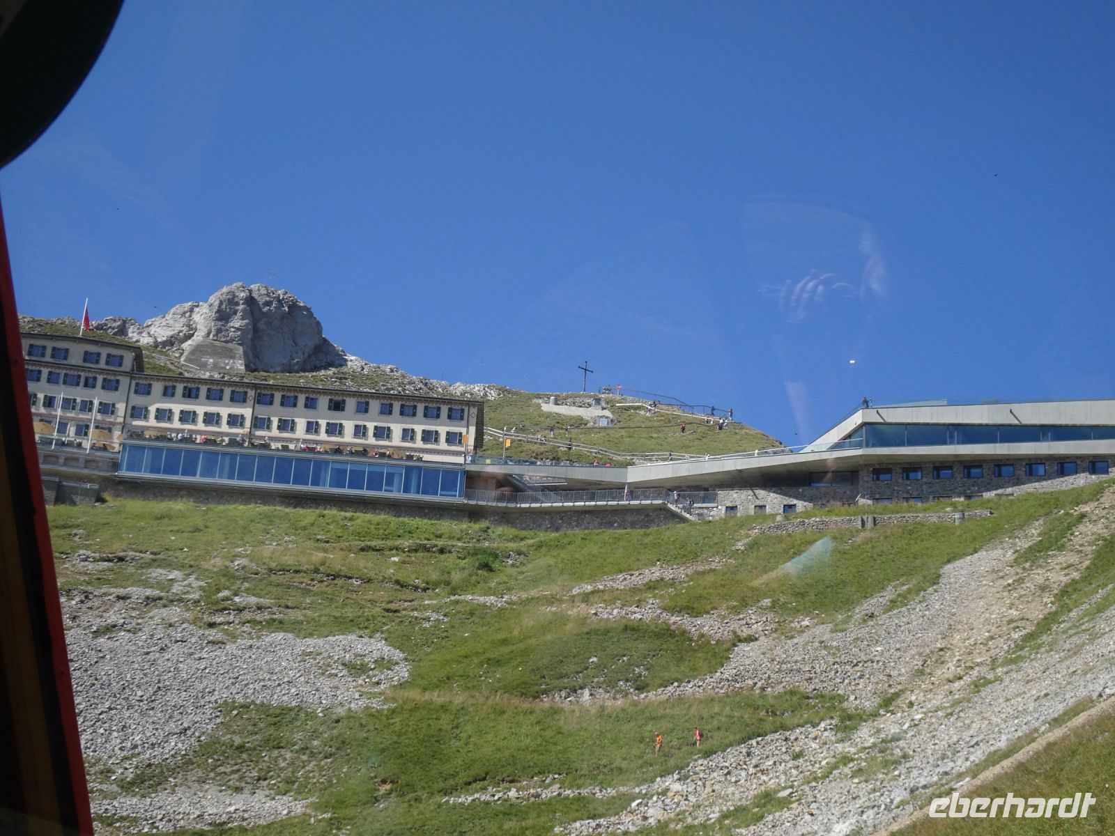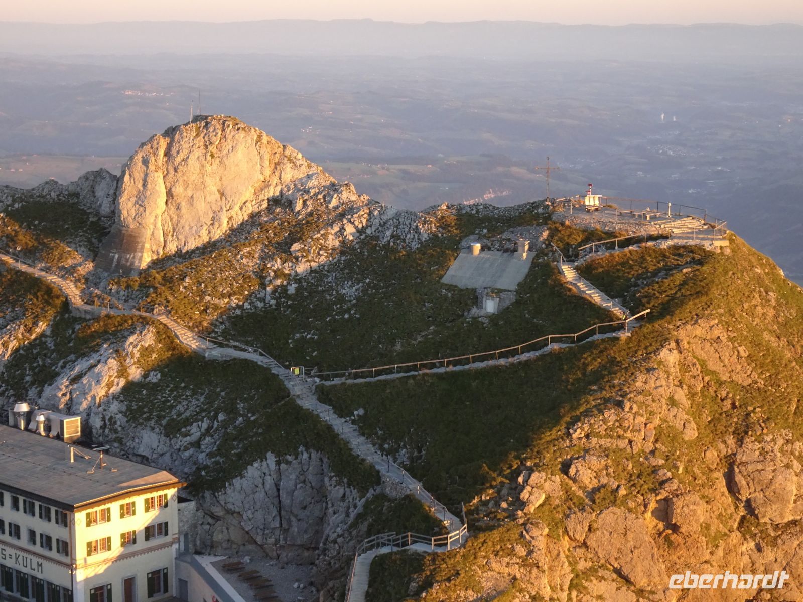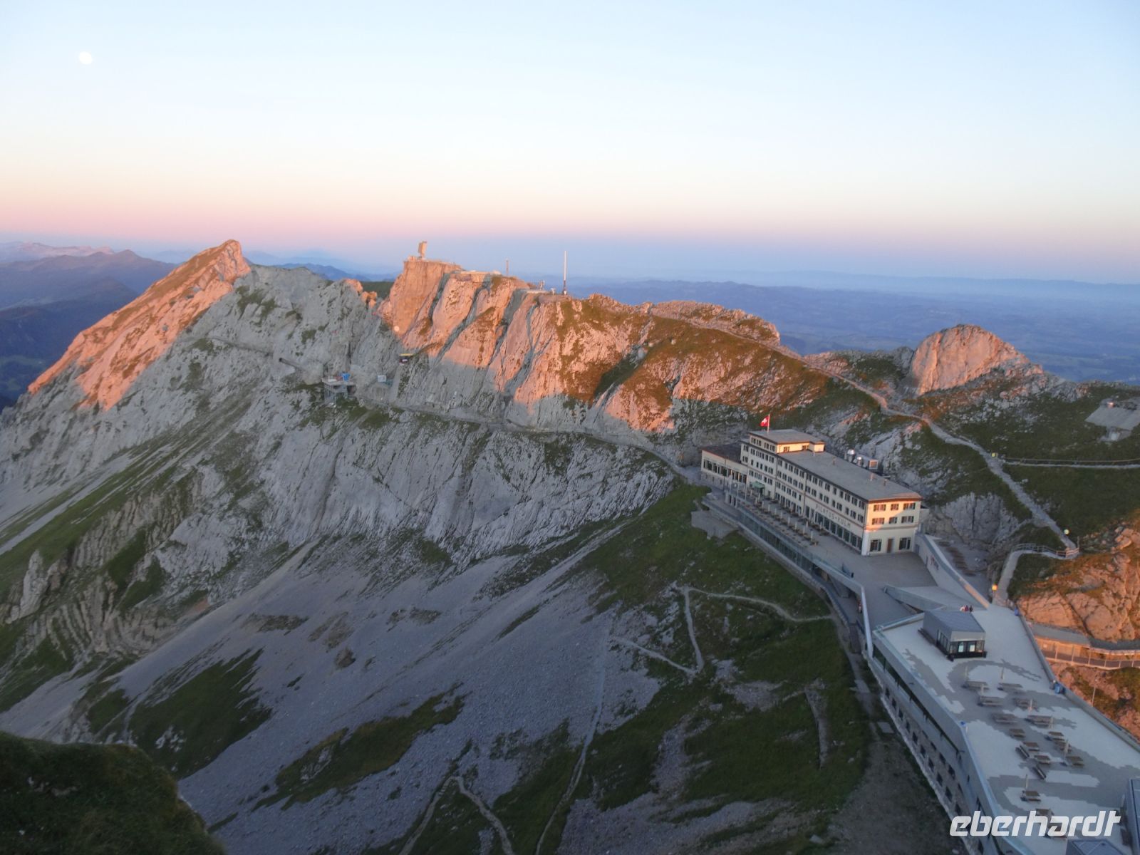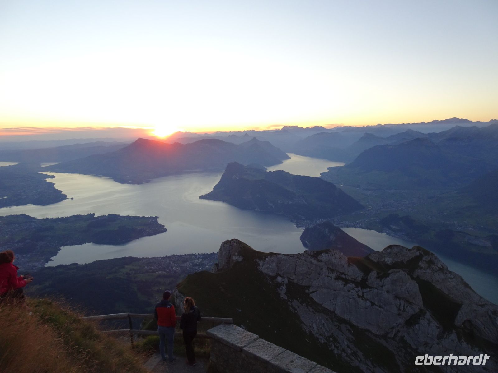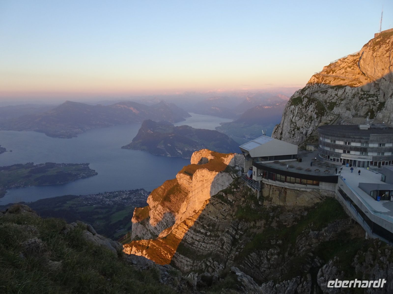 Sonnenaufgang 6:10 Uhr - einige beobachteten dies von ihrem Zimmer aus. Da das Hotel rund gebaut wurde, hatten alle beste Aussichten. Auf dem "Esel" selbst zelebrierten junge Leute eien Sonnenaufgangsparty - klasse Idee und bei klarer Sicht einmalig. Selbst bis zur Gipfelgruppe der Berner Alpen mit Jungfrau, Eiger und Mönch hatten wir Sicht. Und natürlich zum nahegelegenen Titlis. Vierwaldstätterr See und Luzern am Morgen - einmalige Bilder!