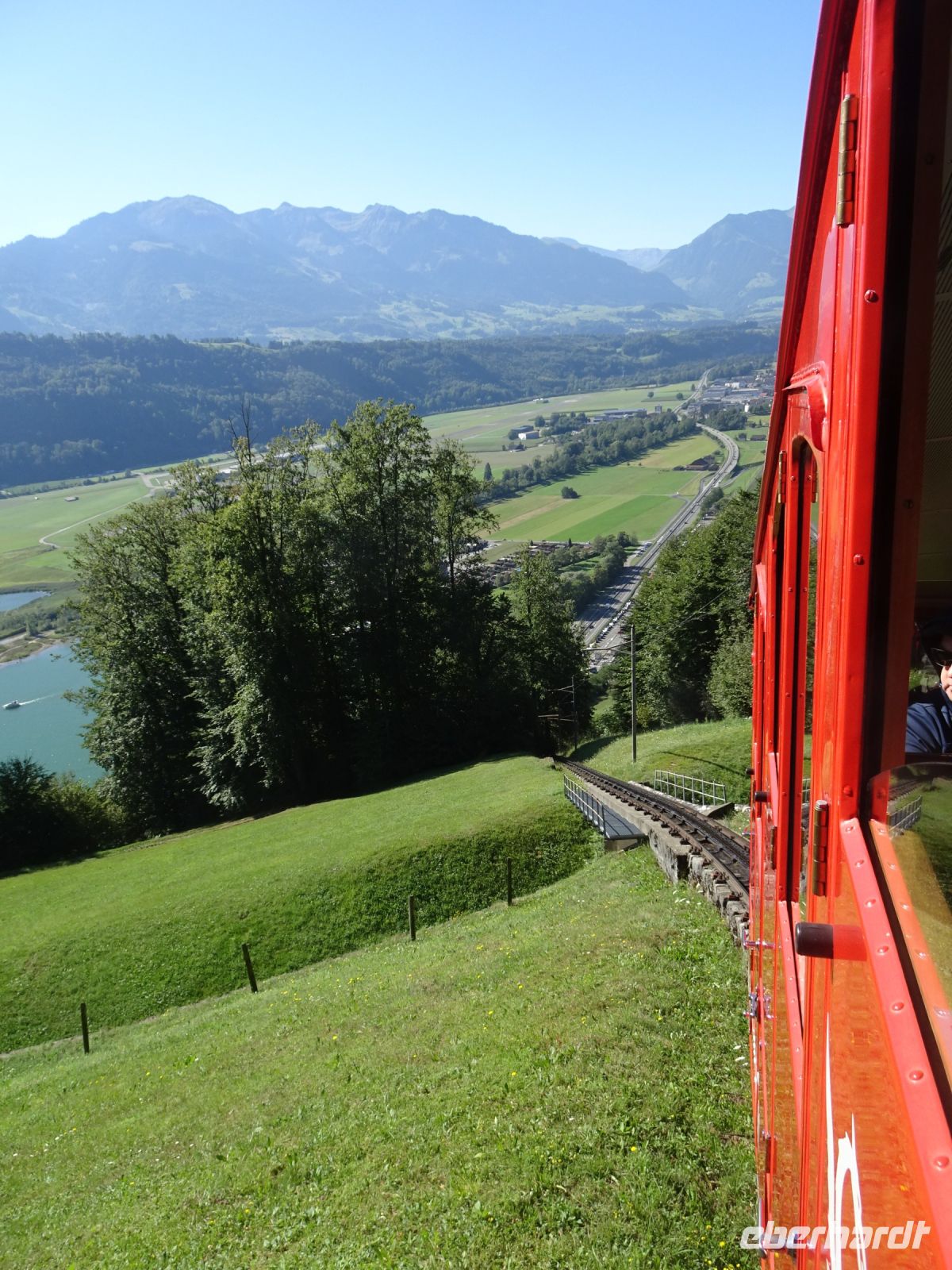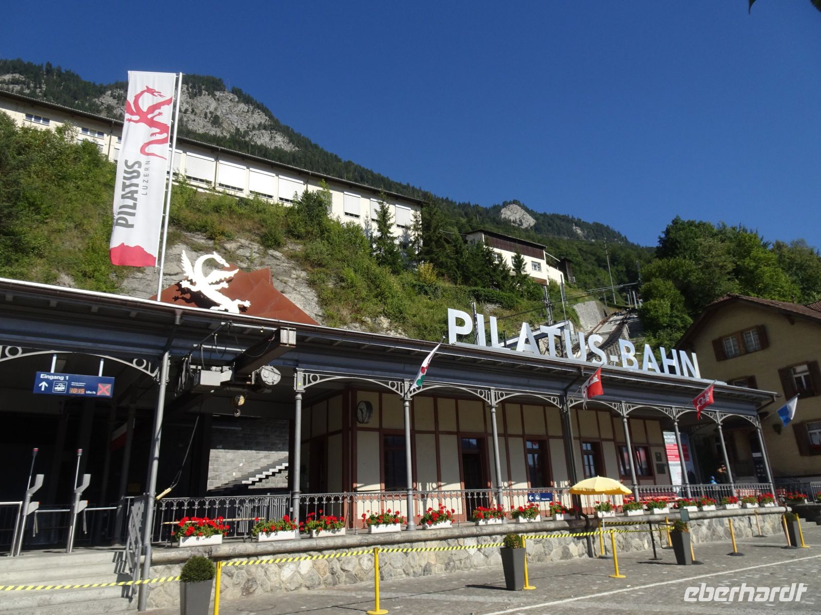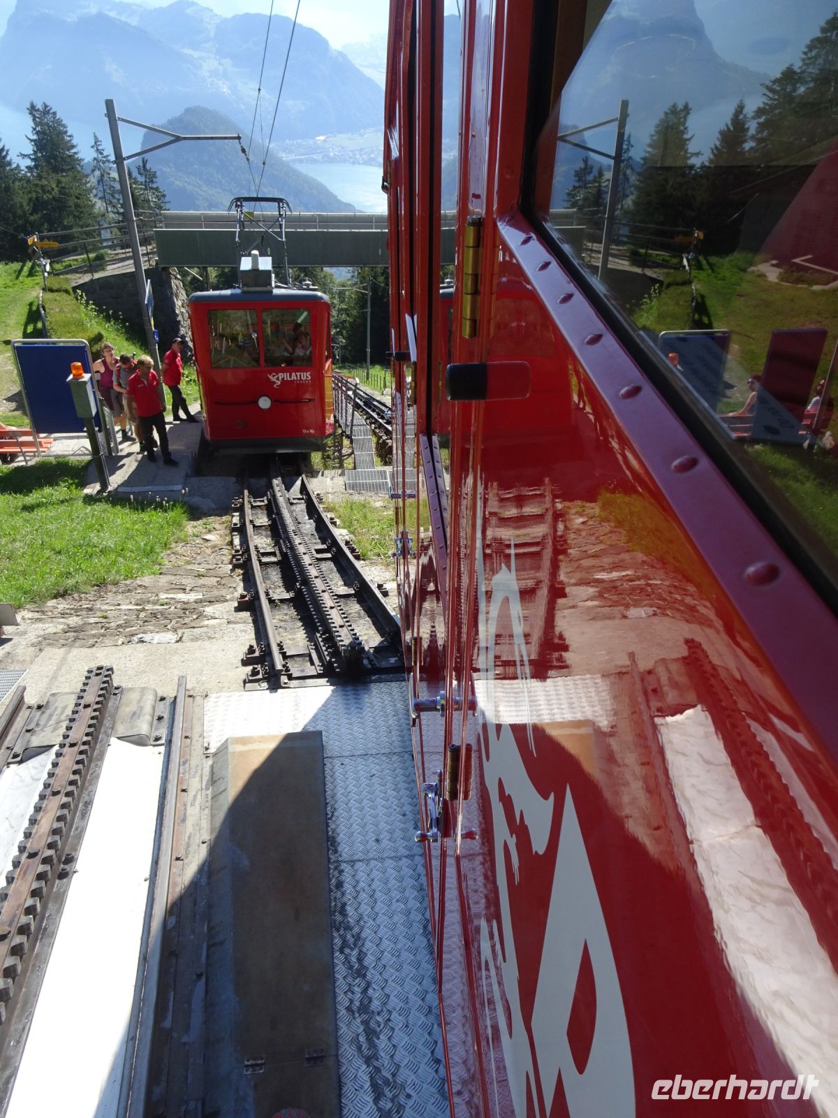 Vorbei am Eingang der Aareschlucht, Meiningen und nach kurzem Stopp auf dem Brüningpass ging es anschließend weiter in Richtung Vierwaldstätter See und nach Alpnachstadt. Kurzer Fotostopp an Lungerner See, da hatten wir die Talstation der steilsten Zahnradbahn der Welt, der Pilatusbahn, auch schon erreicht. Wir hatten wiederum Glück und konnten früher auffahren.