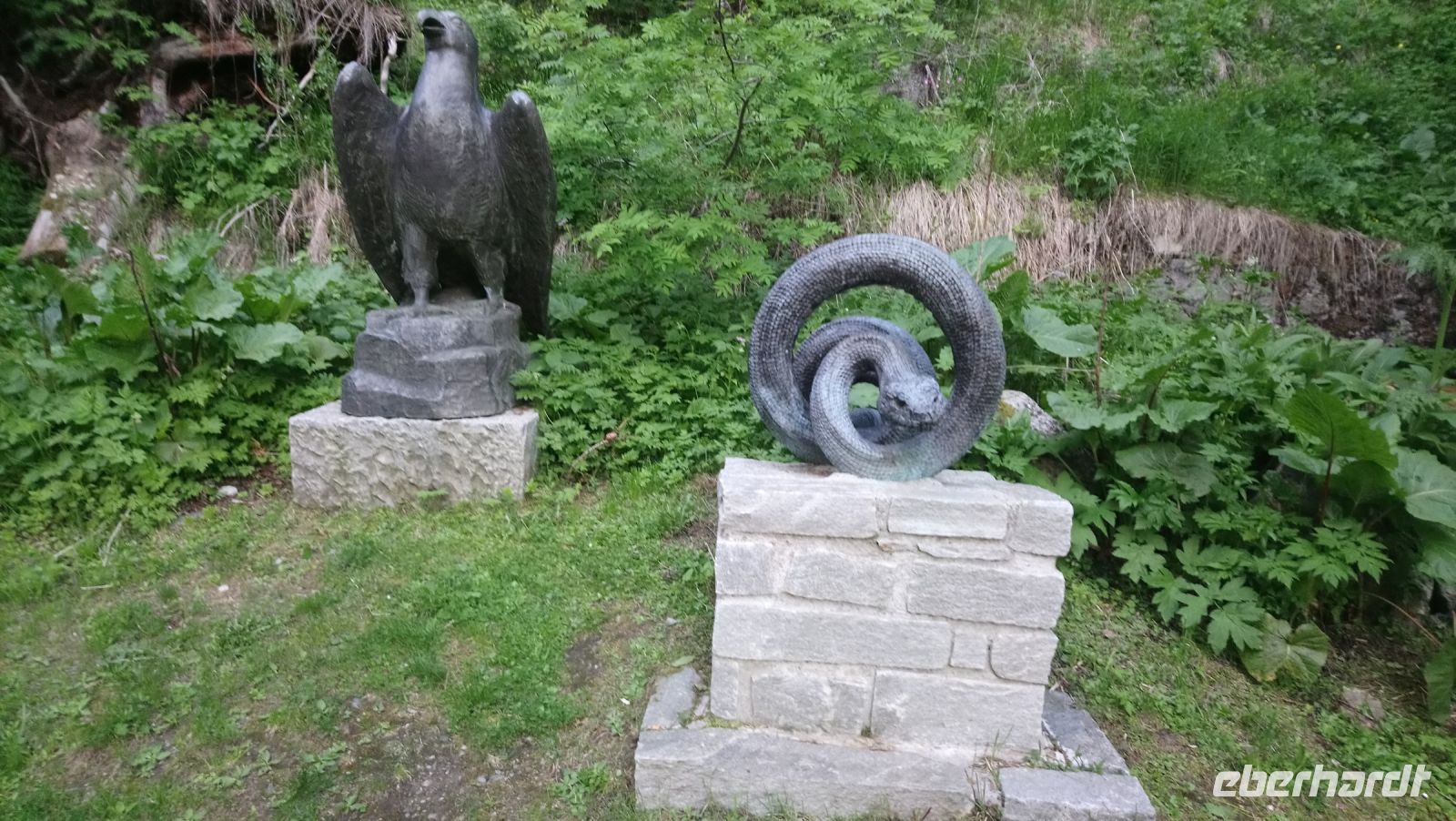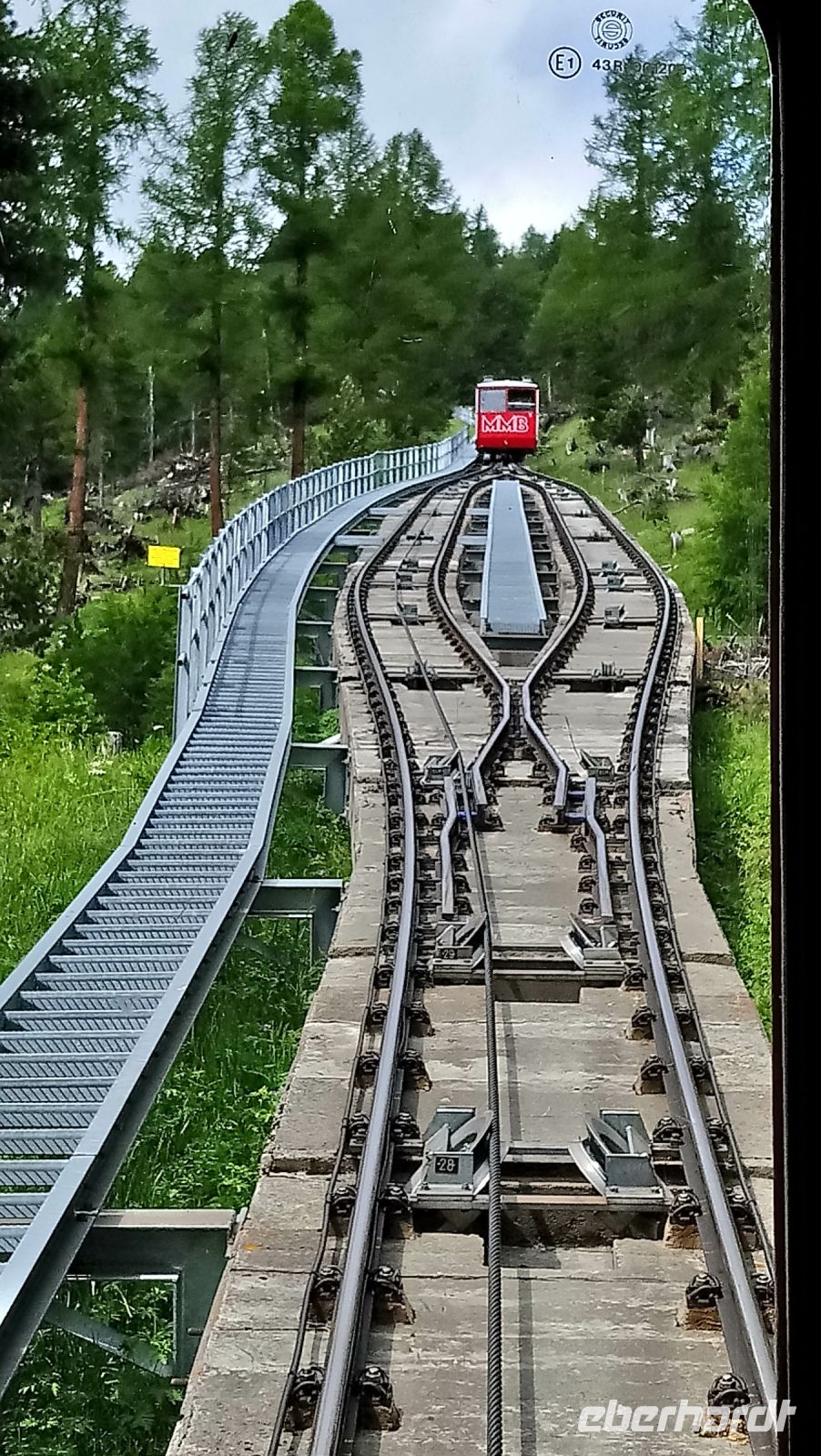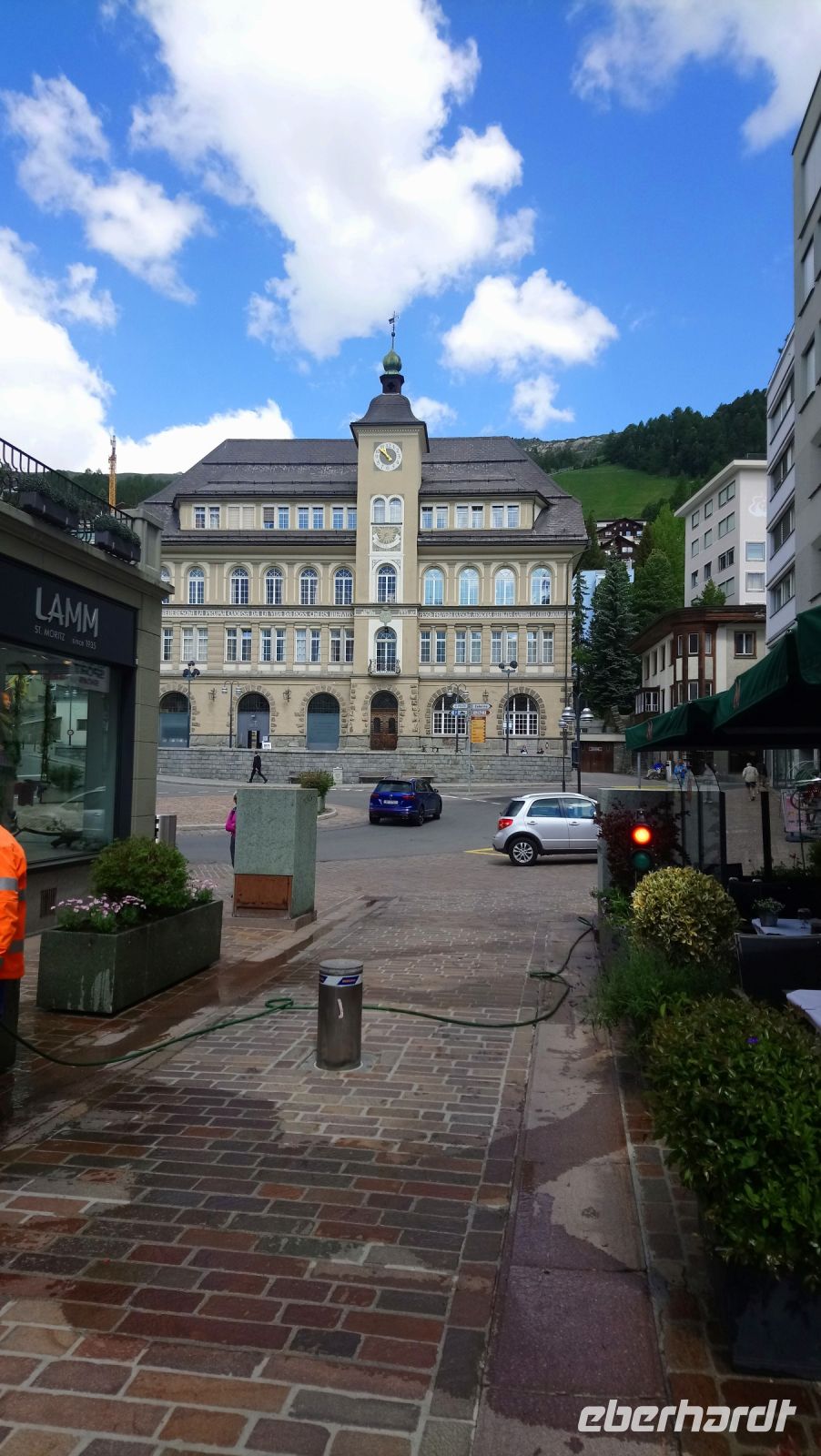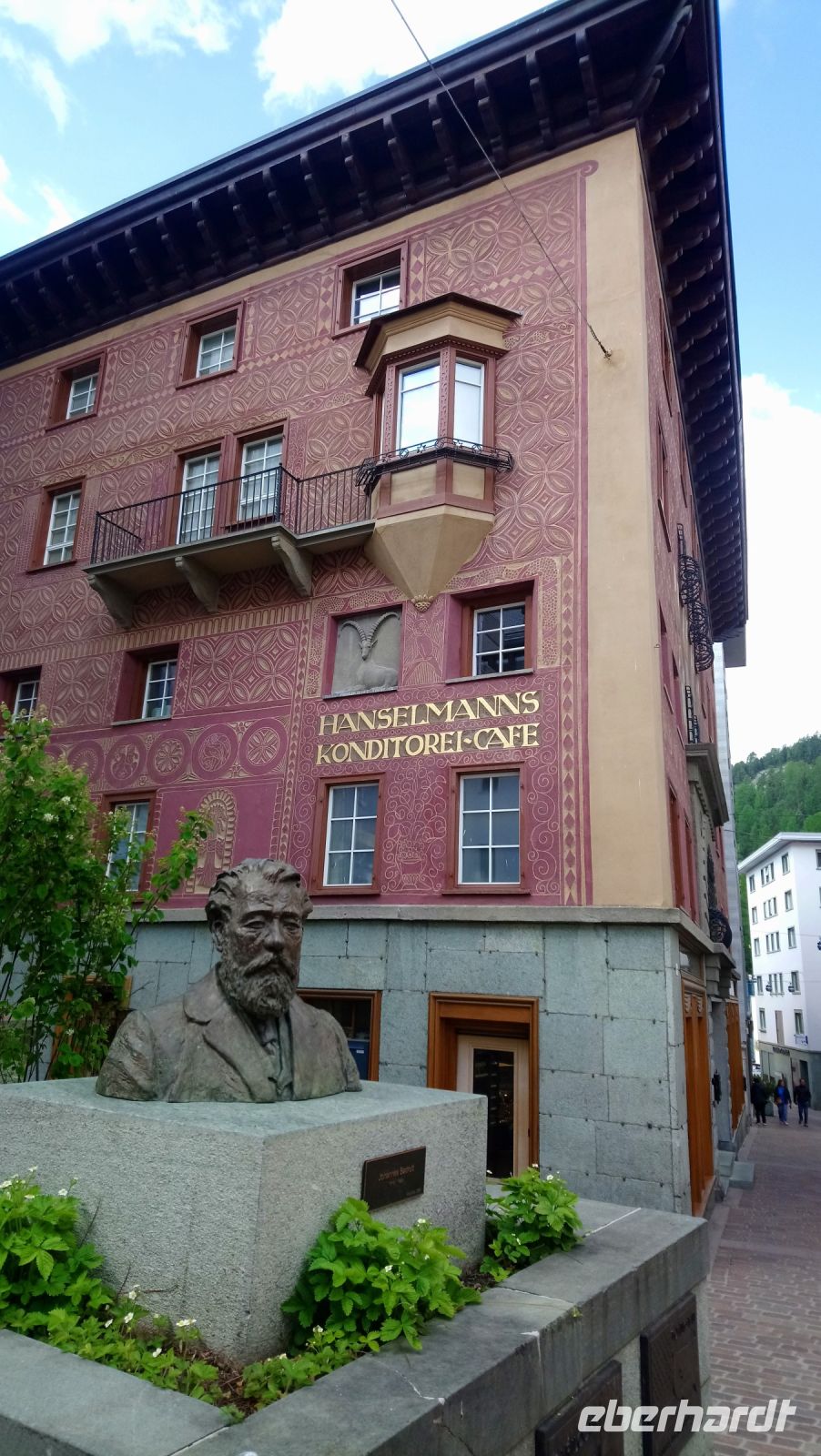 Mit unserer örtlichen Reiseleiterin Susi wollten wir deshalb diesen Ort näher erkunden. Beginnend als bronze- und mittelalterlicher Quellort mit stark eisenhaltiger Quelle, nach dem Arzt auch als Paracelsus-Forum bezeichnet, lernten wir die Entwicklung von St. Moritz als Nobelkurort, besonders für englische Touristen, bei unserm Ortsrundgang sehr gut kennen. Die Büste vom Johannes Badrutt vor Rathaus und Konditorei Hanselmann, die Spitzenhotels Palace und Kulm und der Verweis auf den Schiefen Turm zeigten markante Punkte in St. Moritz. Da wir uns allerdings im Juni in der Zwischensaison zwischen Winter- und Sommersaison befanden, war der Ort bei unserem Besuch durch rege Bautätigkeit und nur wenige Touristen gekennzeichnet. Wer wollte konnte sich daher ausgiebig in den Edelboutiquen umsehen... Wir machten uns trotzdem ein gutes Bild vom Ort. Die Rundfahrt mit unserem Bus brachte uns dann noch zu den Sportstätten der Olympischen Winterspiele von 1928. Beeindruckend durch naturnahe Gestaltung und trotzdem heute noch in Nutzung im Winter.