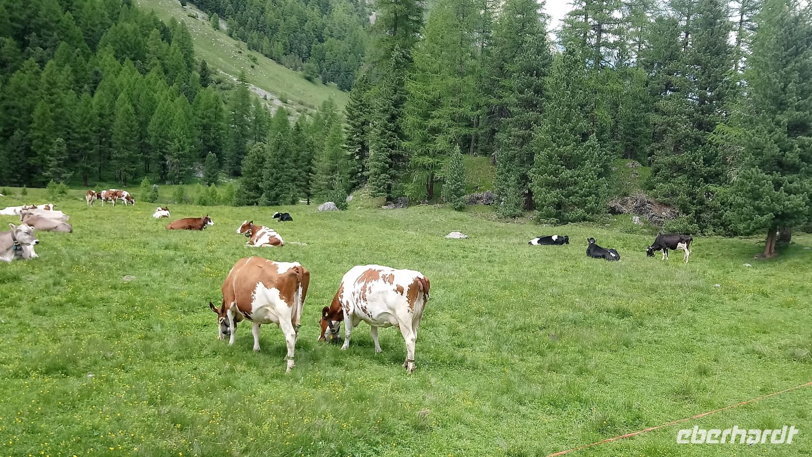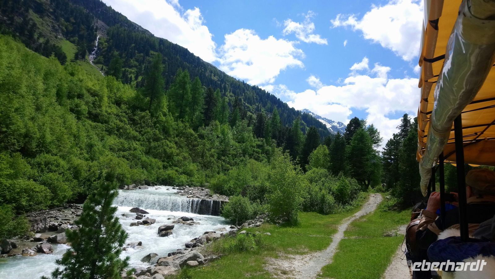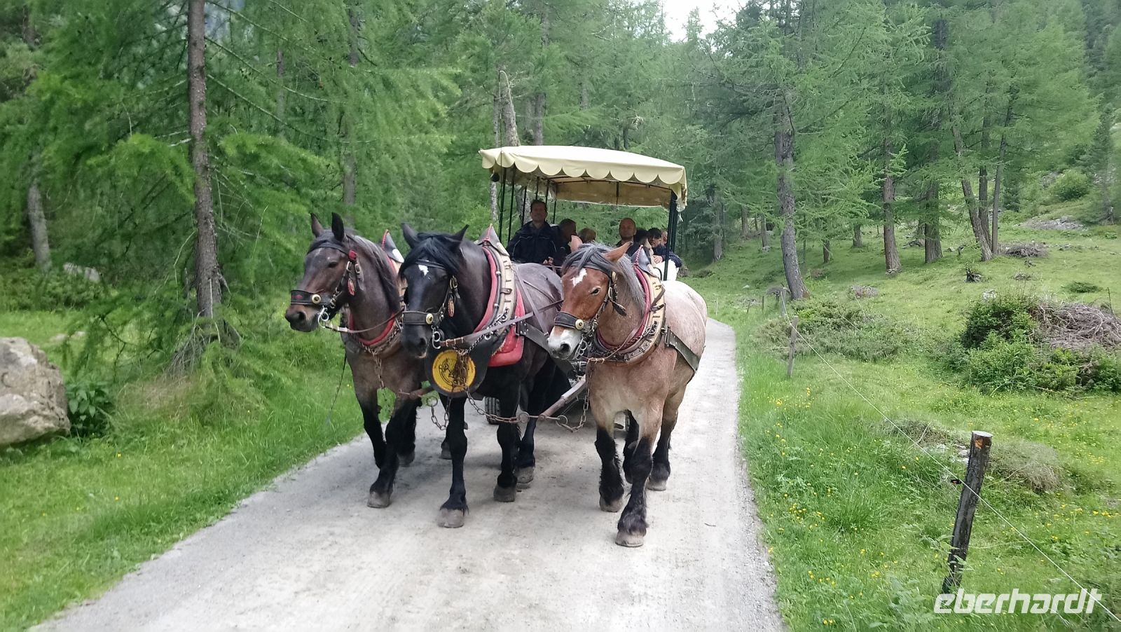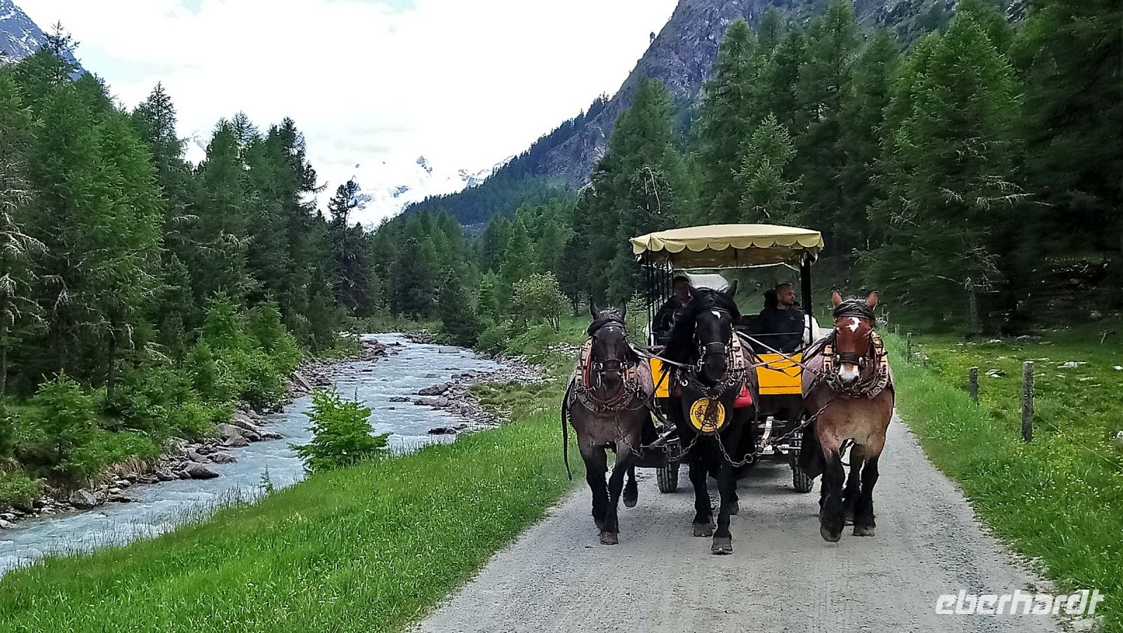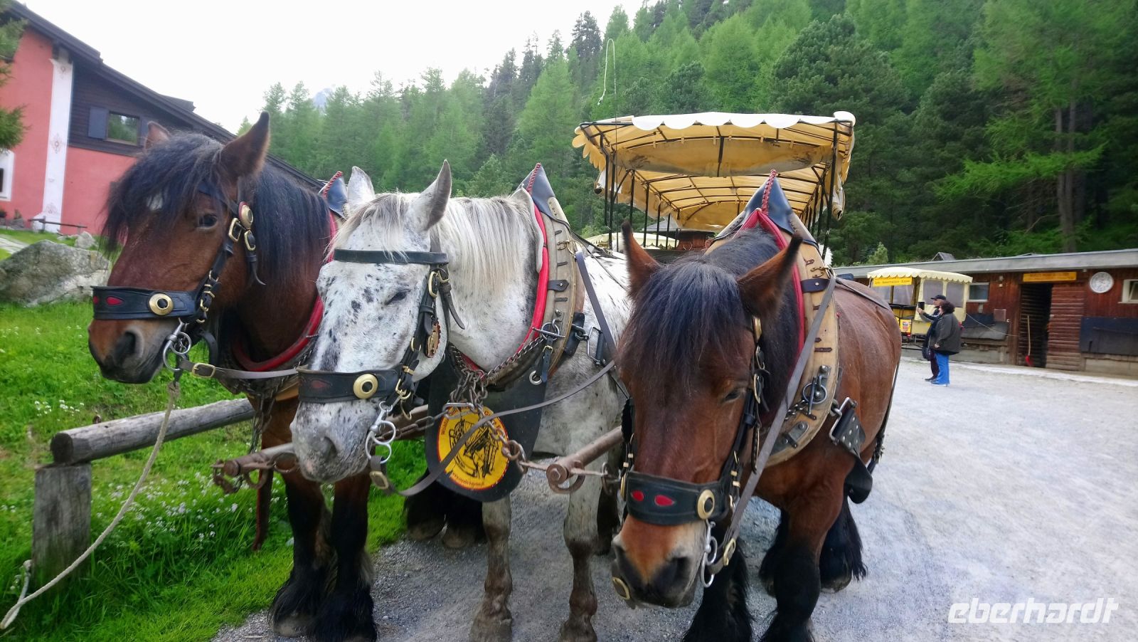 Am Nachmittag dann der mit viel Spannung erwartete Ausflug mit 2 Pferdekutschen durch das Rosegtal zum Ausflugslokal Roseg. Mit jeweils 3 Pferden bespannt war es eine herrliche Tour. Weidende Rinder gaben urtümliches Flair und idyllische Bilder. Vom Restaurant unternahmen einige Reisegäste ansprechende Bergtouren in Richtung des Roseggletschers. Und zur Stärkung gab es dann im Bergrestaurant noch eine kleine Leckerei. Interessant: in einem Bildbetrachter ein Bild des Tales vor ca. 100 Jahren - da gab es noch Gletscher ganz nah!