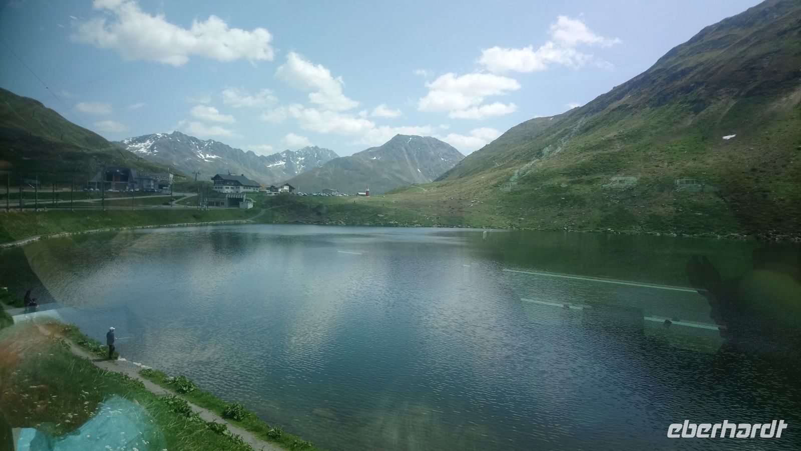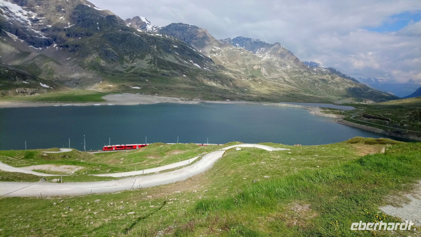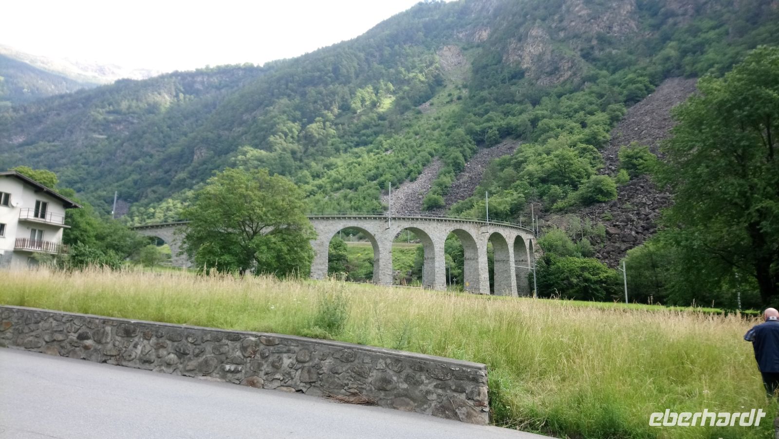 Unser nächster Stopp: der Berninapass mit dem Ospizio Bernina (2253 müM) oberhalb der Bahnstrecke. So konnten wir uns, bevor wir am Nachmittag diesen Punkt mit dem Bernina-Express querten, die Umgebung und die Wasserscheide zwischen Adriatischem und Schwarzem Meer in Ruhe ansehen. Und weiter ging es über den Pass in das Puschlavtal, vorbei am Puschlaversee und mit einem nächsten Stopp in Brusio. Wir bewunderten dieses berühmte Einsenbahnbauwerk, bevor wir am Nachmittag mit dem Express dieses Kreisviadukt nutzen konnten.