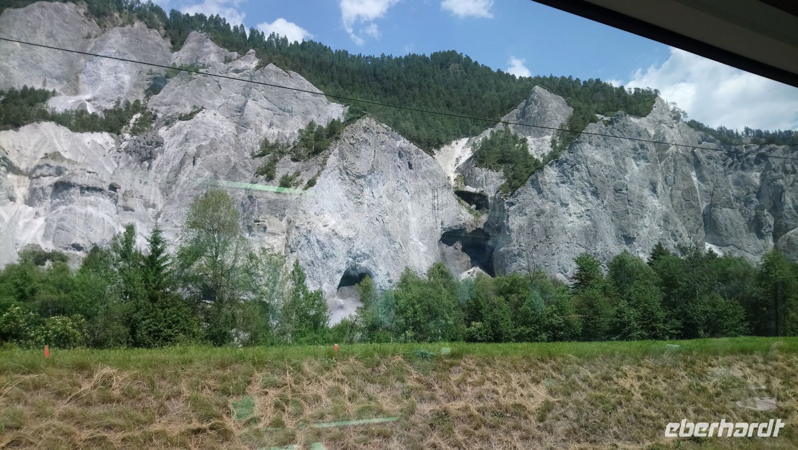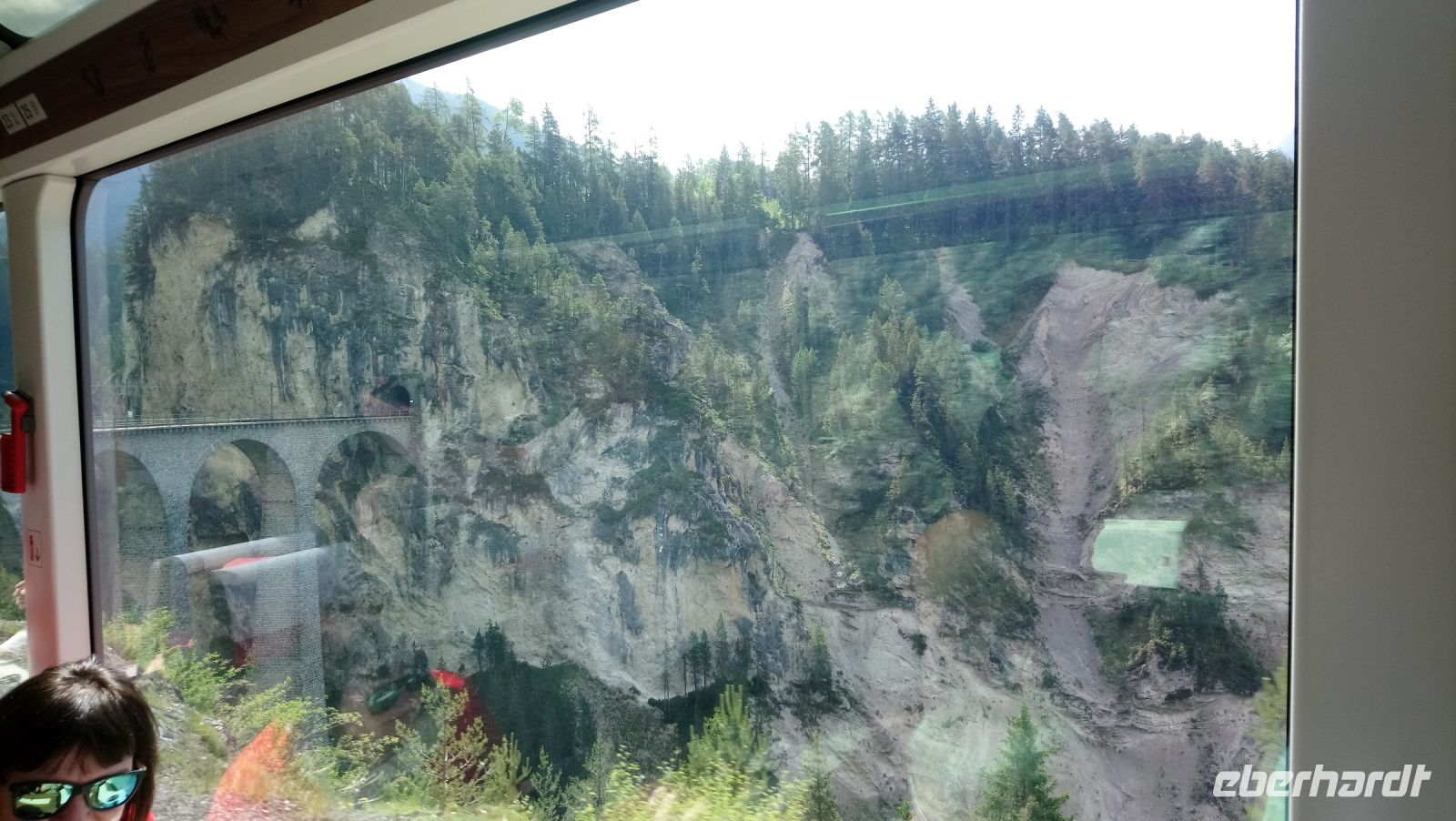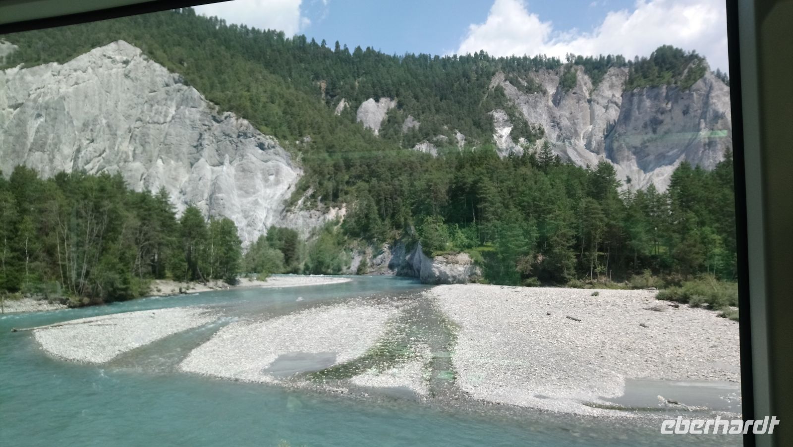 Der Glacier-Express mit unserem 1. Klasse Panoramawagen stand bereit. Los ging die Fahrt. Aber das Zuginformationssystem streikte! So übernahm unser Reiseleiter Hartwig die Erläuterungen und gab konkrete Hinweise, z. B. auf "Die ewig Wartende" in Bahnhof Thusis.