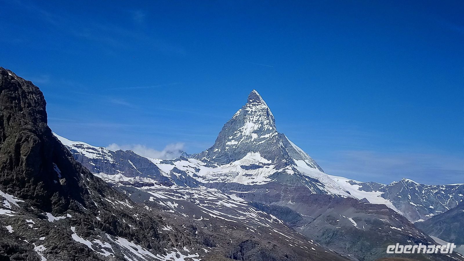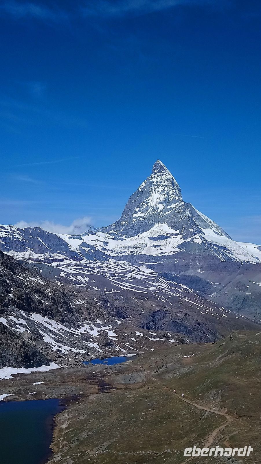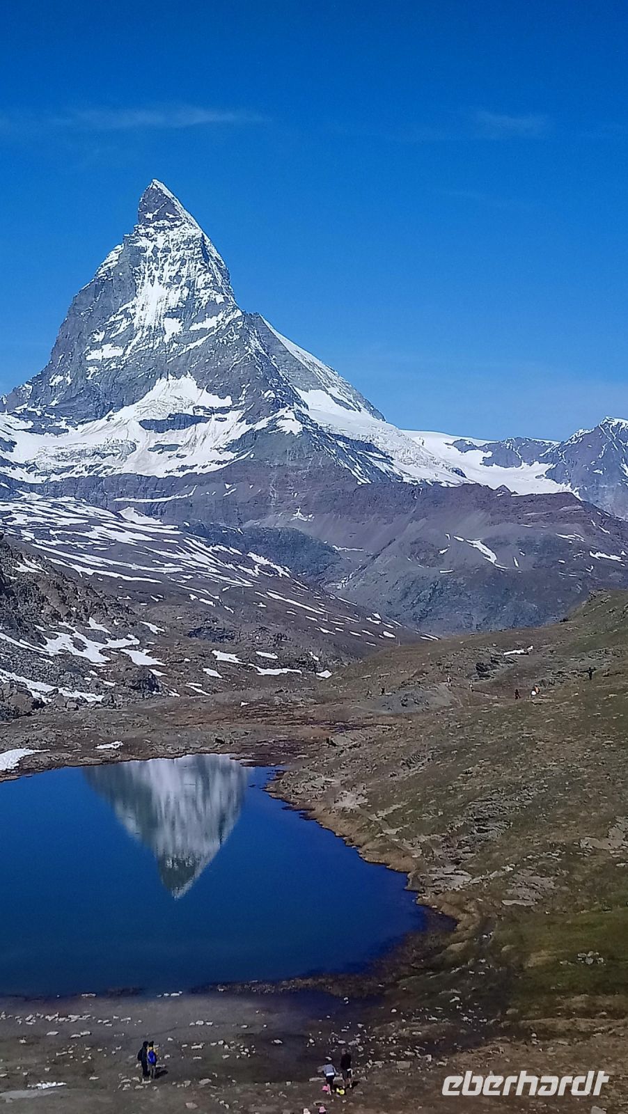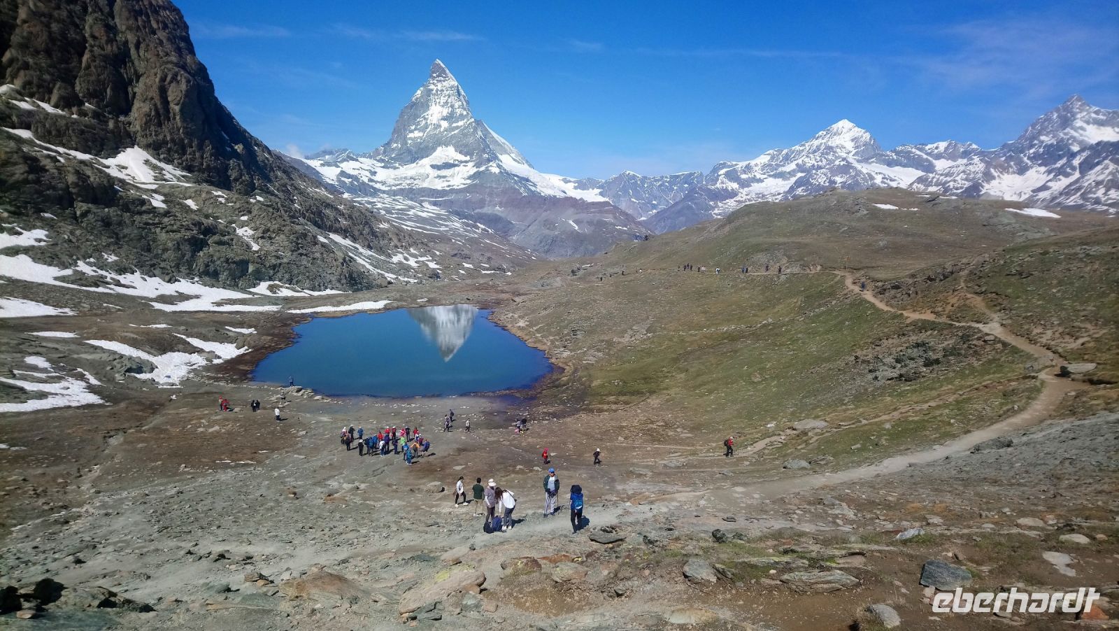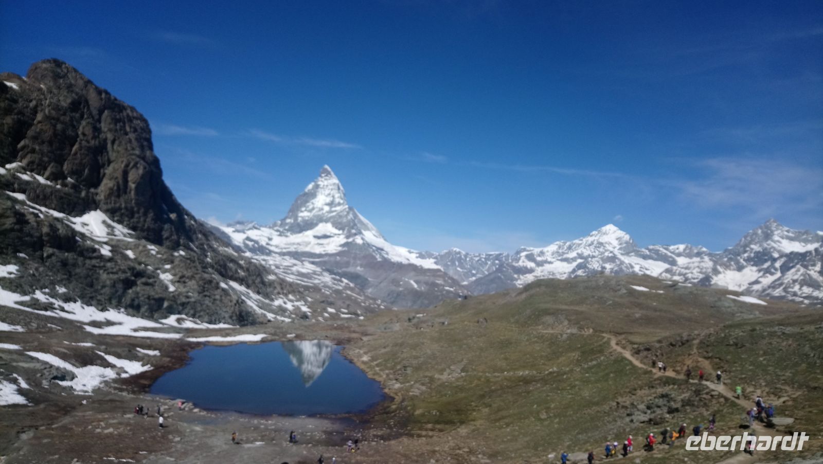 Fakultativer Ausflug zum Gornergrat oder Ortserkundung auf eigene Faust - der Großteil der Reisegäste entschied sich für die Auffahrt auf das Gornergrat. Unser Reiseleiter Hartwig gab denjenigen Reisegästen, die Zermatt erkunden wollten, detaillierte Hinweise auf Sehenswürdigkeiten und offene Bergbahnen. Die Gornergratbahn ist in diesem Jahr 125 Jahr in Betrieb und hinter der Jungfraujochbahn die zweithöchste Bergbahn in Europa. Erster Halt bei der Auffahrt mit der zahnradgetriebenen Gornergratbahn war Rotenboden, wo einige Reisegäste mit unserm Reiseleiter Hartwig bis zum spiegelglatten Riffelsee abstiegen. Prachtvoller Blick auf das Matterhorn!