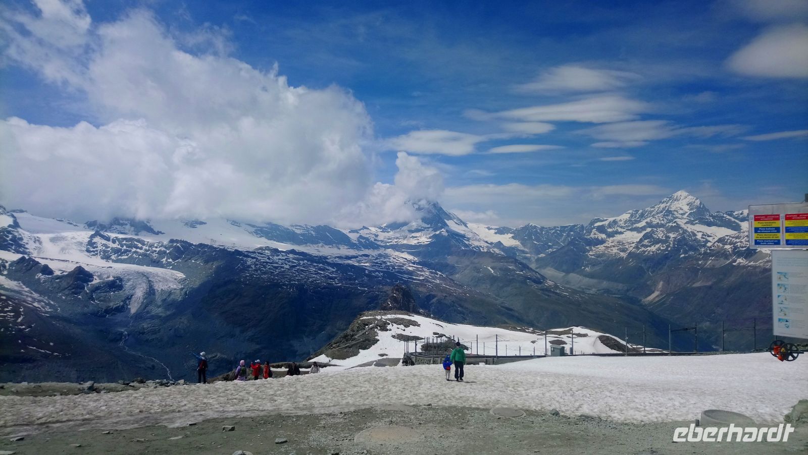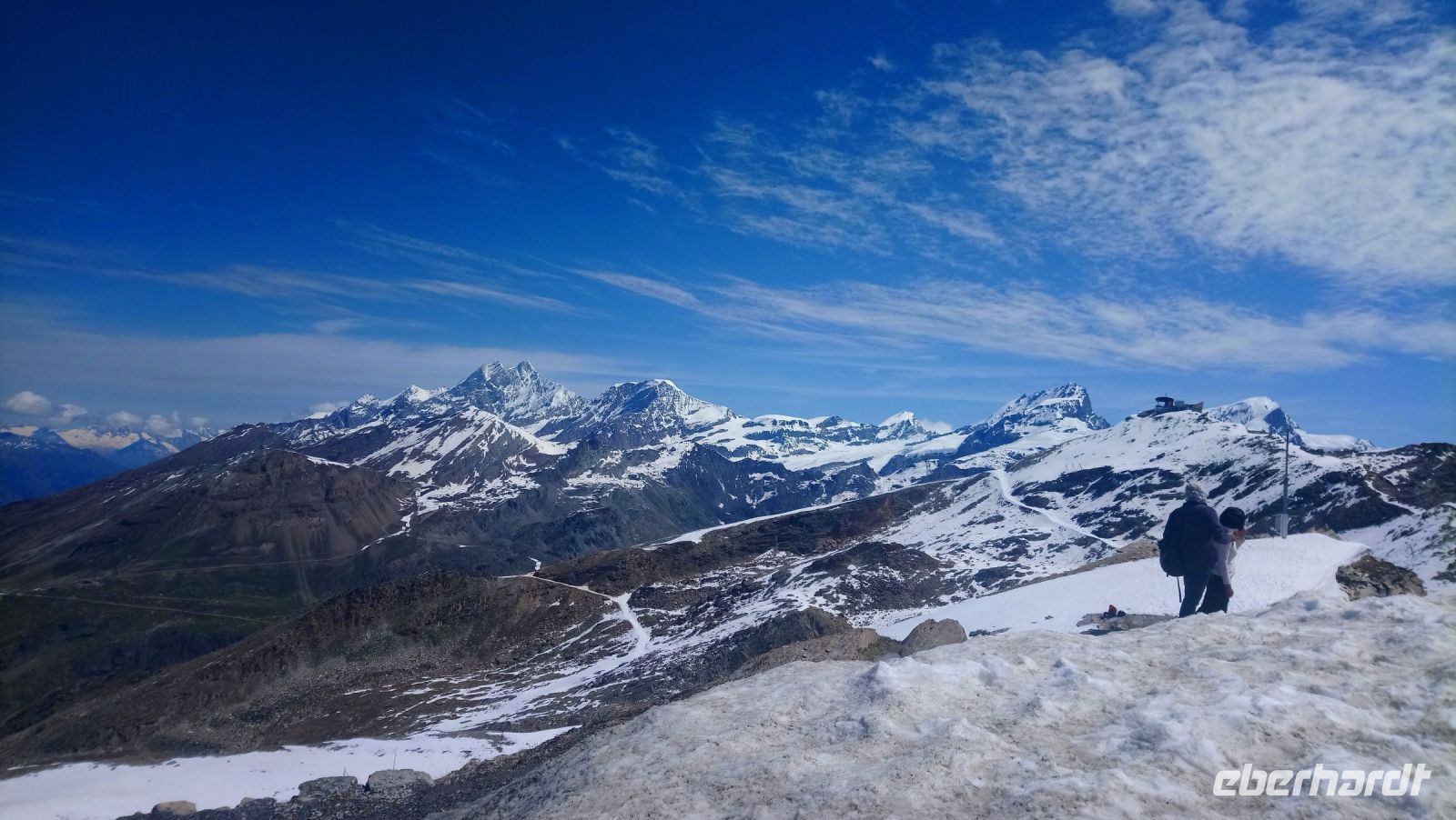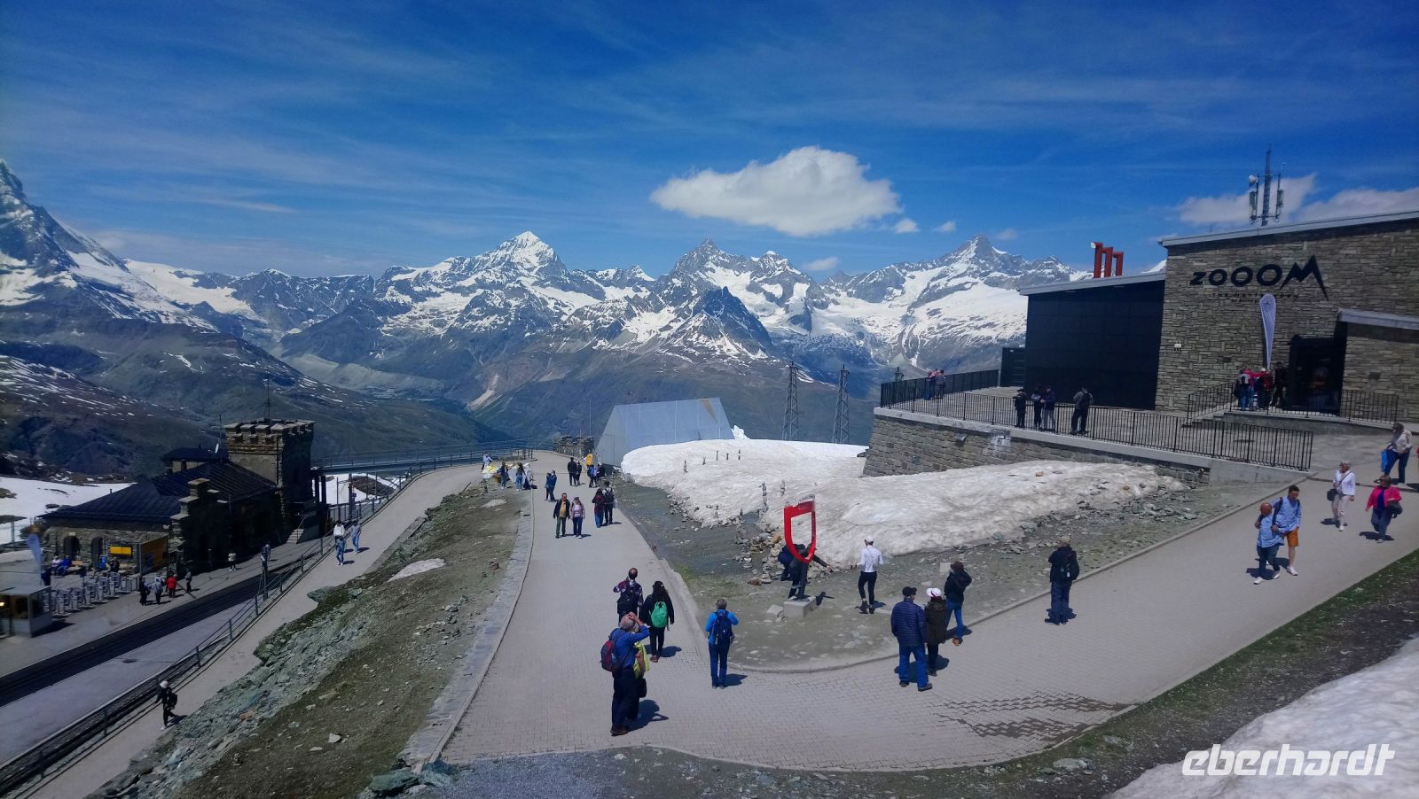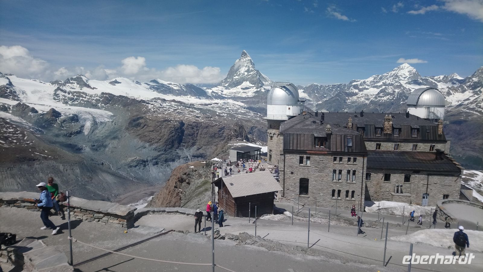 Nachdem wir einen Zug übersprungen hatten, ging die Auffahrt zum Gornergrat weiter. Kulmhotel, Ausstellung Zooom mit virtuellem Flug um das Matterhorn, Kapelle und natürlich die Aussichtsplattform. Wir hatten ein tolles Panorama. Erläuterungen und die Benennung der Berge in den aufgestellten Teleskopen brachten einen sehr guten Überblick über die Bergwelt rund um die Bergstation Gornergrat.