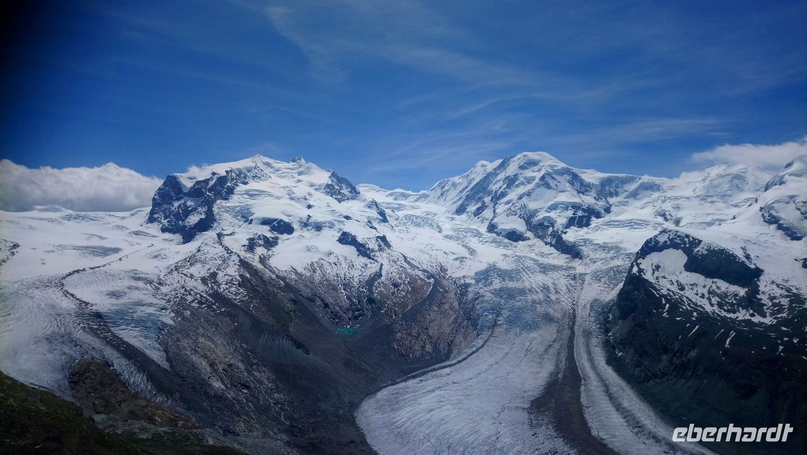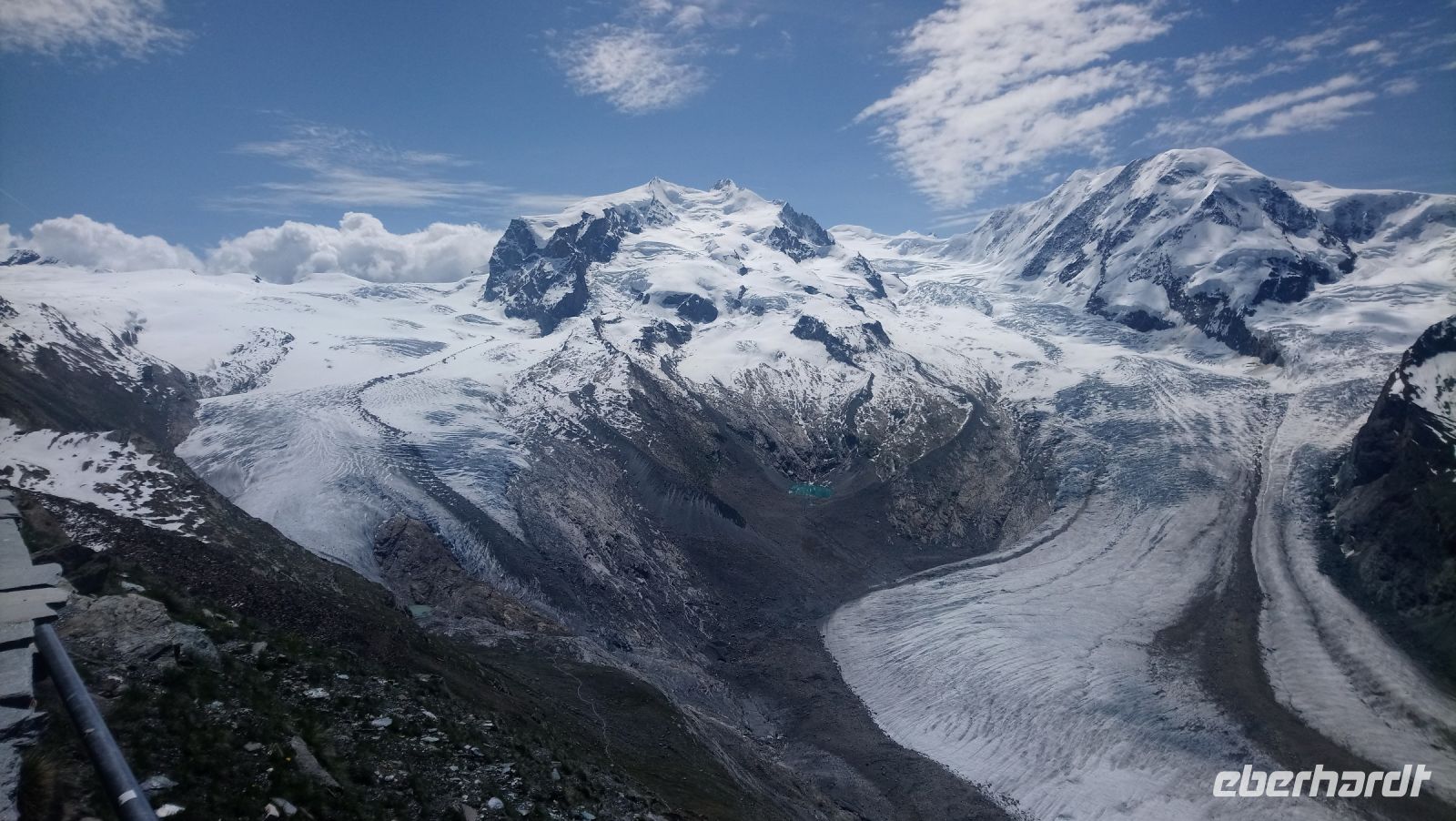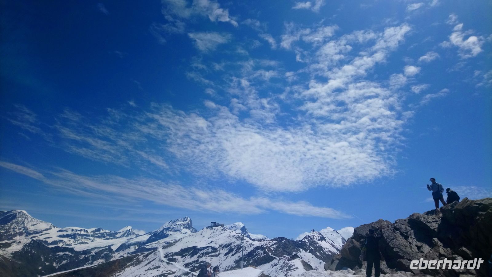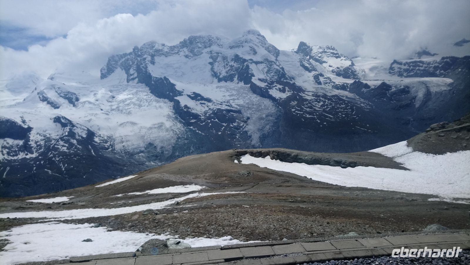 Nachdem wir einen Zug übersprungen hatten, ging die Auffahrt zum Gornergrat weiter. Kulmhotel, Ausstellung Zooom mit virtuellem Flug um das Matterhorn, Kapelle und natürlich die Aussichtsplattform. Wir hatten ein tolles Panorama. Erläuterungen und die Benennung der Berge in den aufgestellten Teleskopen brachten einen sehr guten Überblick über die Bergwelt rund um die Bergstation Gornergrat.