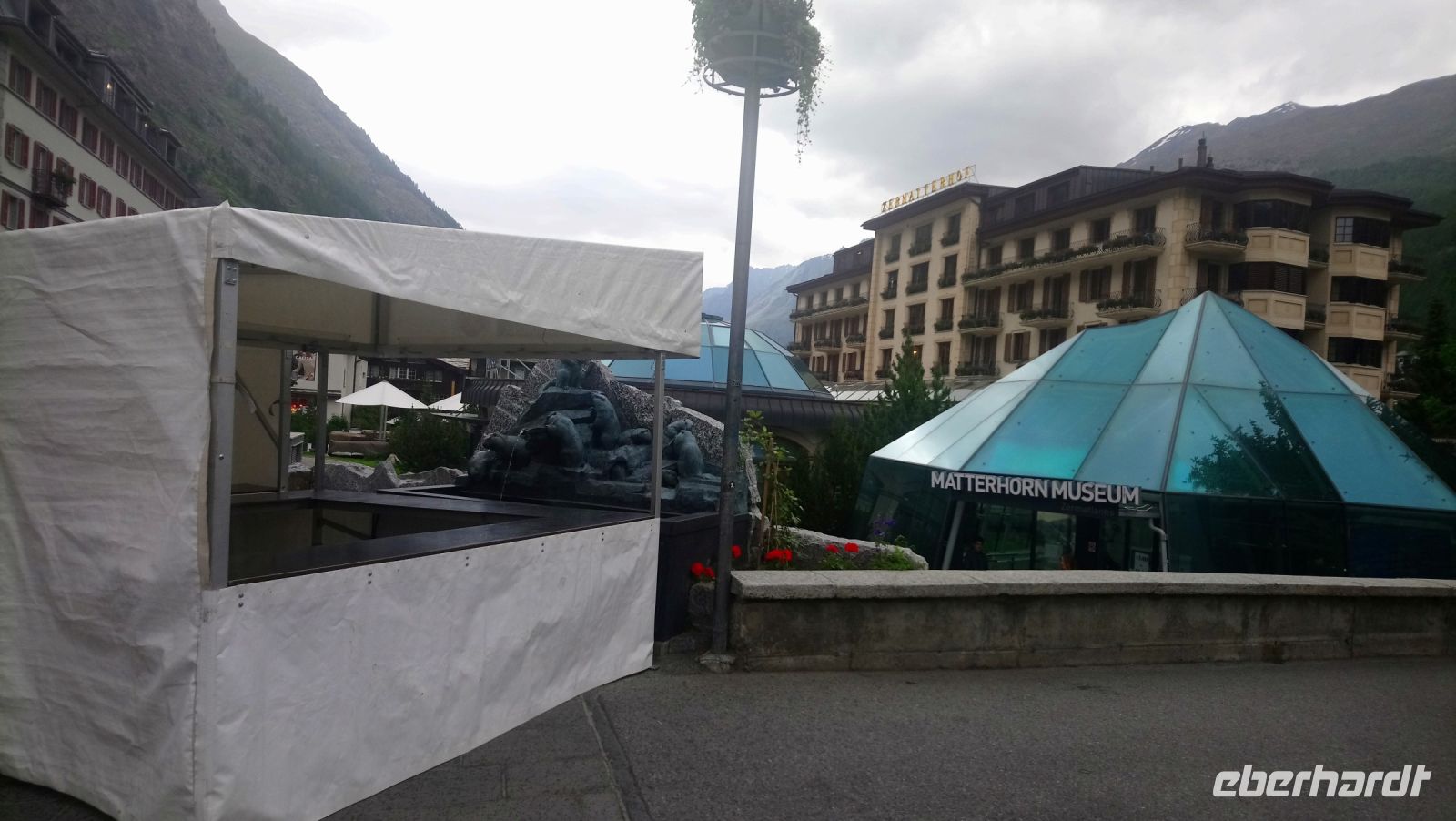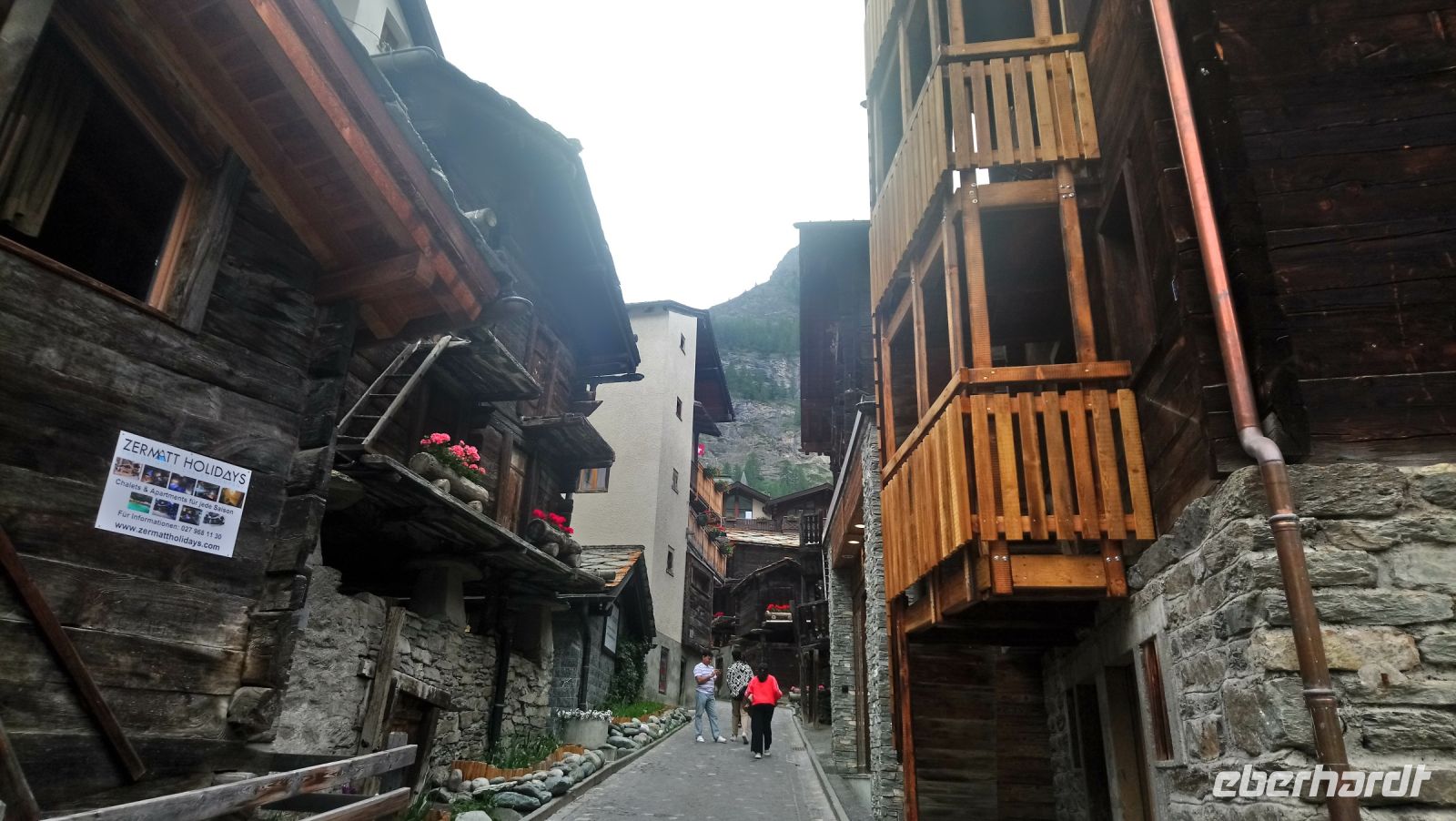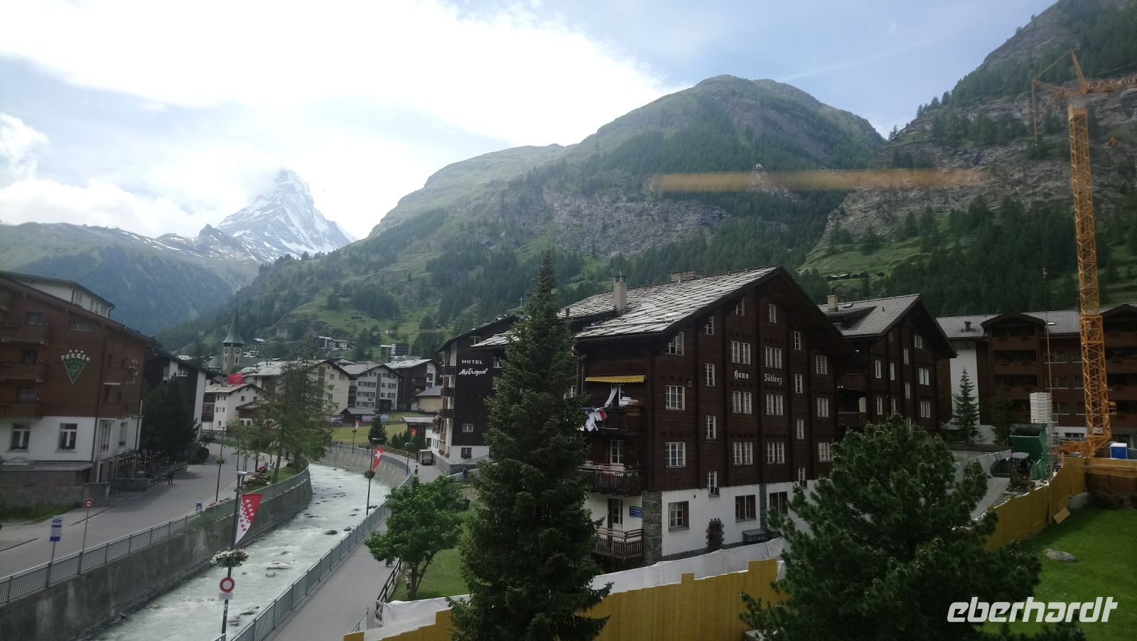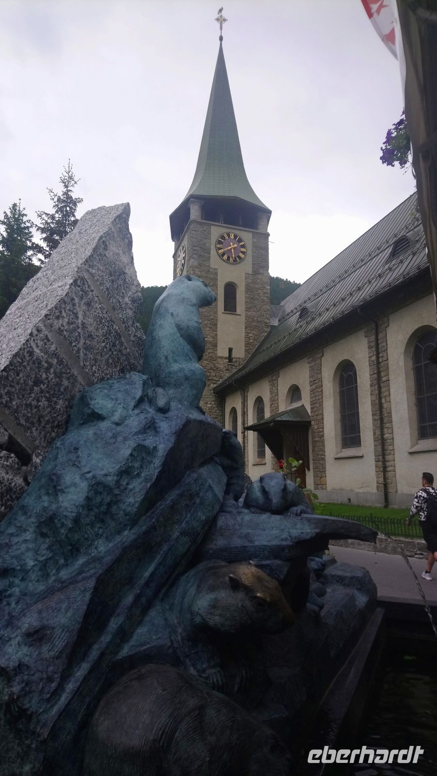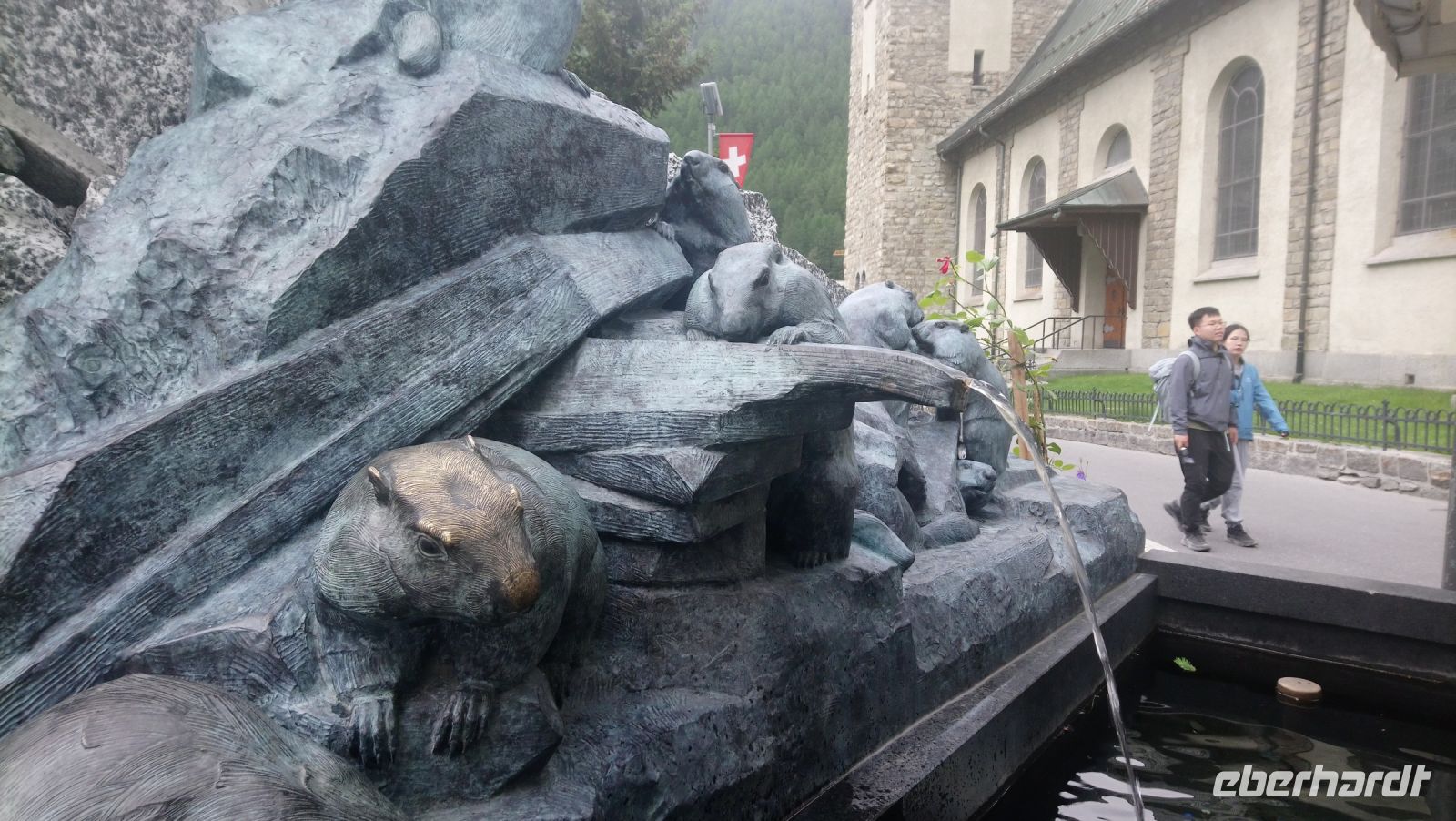 Um späten Nachmittag bot unser Reiseleiter dann noch einen Rundgang durch Zermatt an. Blick auf das Matterhorn mit Mattervispa, alter Dorfkern, Bergsteiger- und Bergführerfriedhof, Pfarrkirche mit dem 1980 geschaffenen Deckengemälde Arche Noah, Gedenkfliesen im Gehweg für die Erstbesteiger usw. Allerdings: der nun restaurierte Murmeltierbrunnen war gedankenlos hinter einer Bude versteckt - wir haben das Murmeltier trotzdem gefunden und berührt, mal sehen, ob es wieder für einen Besuch reicht.