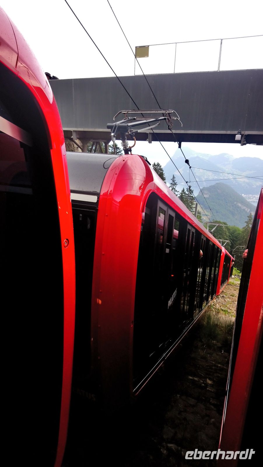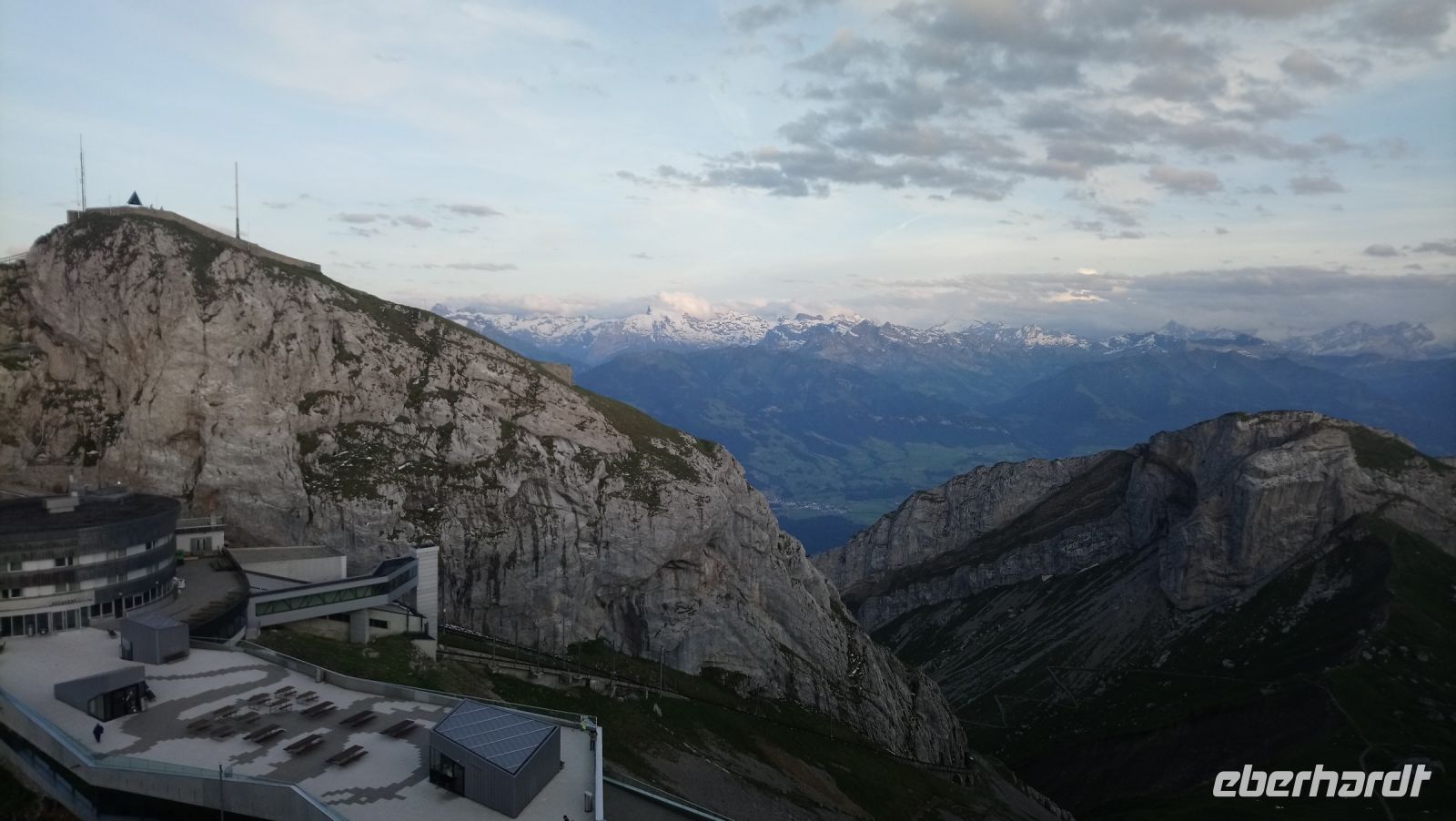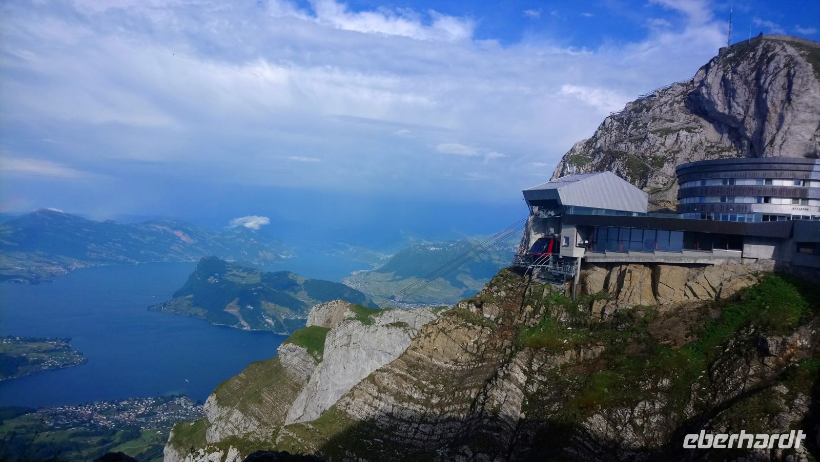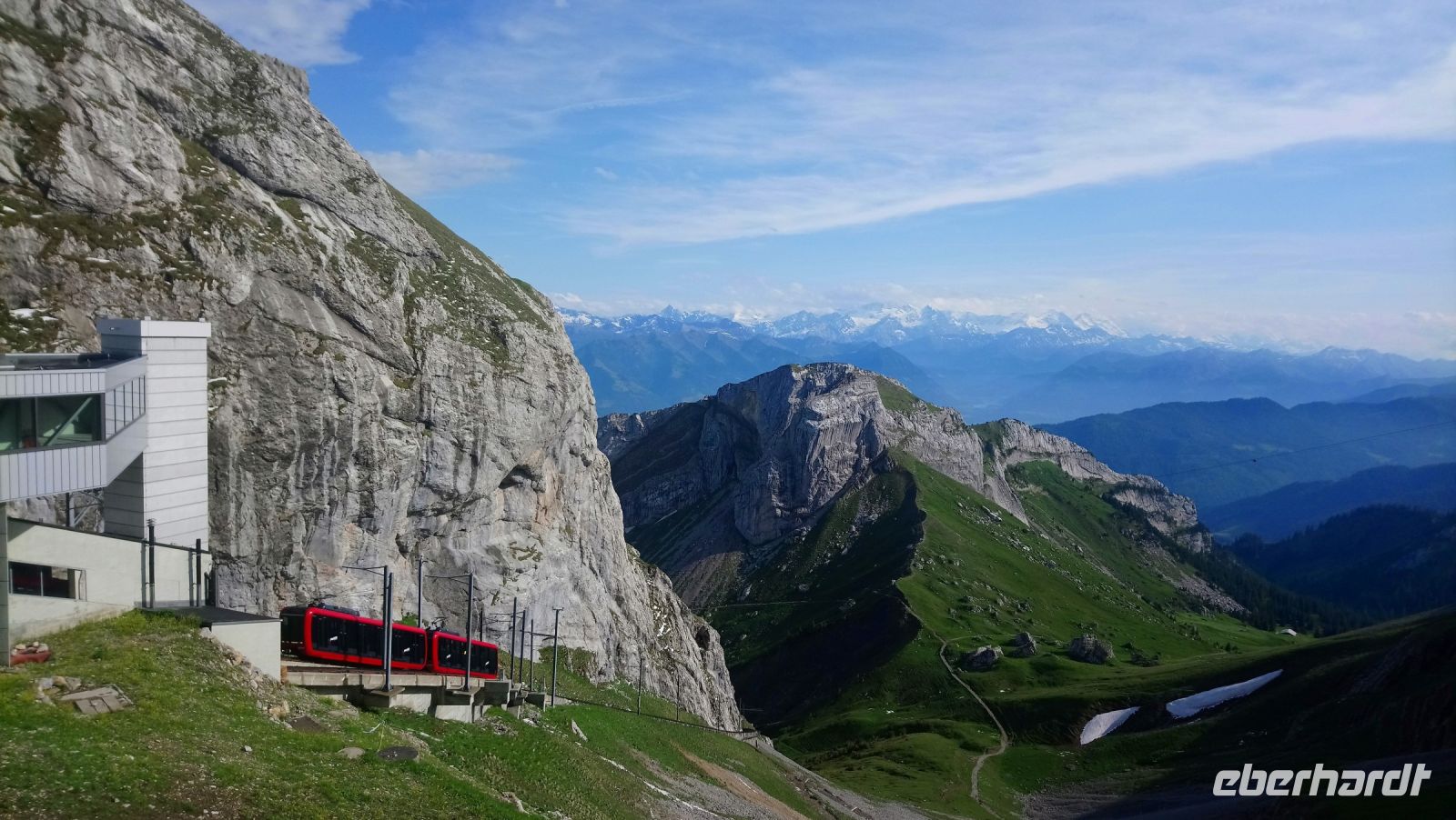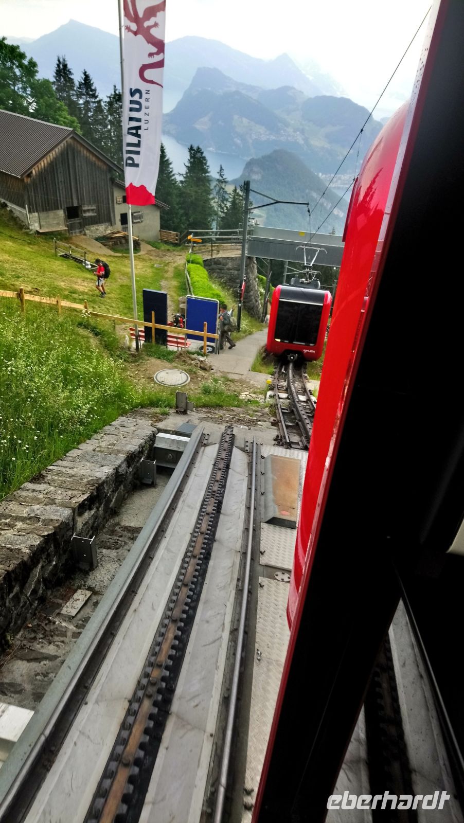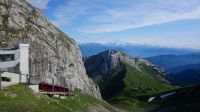 Aber wir wollten ja weiter: rechtzeitig trafen wir in Alpnachstadt zur Fahrt mit der Pilatusbahn ein. Die Pilatusbahn ist die steilste Zahnradbahn der Welt. Nunmehr sind die Wagen der dritten Generation in Betrieb - modern, komfortabel und mit neuer Weichentechnik auf bewährter 4,3 km langen Bergstrecke mit bis zu 48% Steigung - ein einmaliges Erlebnis. Kurz vor Ankunft am Berg gab Petrus uns dann nochmals zu verstehen, dass er auch Graupel und Gewitter kann. Wir konnten trotzdem trockenen Fußes einchecken - Zimmer im runden Hotel Bellevue haben die Form von Tortenstücken - gewöhnungsbedürftig. Doch das Wetter besserte sich. So konnten wir die Zeit bis zum Abendessen mit Erkundung des Areals auf der Pilatusberggruppe nutzen: Oberhaupt (2106 m hoch) und Esel (2119 m hoch) sind Bergbezeichnungen! Und: der Sonnenuntergang ist besonders vom Oberhaupt sehenswert, der Sonnenaufgang (die Zeit ist stets in der Zimmerkarte vermerkt) lässt sich am Besten vom Esel beobachten.