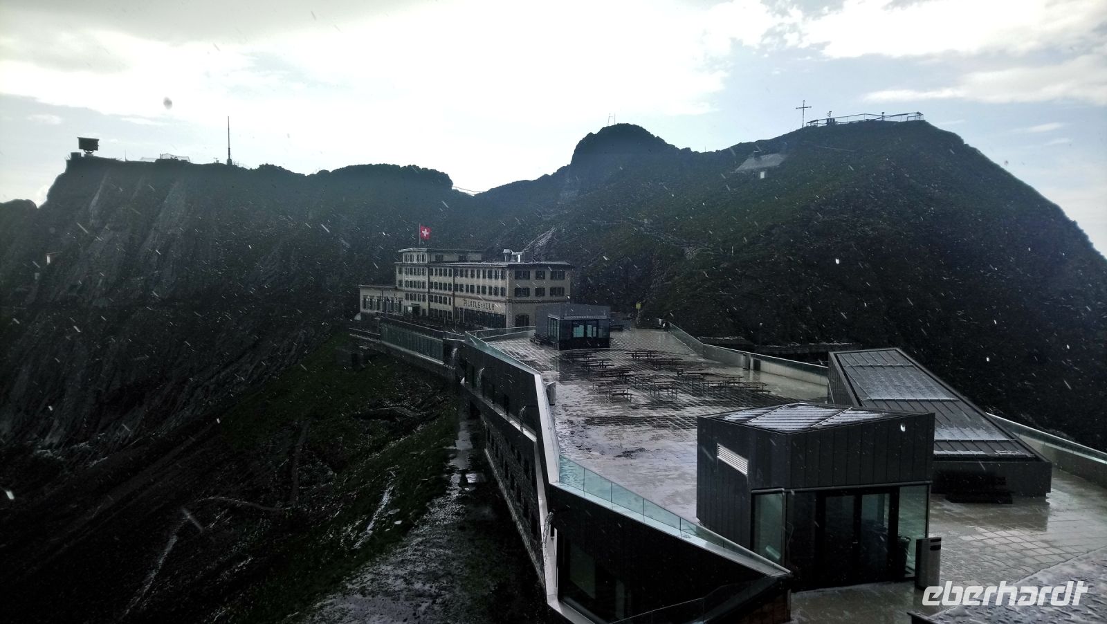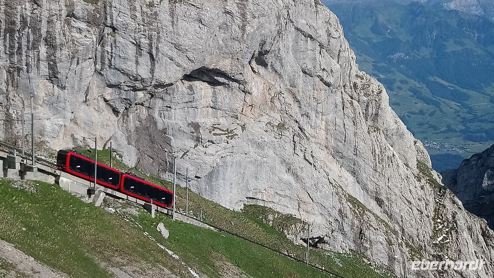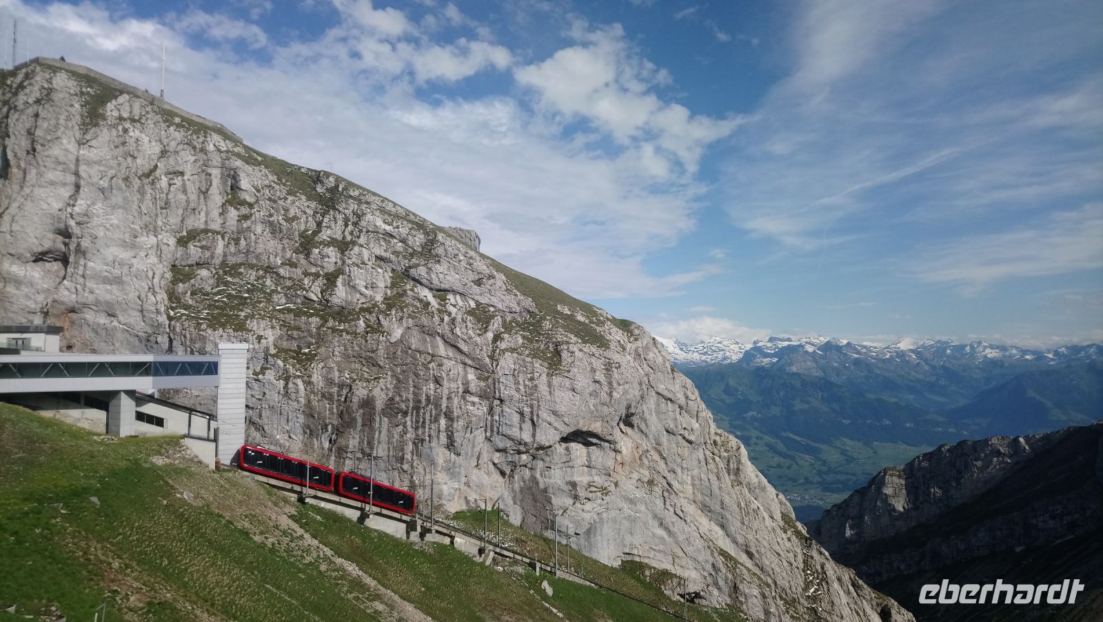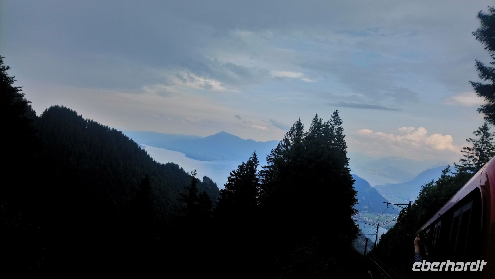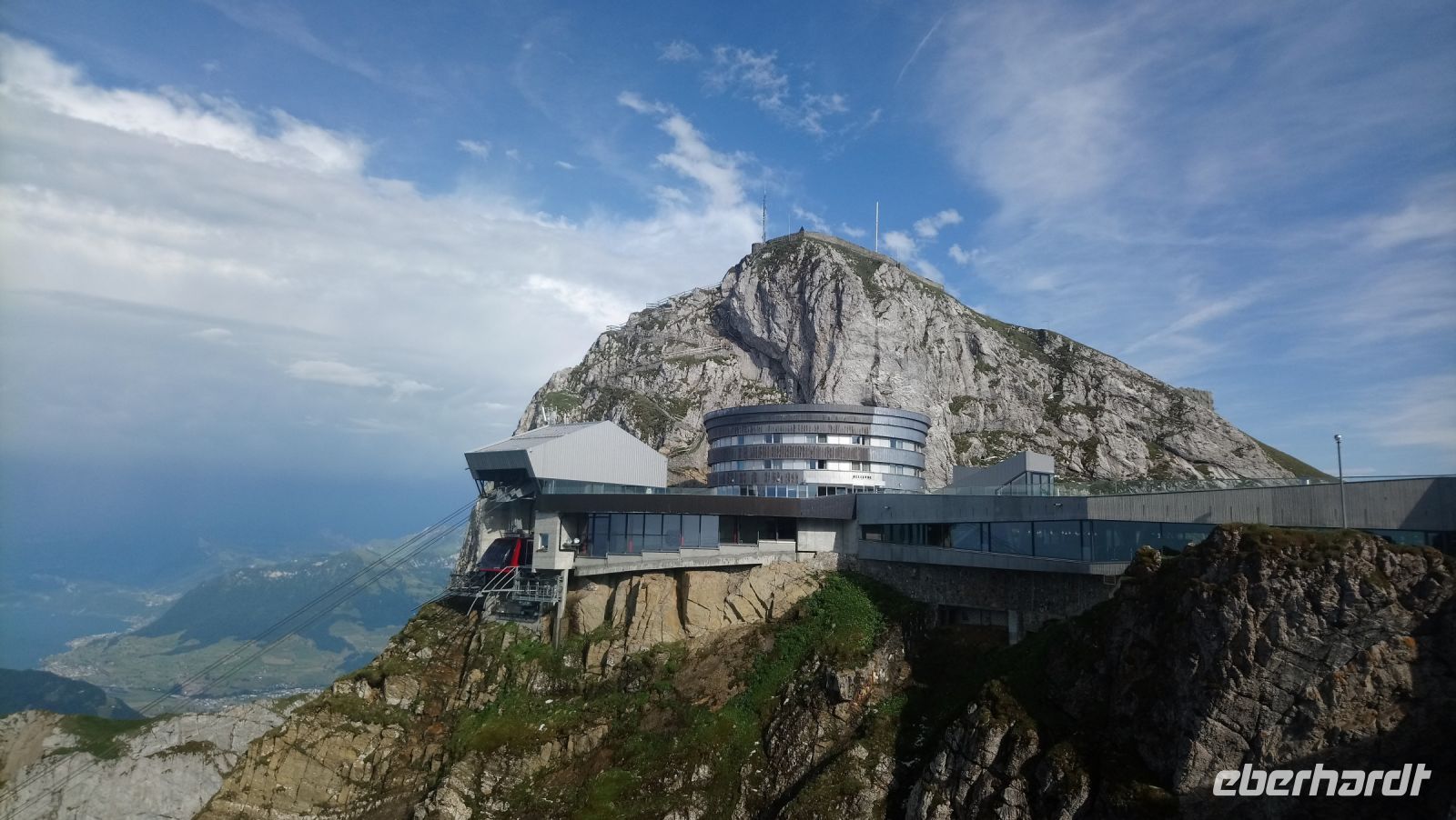 Aber wir wollten ja weiter: rechtzeitig trafen wir in Alpnachstadt zur Fahrt mit der Pilatusbahn ein. Die Pilatusbahn ist die steilste Zahnradbahn der Welt. Nunmehr sind die Wagen der dritten Generation in Betrieb - modern, komfortabel und mit neuer Weichentechnik auf bewährter 4,3 km langen Bergstrecke mit bis zu 48% Steigung - ein einmaliges Erlebnis. Kurz vor Ankunft am Berg gab Petrus uns dann nochmals zu verstehen, dass er auch Graupel und Gewitter kann. Wir konnten trotzdem trockenen Fußes einchecken - Zimmer im runden Hotel Bellevue haben die Form von Tortenstücken - gewöhnungsbedürftig. Doch das Wetter besserte sich. So konnten wir die Zeit bis zum Abendessen mit Erkundung des Areals auf der Pilatusberggruppe nutzen: Oberhaupt (2106 m hoch) und Esel (2119 m hoch) sind Bergbezeichnungen! Und: der Sonnenuntergang ist besonders vom Oberhaupt sehenswert, der Sonnenaufgang (die Zeit ist stets in der Zimmerkarte vermerkt) lässt sich am Besten vom Esel beobachten.