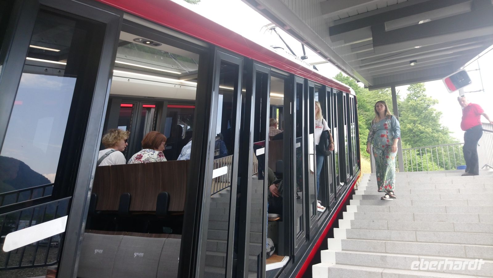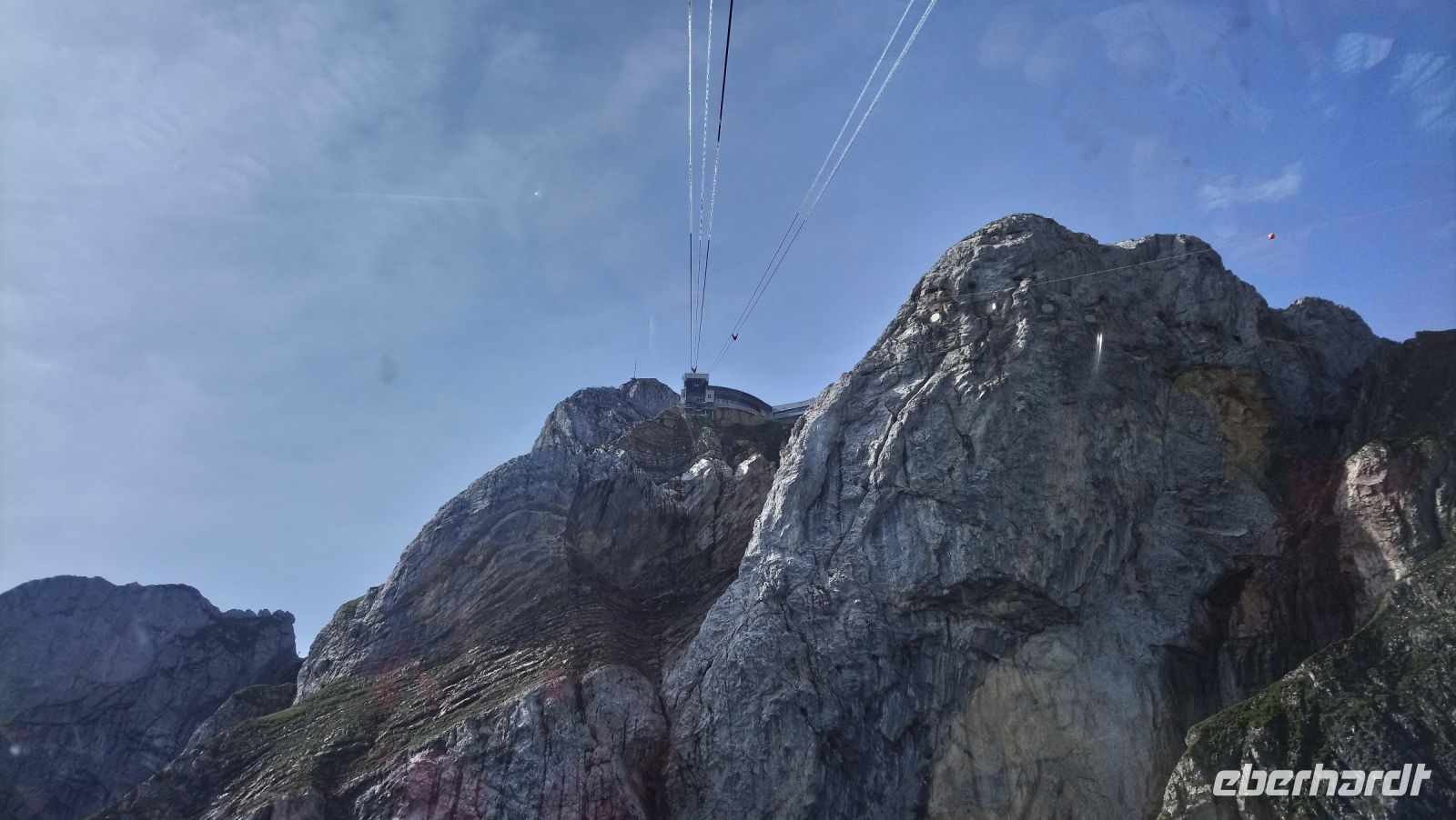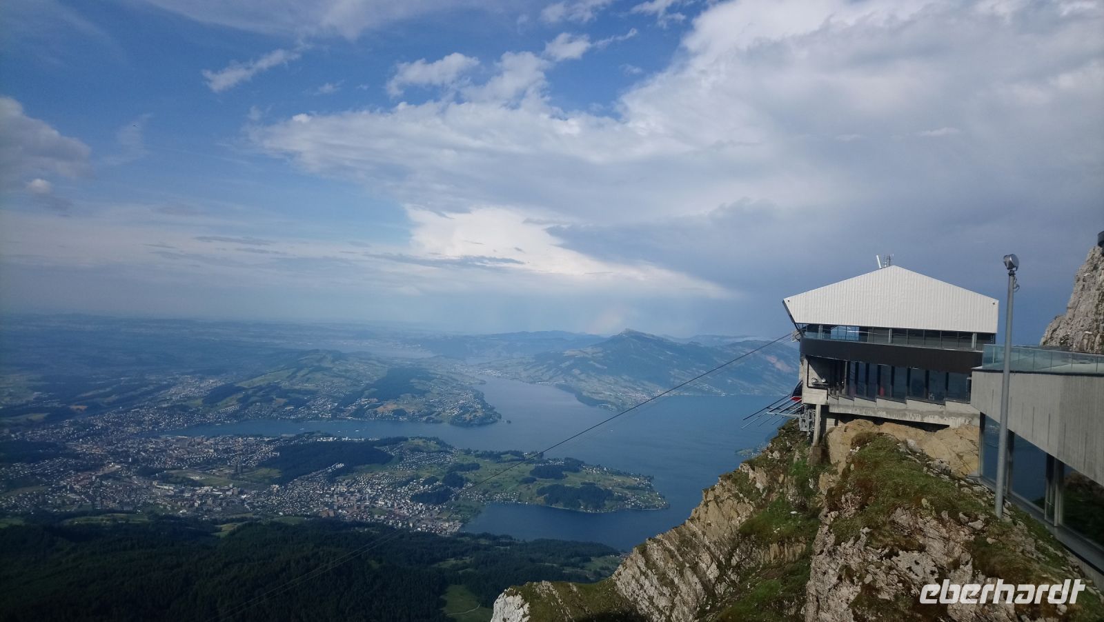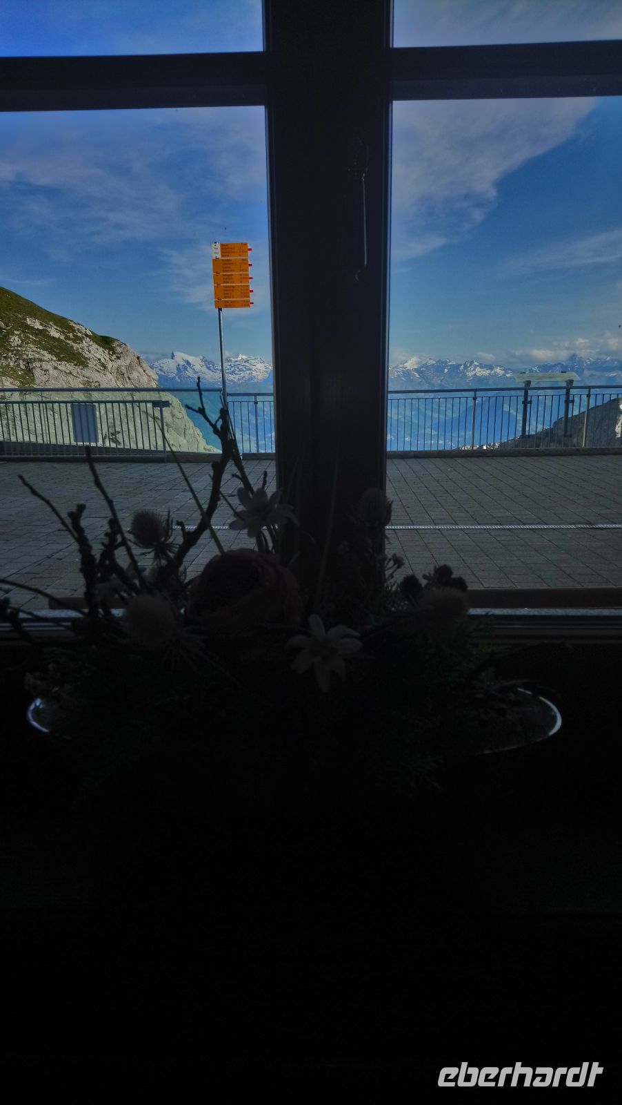 Aber wir wollten ja weiter: rechtzeitig trafen wir in Alpnachstadt zur Fahrt mit der Pilatusbahn ein. Die Pilatusbahn ist die steilste Zahnradbahn der Welt. Nunmehr sind die Wagen der dritten Generation in Betrieb - modern, komfortabel und mit neuer Weichentechnik auf bewährter 4,3 km langen Bergstrecke mit bis zu 48% Steigung - ein einmaliges Erlebnis. Kurz vor Ankunft am Berg gab Petrus uns dann nochmals zu verstehen, dass er auch Graupel und Gewitter kann. Wir konnten trotzdem trockenen Fußes einchecken - Zimmer im runden Hotel Bellevue haben die Form von Tortenstücken - gewöhnungsbedürftig. Doch das Wetter besserte sich. So konnten wir die Zeit bis zum Abendessen mit Erkundung des Areals auf der Pilatusberggruppe nutzen: Oberhaupt (2106 m hoch) und Esel (2119 m hoch) sind Bergbezeichnungen! Und: der Sonnenuntergang ist besonders vom Oberhaupt sehenswert, der Sonnenaufgang (die Zeit ist stets in der Zimmerkarte vermerkt) lässt sich am Besten vom Esel beobachten.
