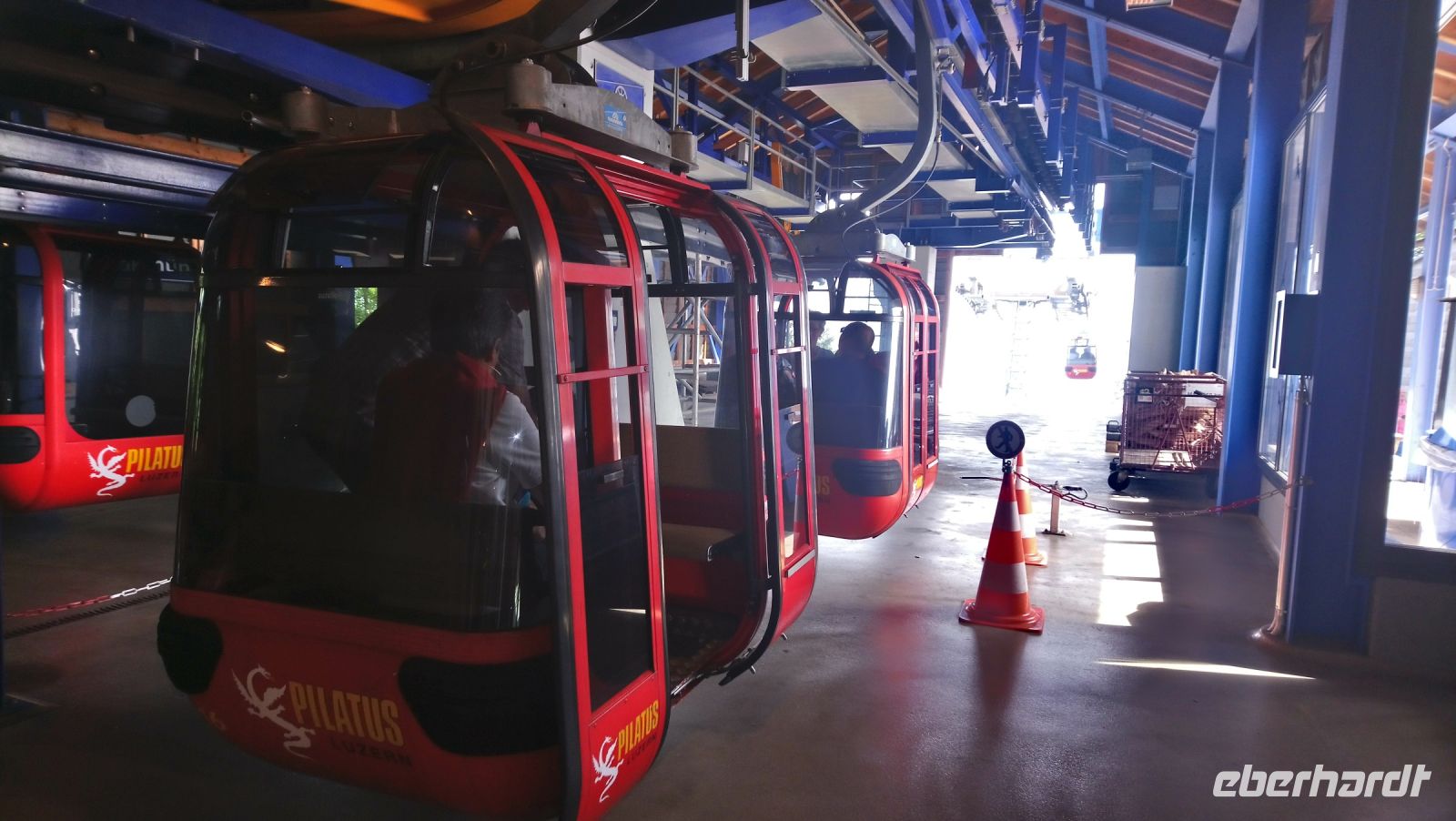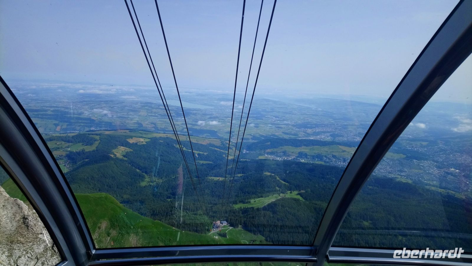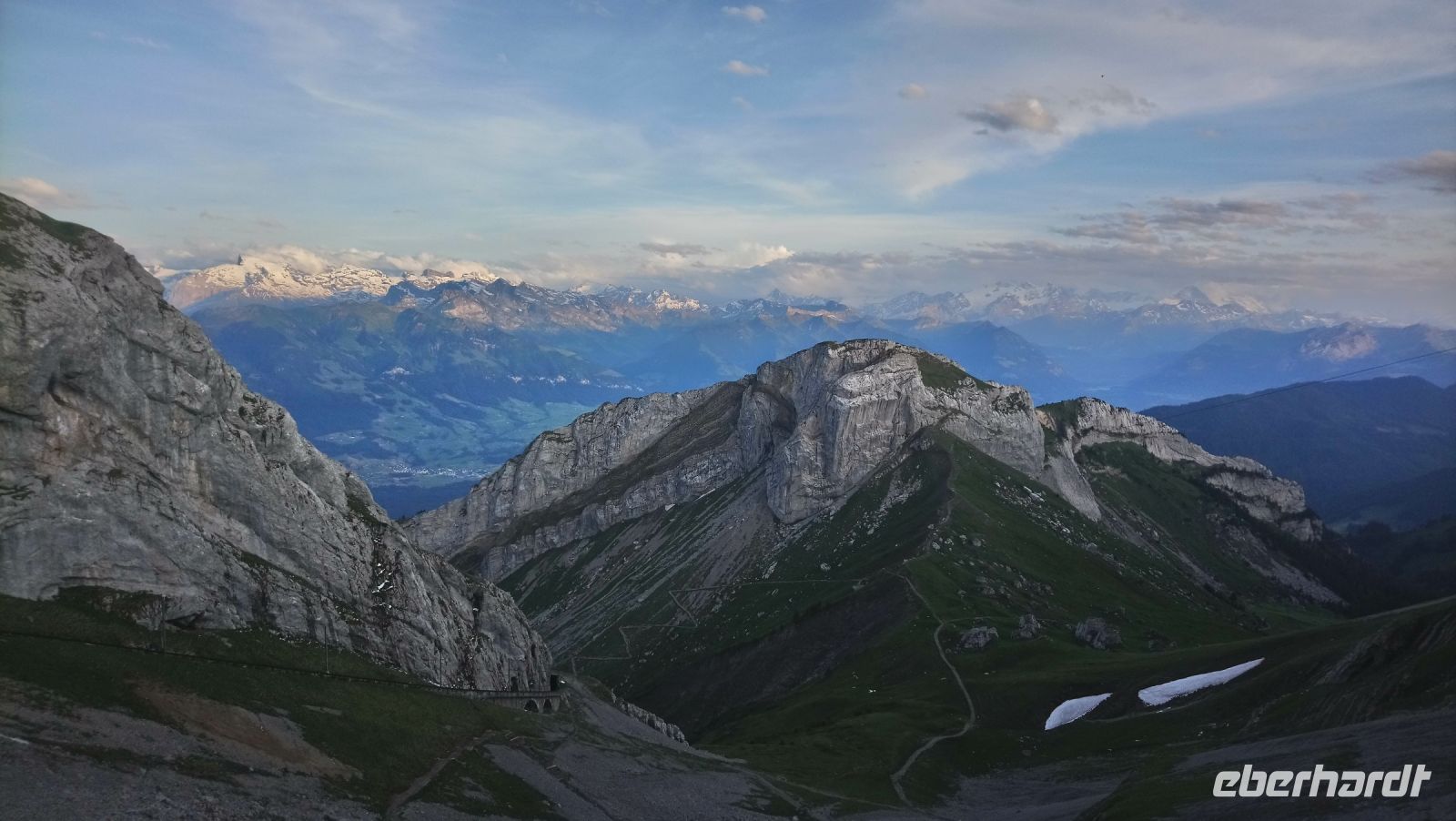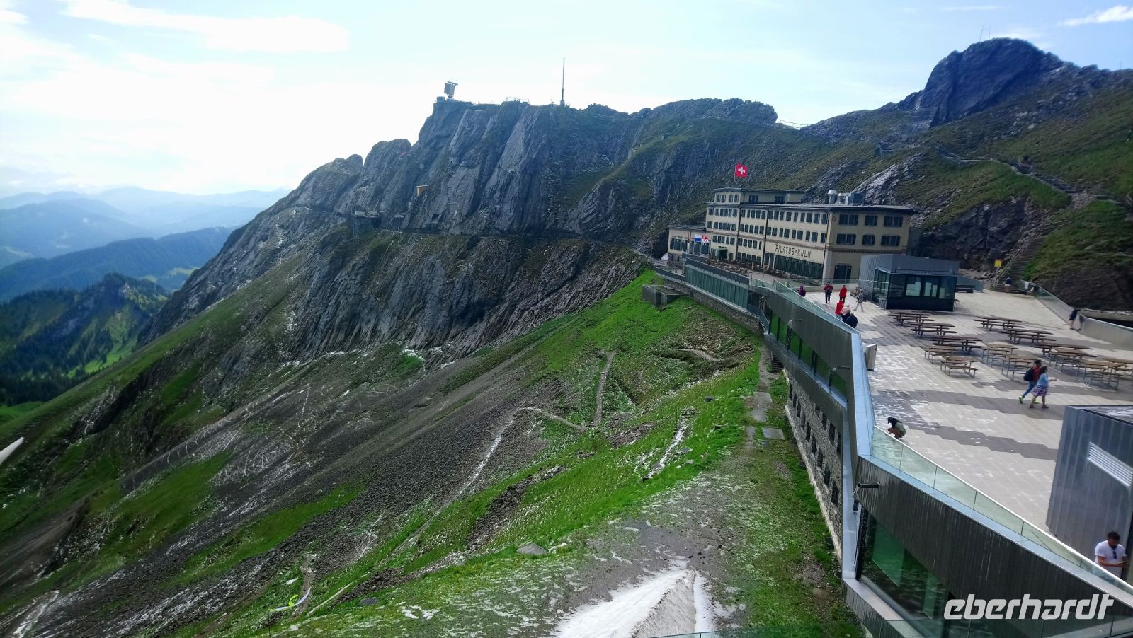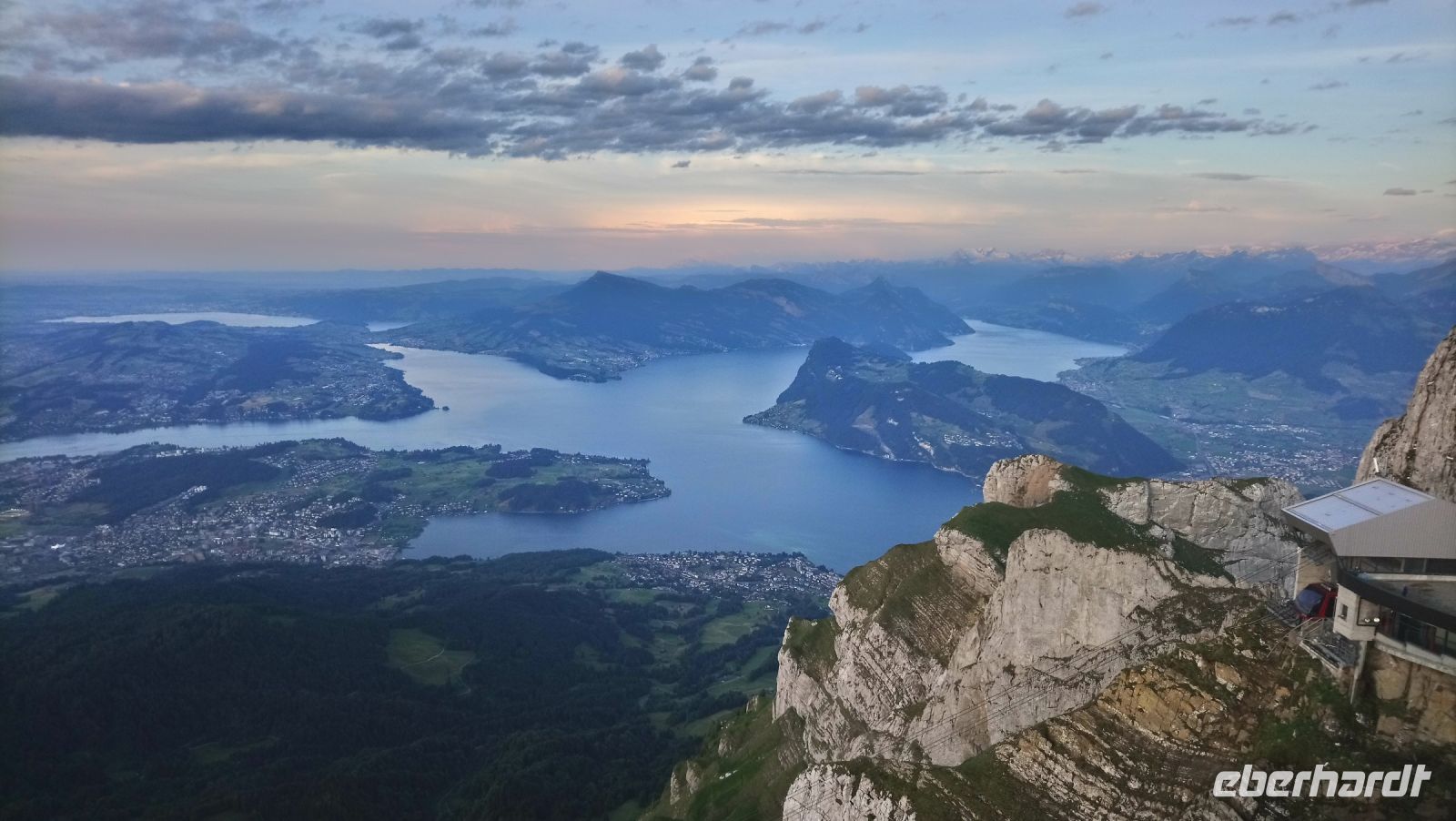 Aber wir wollten ja weiter: rechtzeitig trafen wir in Alpnachstadt zur Fahrt mit der Pilatusbahn ein. Die Pilatusbahn ist die steilste Zahnradbahn der Welt. Nunmehr sind die Wagen der dritten Generation in Betrieb - modern, komfortabel und mit neuer Weichentechnik auf bewährter 4,3 km langen Bergstrecke mit bis zu 48% Steigung - ein einmaliges Erlebnis. Kurz vor Ankunft am Berg gab Petrus uns dann nochmals zu verstehen, dass er auch Graupel und Gewitter kann. Wir konnten trotzdem trockenen Fußes einchecken - Zimmer im runden Hotel Bellevue haben die Form von Tortenstücken - gewöhnungsbedürftig. Doch das Wetter besserte sich. So konnten wir die Zeit bis zum Abendessen mit Erkundung des Areals auf der Pilatusberggruppe nutzen: Oberhaupt (2106 m hoch) und Esel (2119 m hoch) sind Bergbezeichnungen! Und: der Sonnenuntergang ist besonders vom Oberhaupt sehenswert, der Sonnenaufgang (die Zeit ist stets in der Zimmerkarte vermerkt) lässt sich am Besten vom Esel beobachten.