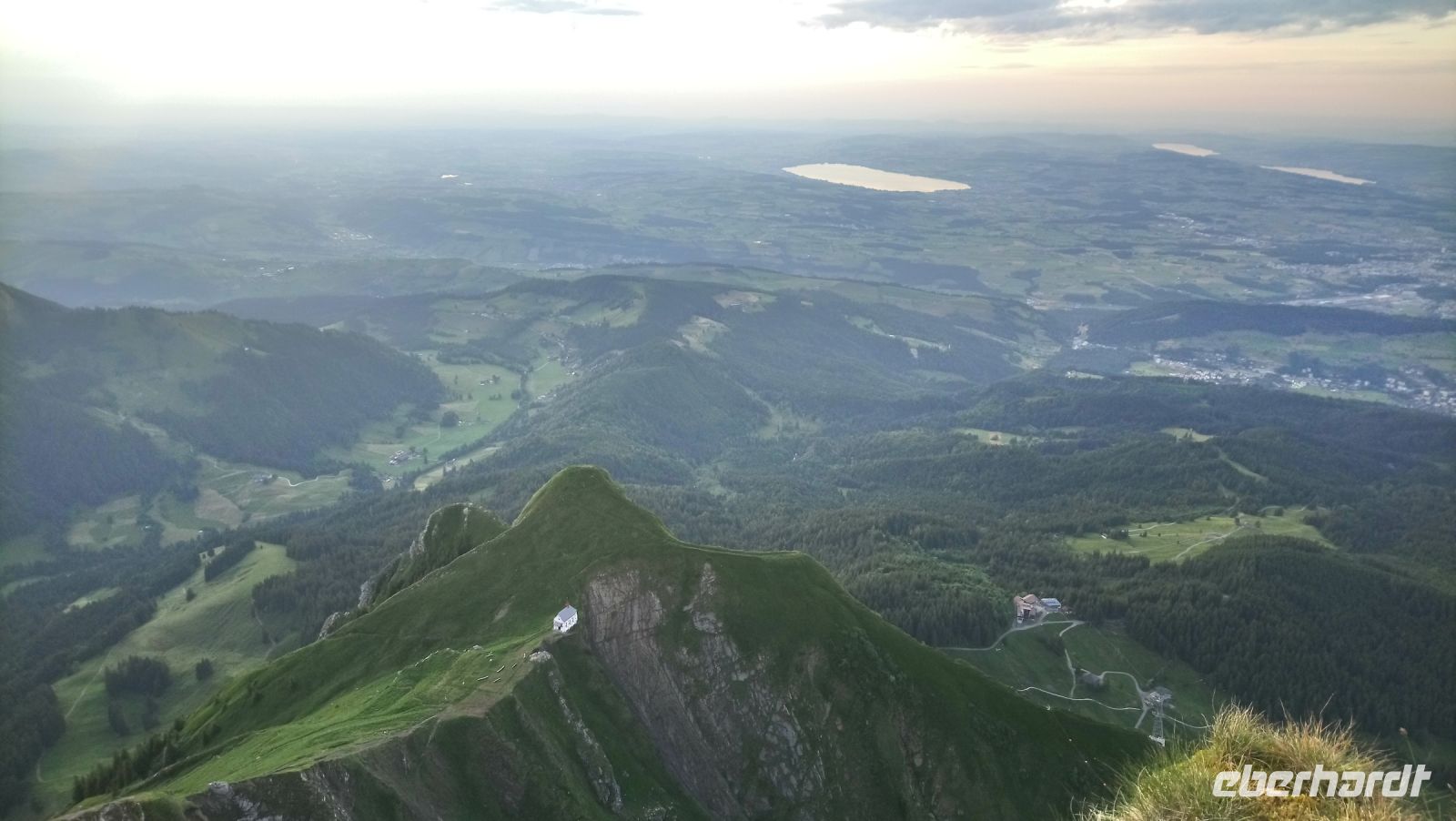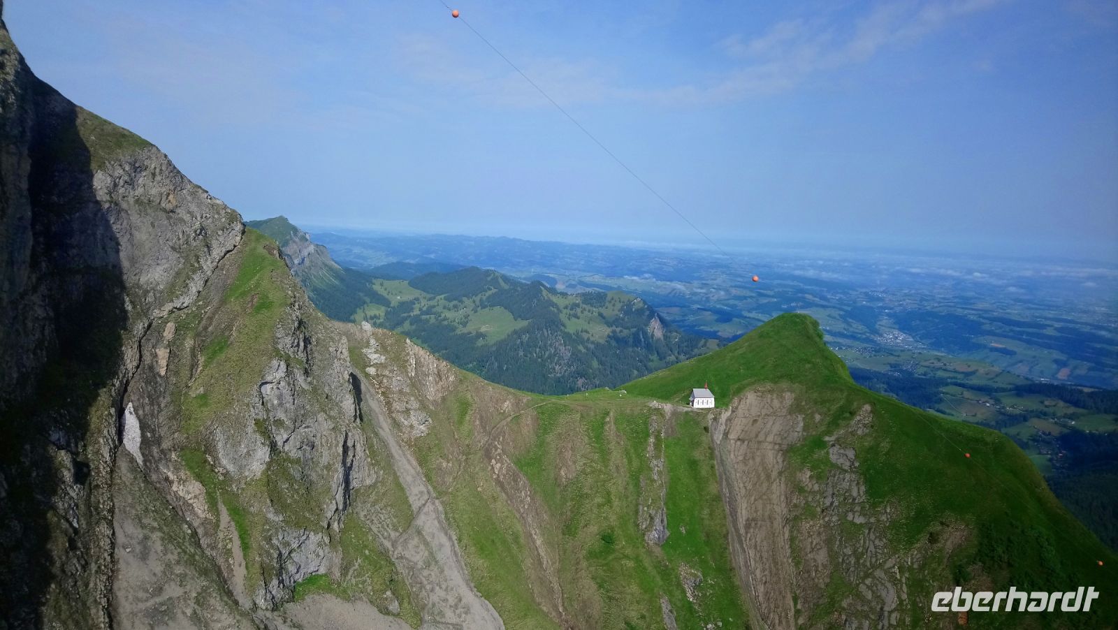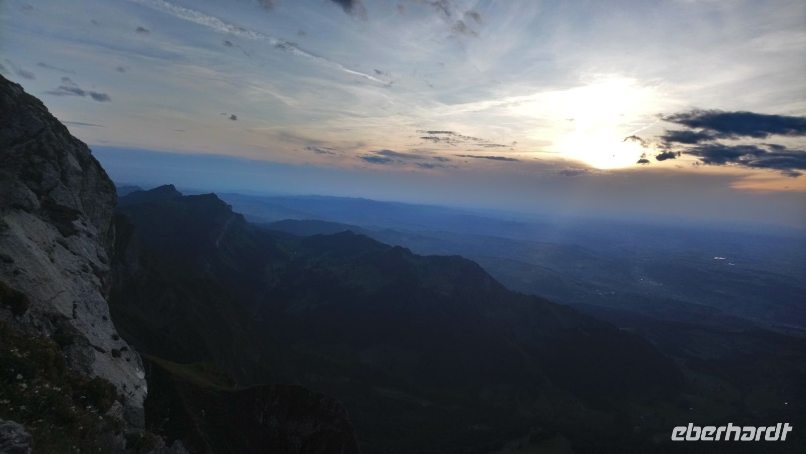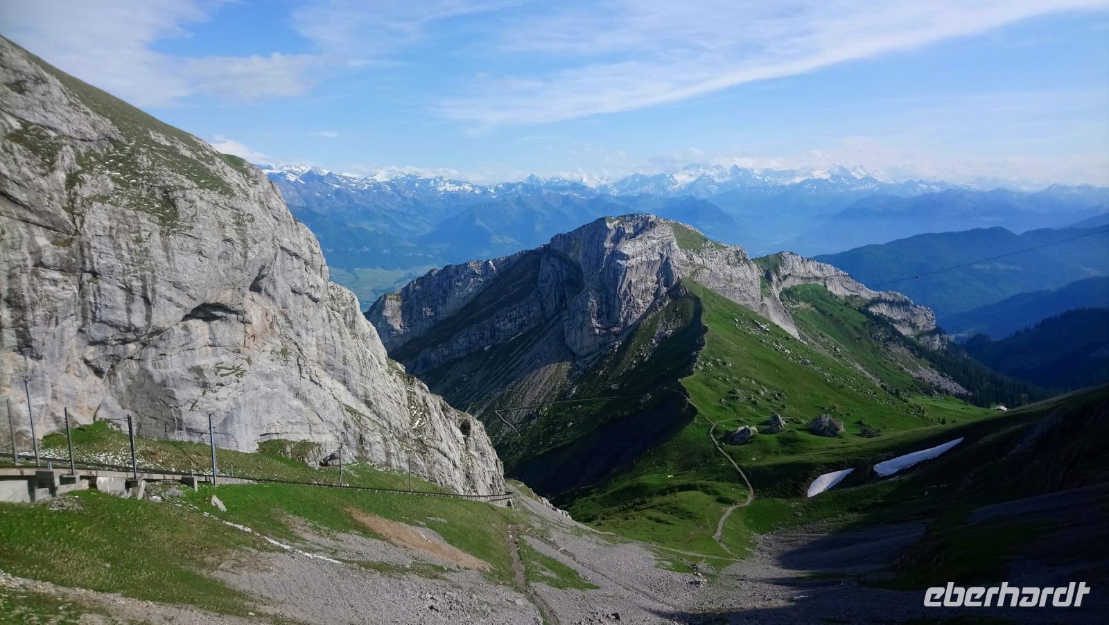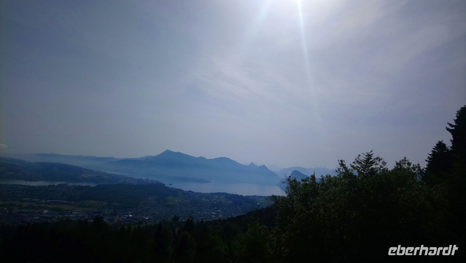Aber wir wollten ja weiter: rechtzeitig trafen wir in Alpnachstadt zur Fahrt mit der Pilatusbahn ein. Die Pilatusbahn ist die steilste Zahnradbahn der Welt. Nunmehr sind die Wagen der dritten Generation in Betrieb - modern, komfortabel und mit neuer Weichentechnik auf bewährter 4,3 km langen Bergstrecke mit bis zu 48% Steigung - ein einmaliges Erlebnis. Kurz vor Ankunft am Berg gab Petrus uns dann nochmals zu verstehen, dass er auch Graupel und Gewitter kann. Wir konnten trotzdem trockenen Fußes einchecken - Zimmer im runden Hotel Bellevue haben die Form von Tortenstücken - gewöhnungsbedürftig. Doch das Wetter besserte sich. So konnten wir die Zeit bis zum Abendessen mit Erkundung des Areals auf der Pilatusberggruppe nutzen: Oberhaupt (2106 m hoch) und Esel (2119 m hoch) sind Bergbezeichnungen! Und: der Sonnenuntergang ist besonders vom Oberhaupt sehenswert, der Sonnenaufgang (die Zeit ist stets in der Zimmerkarte vermerkt) lässt sich am Besten vom Esel beobachten.