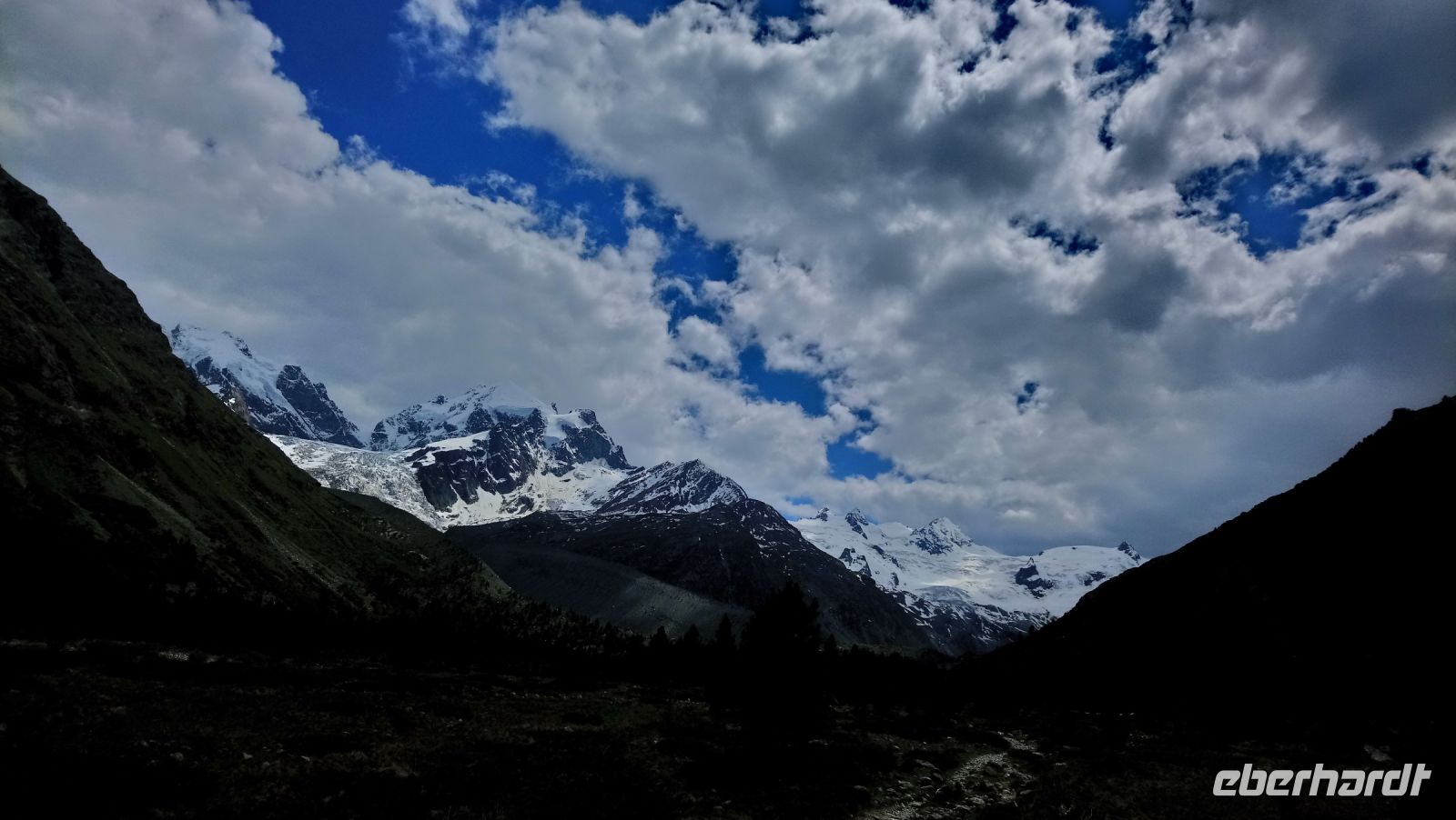 Schwerpunkt des heutigen Tages war die Fahrt mit dem Bernina-Express von Tirano (429 müM) nach Pontresina (1774 müM). Nach einem sehr guten Frühstück, u. a. mit dem bei Kennern beliebten Bündener Fleisch, ging es per Bus in Richtung Bernina-Pass. Vorher machten wir jedoch an einem Ausblick auf den Morteratzschgletscher halt. Wir sahen den Gletscher, allerdings ist er, wie auch viele andere Gletscher in der Schweiz, in einem immer weiter zurückgehenden erbarmungswürdigen Zustand. Die leichte Schneebedeckung hinterließ jedoch einen fotogenen Eindruck.