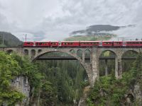 Einmal quer durch die Schweiz fahren wir heute, dabei zweimal einen Höhenunterschied von 1.400 Höhenmetern überwindend: Vom Engadin hinauf zum Albulapass, von dort hinunter nach Chur, durch die wilde Rheinschlucht Ruinaulta, von dort hinauf auf den Oberalppass und von dort wieder hinunter nach Brig. Pässehüpfen mit dem Zug.