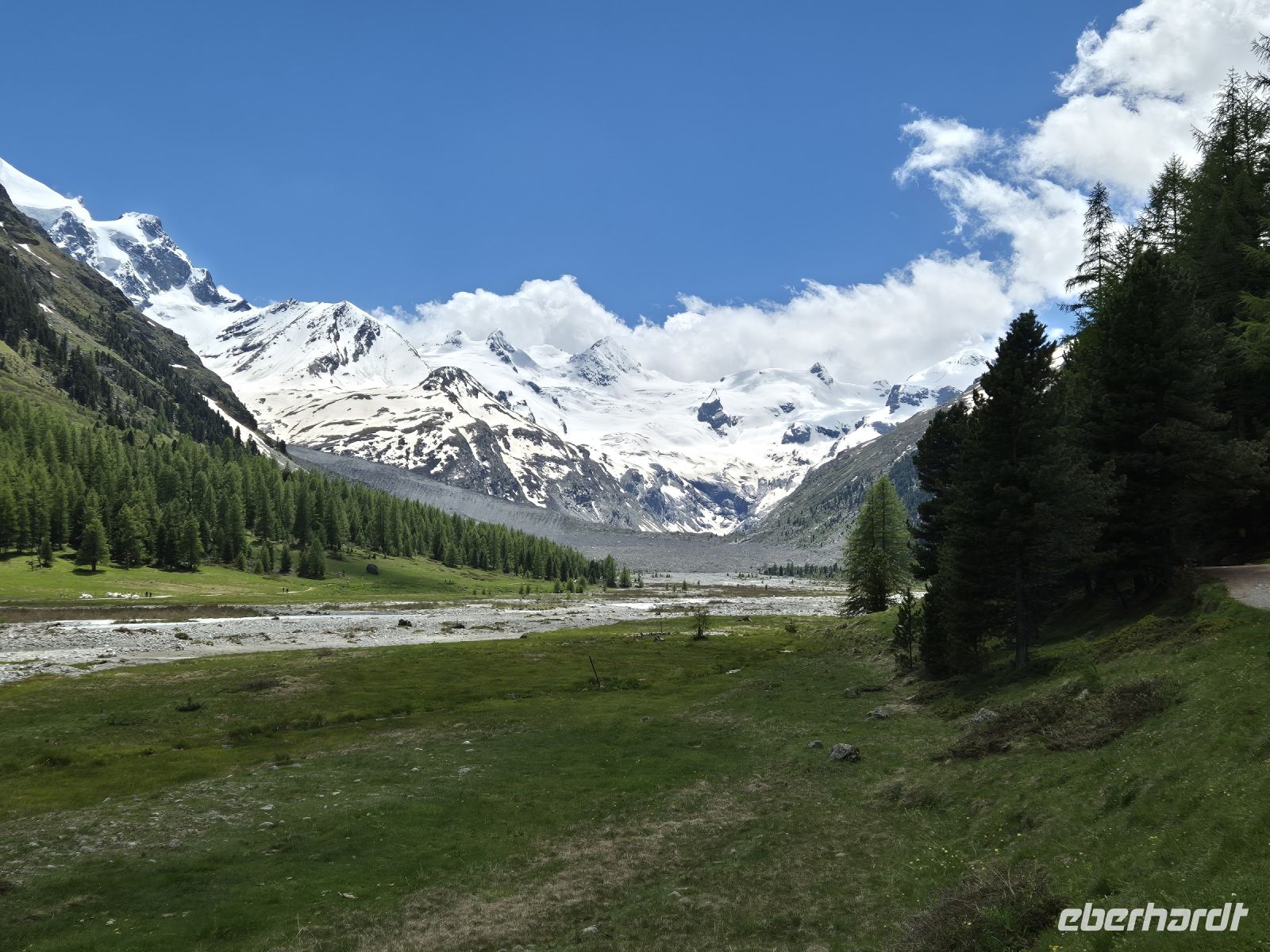 Wir fahren weiter in St. Moritz' kleine Schwester, nach Pontresina. Unser Ziel ist der Pferdeomnibus. Der wird heute zum Traktor-Omnibus, grassieren doch unter den 1-PSern Grippe und Fieber. Gesundheit geht vor, auch für Vierbeiner. Uns macht das nichts aus, wir nehmen auch das Traktortaxi bis zuhinterst im alpinen Val Roseg. Strahlend blauer Himmel macht unsere Wanderbeine munter und wir spazieren in Richtung Gletscher und Piz Roseg, in der Hoffnung, den einzigen Engadiner 4000er, den Piz Bernina, zu entdecken. Doch die Schneeschmelze, die uns stürmische kleine Bäche in den Weg schickt, und die Wolken über dem Gipfelgrat gebieten uns Einhalt. Wir wissen ja, dass wir den Berg, der dem Bernina-Pass seinen Namen gab (oder war es andersherum?), morgen auf der Fahrt mit dem Bernina-Express sehen werden. Die Stille, Schönheit und Erhabenheit der Bergwelt begeistern uns und wir tanken Erholung und Lebensfreude. Auf dem Rückweg entdecken wir sogar ein vorwitziges Murmeltier, dass sich auch durch den seltenen Traktor-Omnibus nicht aus der Ruhe bringen lässt. Es ist einfach schön hier!