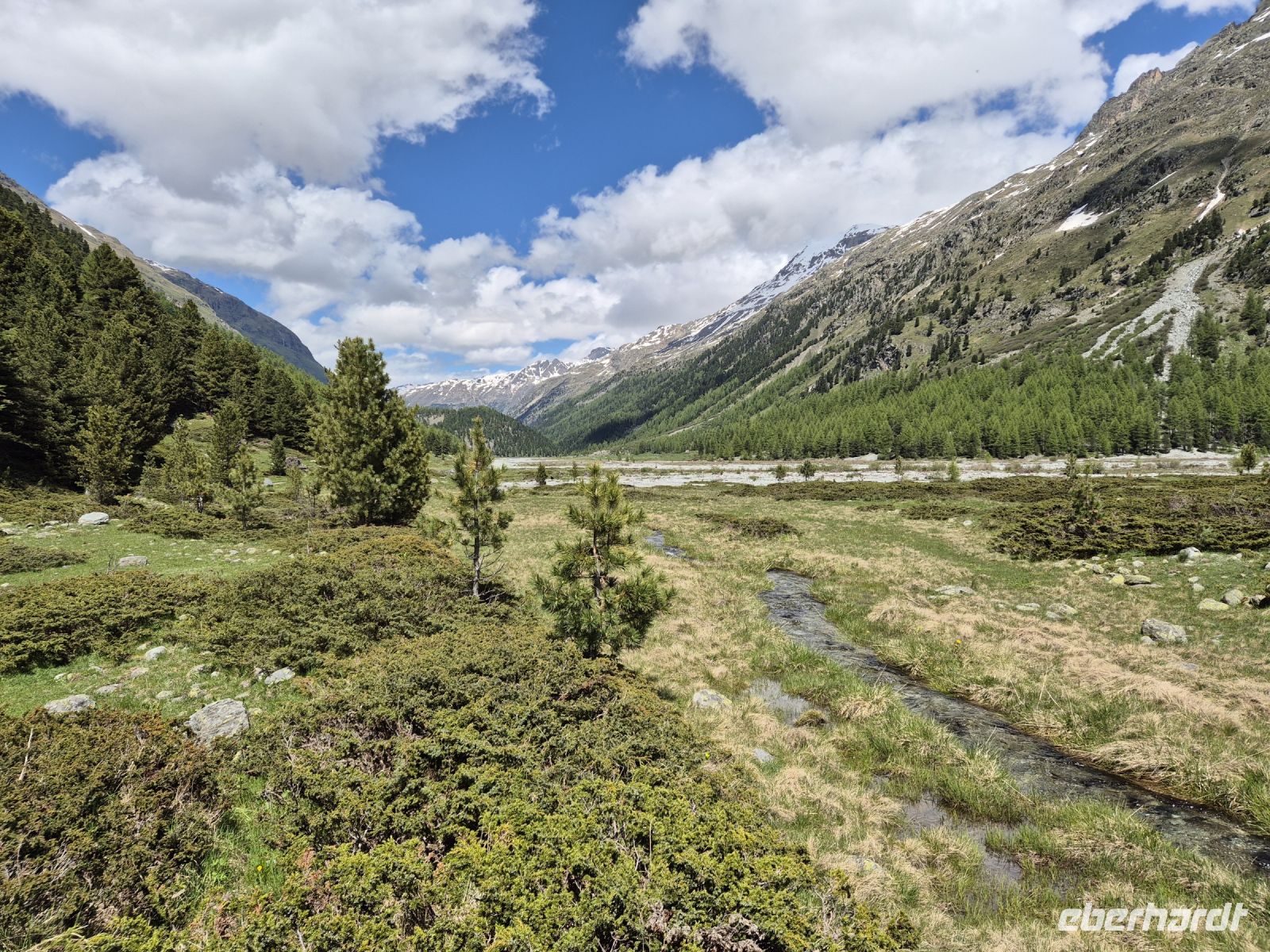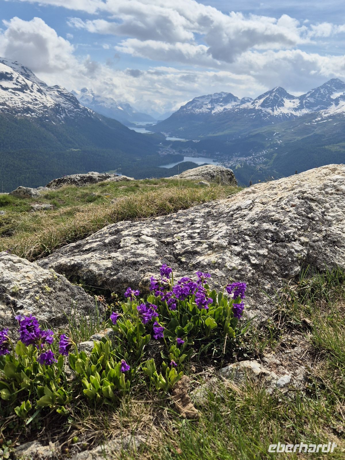 Mit unserem Elan und unserer guten Laune nutzen wir die Gästekarten, um eine Freifahrt mit der Standseilbahn hinauf auf Muottas Muragl zu machen. Stolze 2.453 Metern sind wir hoch. Die Sicht ist gut uns so schauen wir zurück zum Val Roseg, wo unser Traktor-Omnibus gestern unterwegs war, weiter über die Engadiner Seenplatte mit St. Moritzersee, Silvaplanersee und Silsersee, Piz Julier (der Gipfel zum gleichnamigen Pass) bis hinüber zum Biancograt des Piz Bernina und dem Piz Palü. Der berüchtigte Malojawind, der immer am Nachmittag über das Engadin hinwegdüst, windet uns um die Ohren, doch die Sonne ist nicht minder stark.