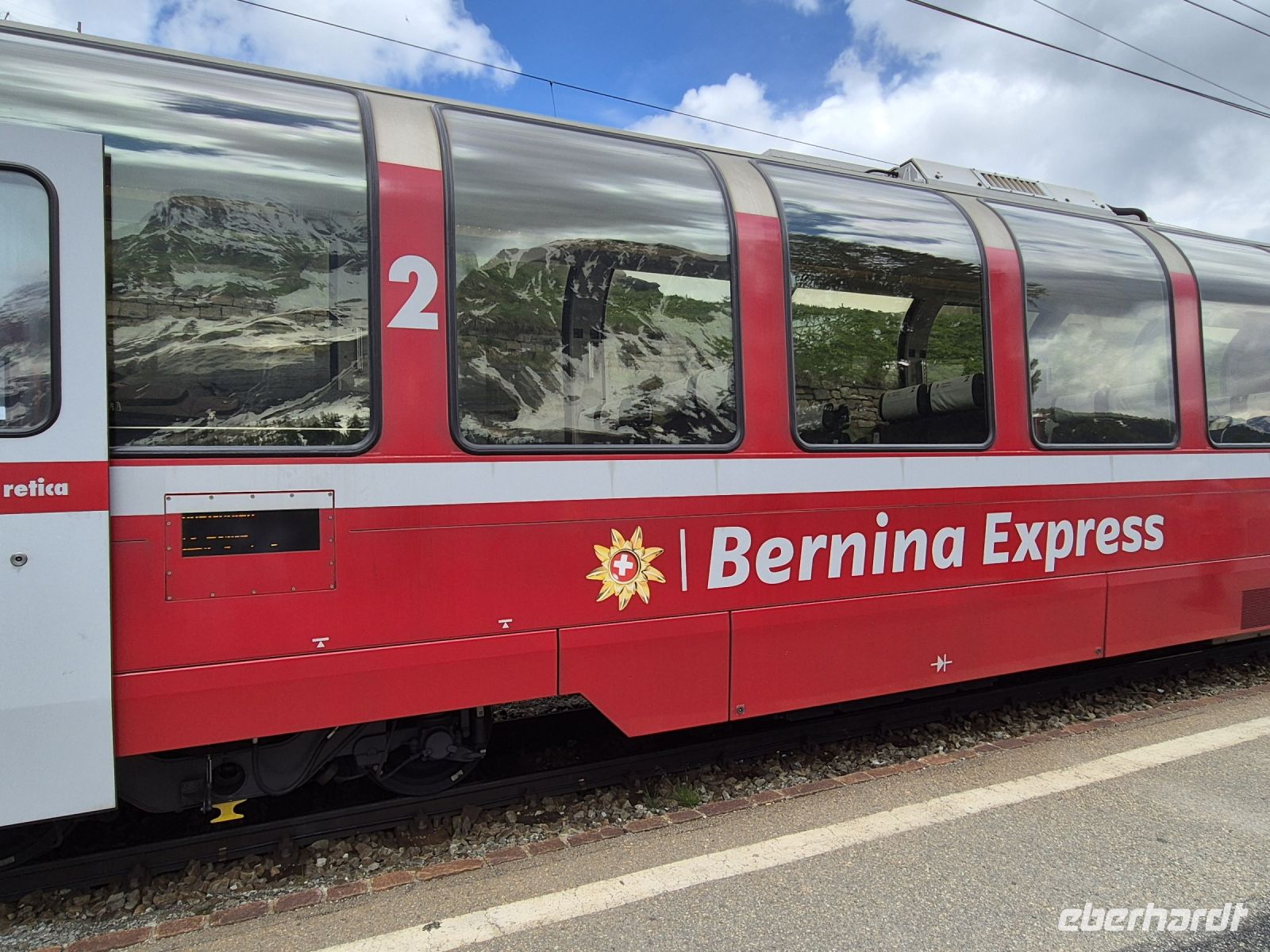 Dann ist es soweit. Unser Bernina-Express rollt in den Bahnhof ein. Schnell finden wir sich zu uns in den Wagon. Wir nutzen den Freiraum prompt und verteilen uns. Der Panoramawagen mit den übergroßen Fenstern macht die Fahrt zu einem eindrücklichen Erlebnis. Eindrücklich gilt gleichermaßen für die Ingenieurskunst, die diese Zugstrecke erst ermöglicht hat. Kein Wunder gehört dieser Streckenabschnitt der Rhätischen Bahn zum Weltkulturerbe der UNESCO. Kehrtunnel, Viadukte, Zahnradunterstützung, Kurven - es ist faszinierend. Auf der Alp Grüm, auf 2.091 Metern Höhe, haben wir zehn Minuten Pause. Wir steigen aus und bestaunen den Blick auf den Palü-Gletscher sowie zurück hinunter ins Puschlav. Bevor die Digitalisierung Einzug hielt, kündigte sich der Zug durch ein Pfeifen an, was auch auf gute Distanz zu hören war. Ein Pfeifen bedeutete dabei ein Heißgetränk für die Bahnarbeiter. Als wir wieder über den Berninapass tuckern, dem höchsten freien Bahnübergang der Alpen (und damit Europas), winkt uns der Piz Bernina nochmals zu.