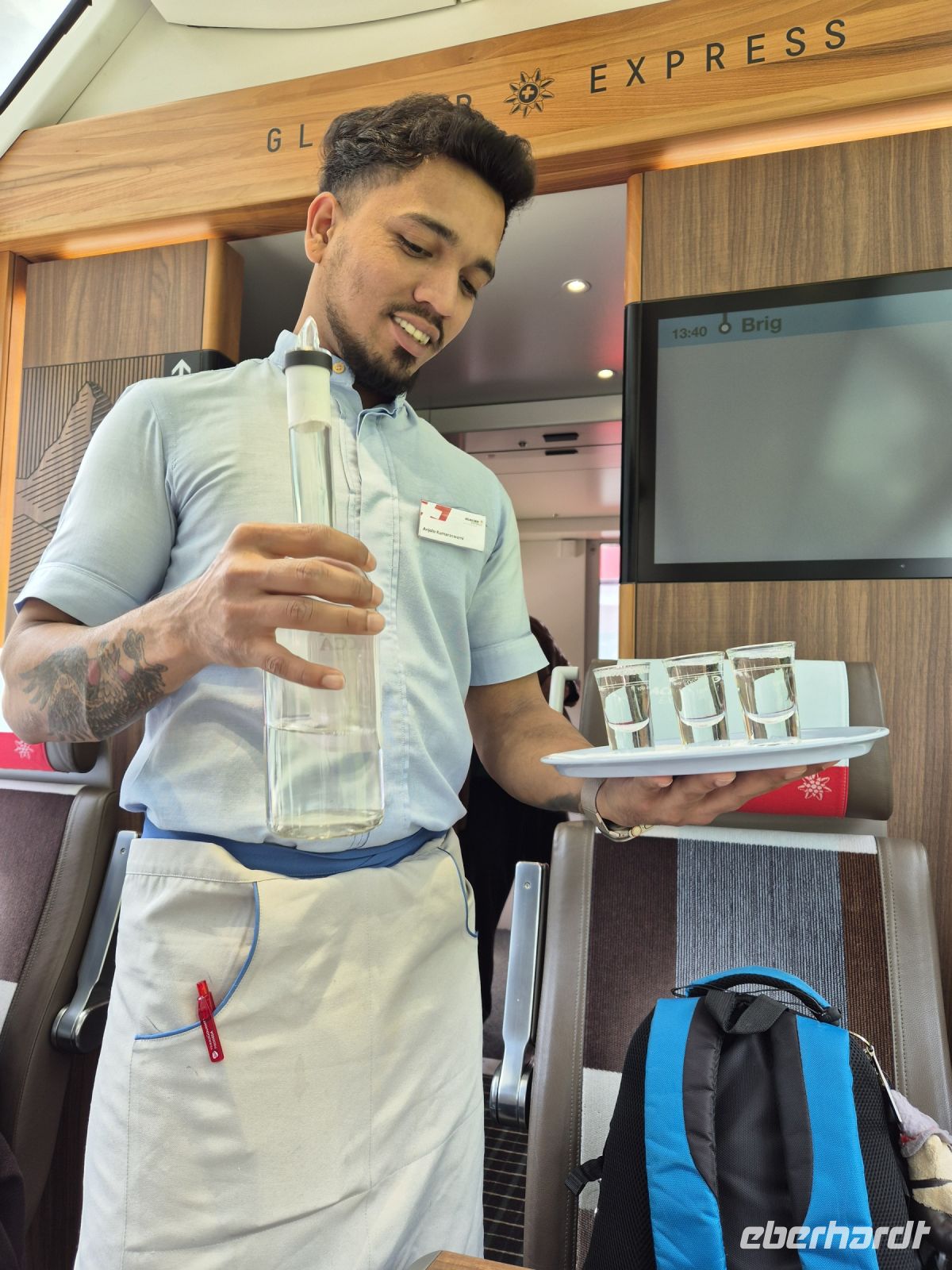 Wir sind begeistert vom Service im Zug und dem leckeren Essen. Gleichermassen gut unterhalten die Informationen, die entlang der Strecke vermittelt werden. Wir erfahren, dass die Erfolgsgeschichte von Charles Ritz, dem Hotelkönig, einst im Goms begann und kennen nun das Rezept für Capuns, dem traditionellen Bündner Gericht.