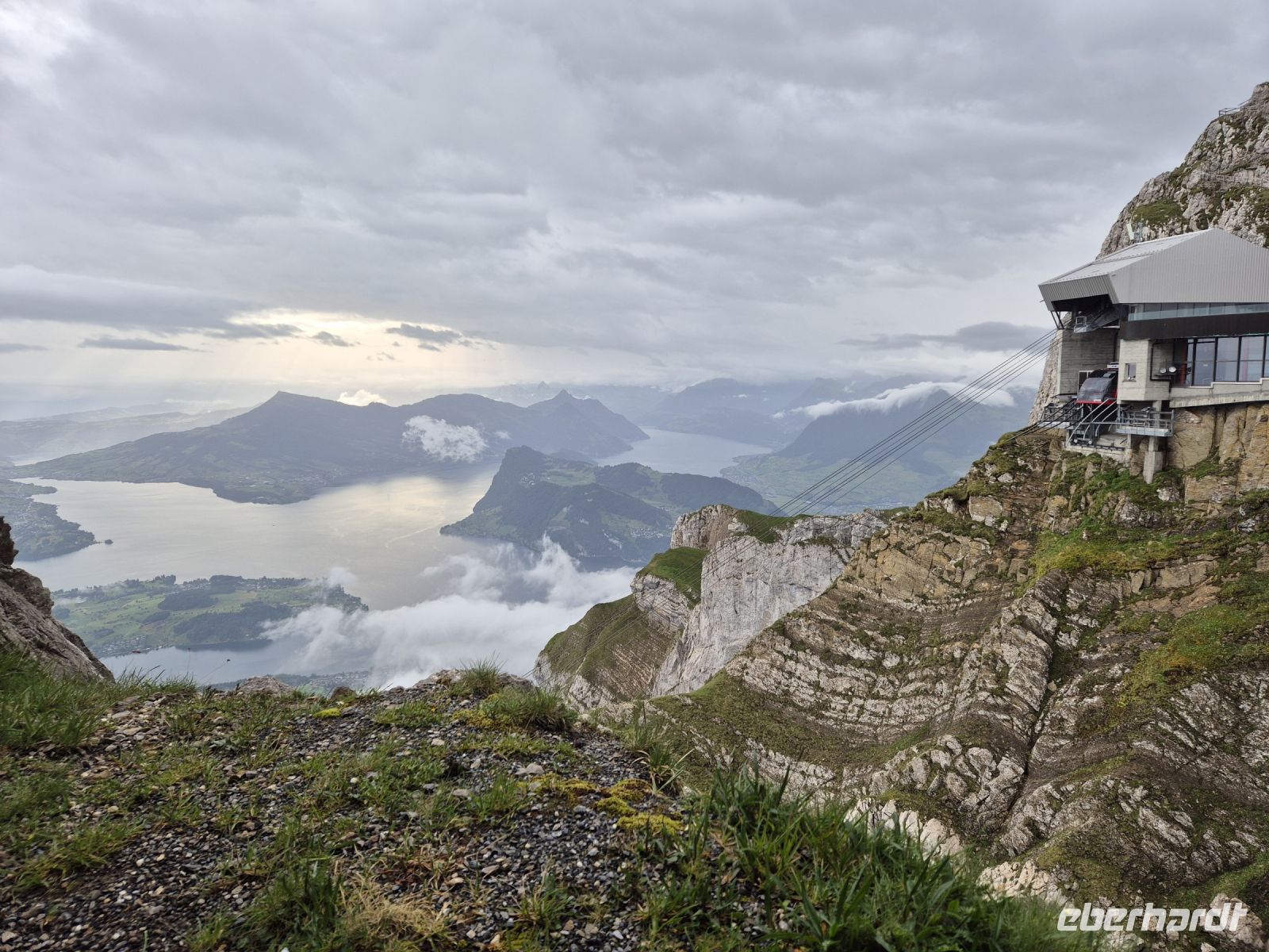 Der Pilatus, einer dieser schweizerischen Paradeberge, hüllt sich in Wolken. Ein Blick auf die Webcam verheißt nichts Gutes. Wir haben noch kurz Zeit am Alpnachersee - bei Sonnenschein - zu schlendern. Unsere Bahnfreunde filmen mit Leidenschaft die Ankunft und Abfahrt der steilsten Zahnradbahn der Welt. Diese bringt uns auf 7.000 Fuß oder 2.116 Meter Meereshöhe.