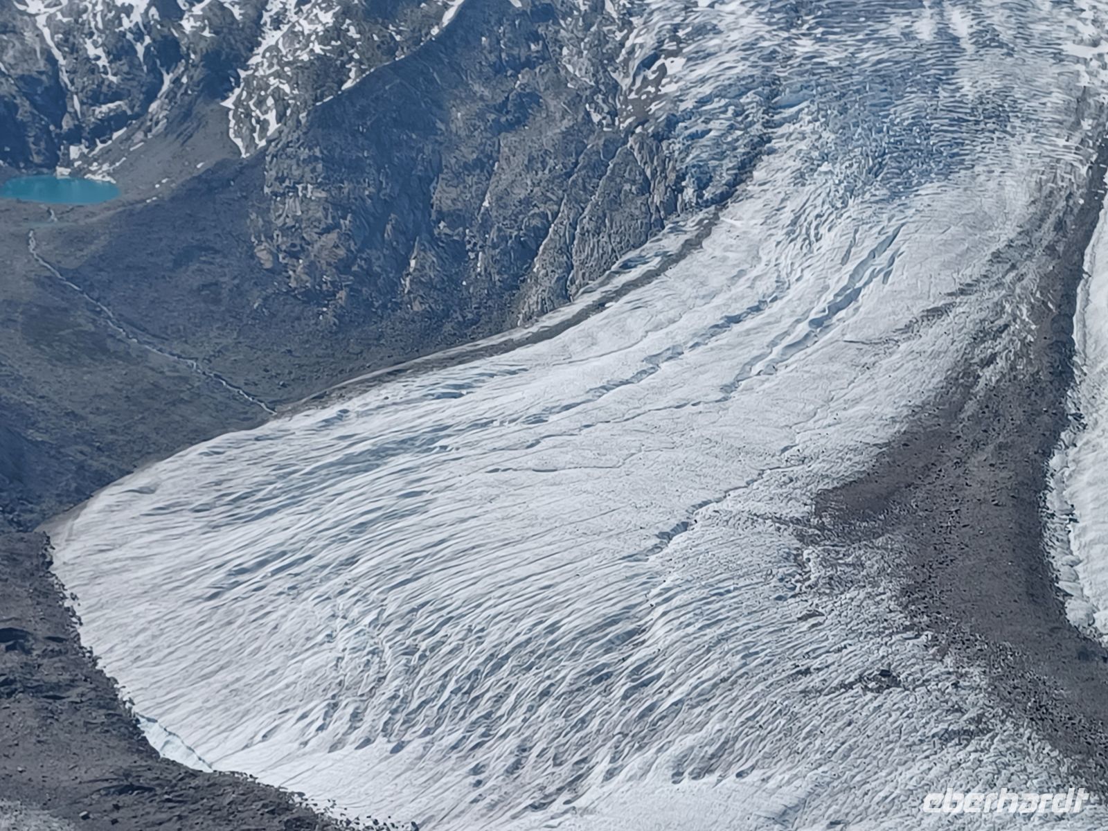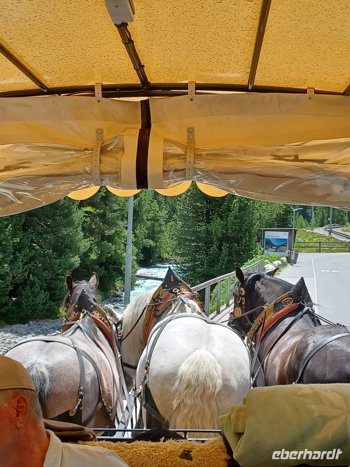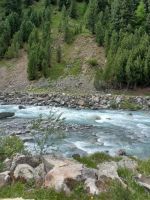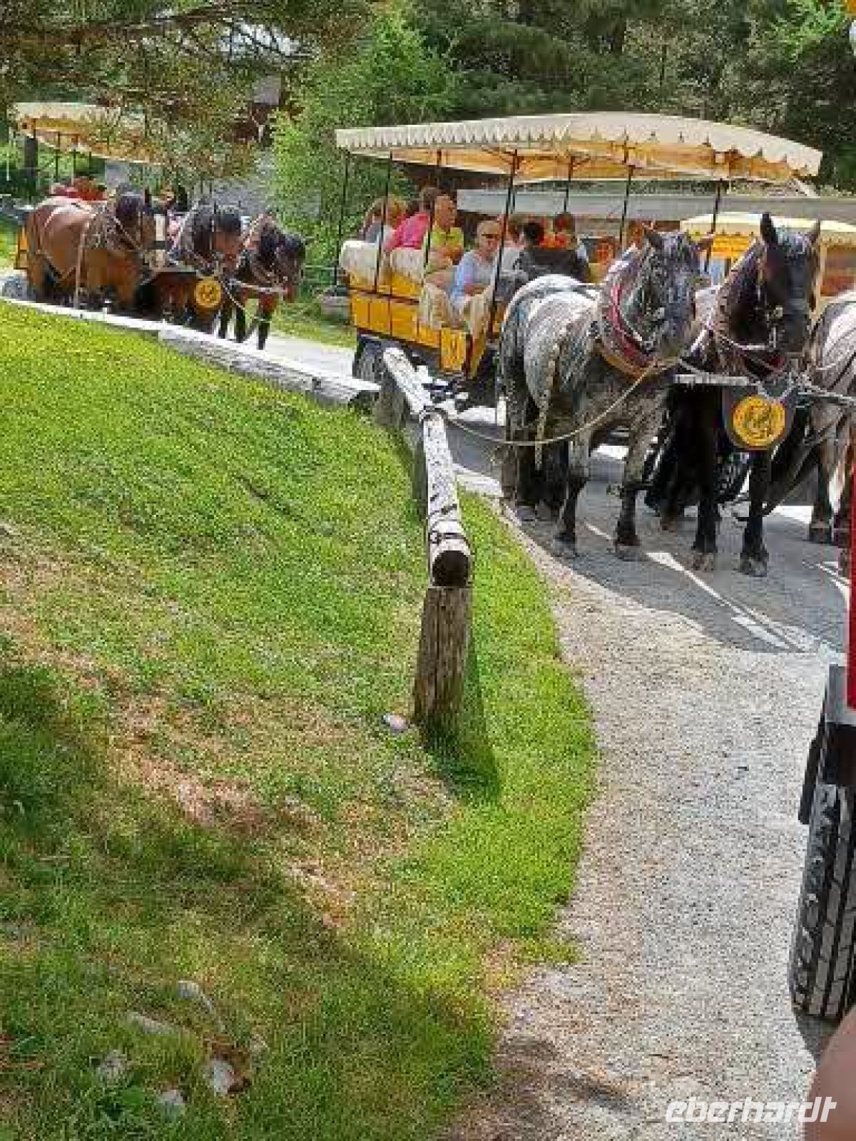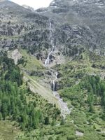 Wir fahren weiter u. sind in 15 Minuten in Pontresina, wo am Nachmittag eine Fahrt mit drei Kutschen durch das Val Roseg startet. Es ist ein alpines Hochtal von 12 km, dicht bewaldet mit gewaltigen, abgestürzten Felsbrocken am Wegesrand, weidenen Kühen u. wird von der Ova da Roseg durchflossen. Am Ende des Tals liegt am Nordhang der Berninagruppe der Roseggletscher. Hier ist das Ziel der Fahrt erreicht. Die Pferde werden abgespannt u. werden versorgt nach der anstrengenden Fahrt mit den Gästen. Wir dagegen sollten uns jetzt ein bischen bewegen, eine leichte Wanderung an den Wasserläufen entlang unternehmen, bevor wir uns an das leckere Eis-u. Kuchenbufett auf der Sonnenterrasse des Gasthauses heranwagen. Die Gästezahl ist überschaubar u. so genießen wir bei einem Aprikosenauflauf, einer Engadiner Nußtorte oder einer Eisportion - auch gern beides - die Sonne u. den herrlichen Blick über das Talende auf den Gletscher.