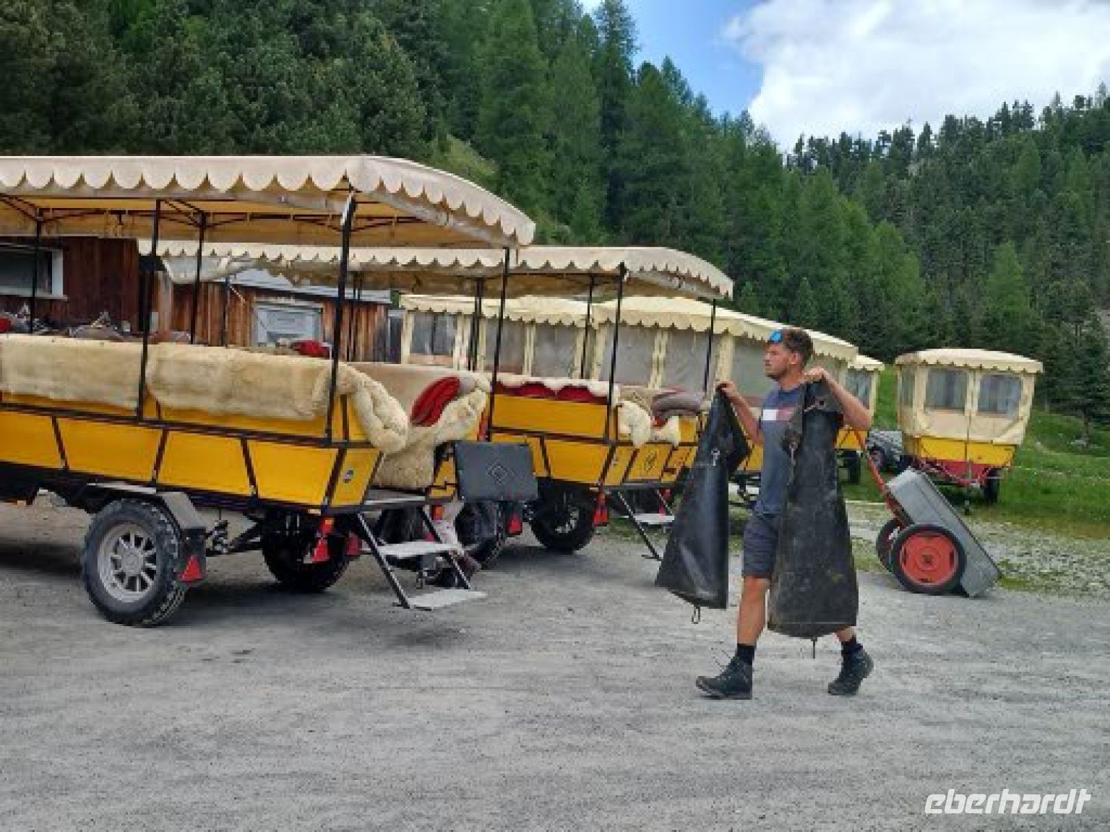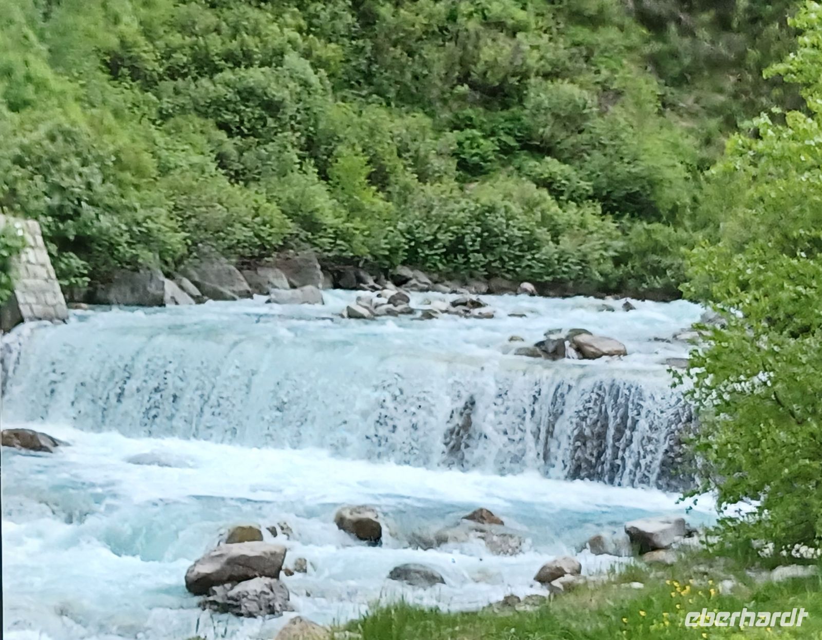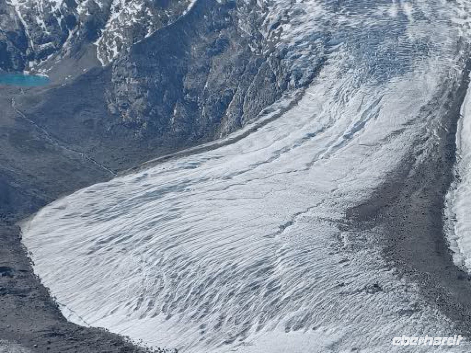 Wir fahren weiter u. sind in 15 Minuten in Pontresina, wo am Nachmittag eine Fahrt mit drei Kutschen durch das Val Roseg startet. Es ist ein alpines Hochtal von 12 km, dicht bewaldet mit gewaltigen, abgestürzten Felsbrocken am Wegesrand, weidenen Kühen u. wird von der Ova da Roseg durchflossen. Am Ende des Tals liegt am Nordhang der Berninagruppe der Roseggletscher. Hier ist das Ziel der Fahrt erreicht. Die Pferde werden abgespannt u. werden versorgt nach der anstrengenden Fahrt mit den Gästen. Wir dagegen sollten uns jetzt ein bischen bewegen, eine leichte Wanderung an den Wasserläufen entlang unternehmen, bevor wir uns an das leckere Eis-u. Kuchenbufett auf der Sonnenterrasse des Gasthauses heranwagen. Die Gästezahl ist überschaubar u. so genießen wir bei einem Aprikosenauflauf, einer Engadiner Nußtorte oder einer Eisportion - auch gern beides - die Sonne u. den herrlichen Blick über das Talende auf den Gletscher.