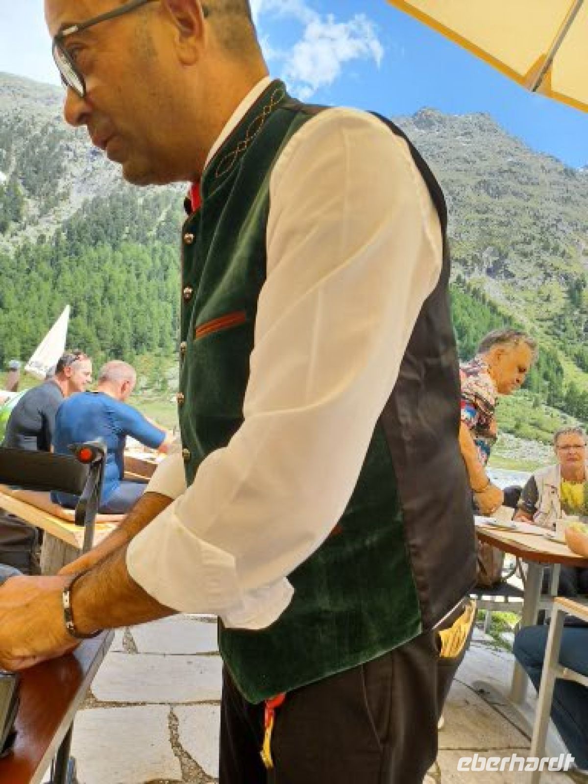 Unser letzter Abend im "Edelweiß": Wir erhalten Teilnahmeurkunden als Nachweis für die Fahrt durch das UNESCO-Welterbe. Nachdem wir wieder vorzüglich gespeist haben, verabschiedet sich die Hotelchefin von Tisch zu Tisch gehend, u. wir überreichen dem Maitre d´hotel ein kleines Dankeschön für den Service in Restaurant u. Küche. Dabei erfahren wir, dass 15 Nationalitäten unter den Angestellten vertreten sind, der Chefkoch ein echter Berliner ist u. schon viele Jahre dabei ist.