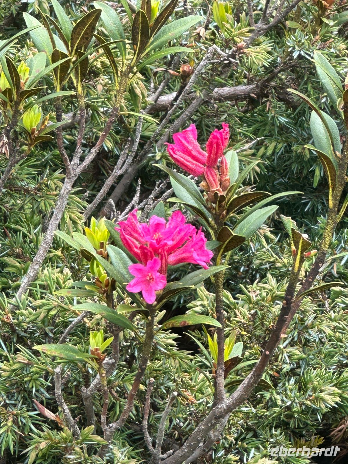 Pferd u. Mensch sind gestärkt, u. es kann weitergehen, retour durch den Wald bei herrlicher Luft u. blumigen Entdeckungen: da leuchten Alpenrosen, Enzian u. der gelbe scharfe Hahnenfuß. Eine springende Gäms ist im Dickicht flüchtig zu sehen.