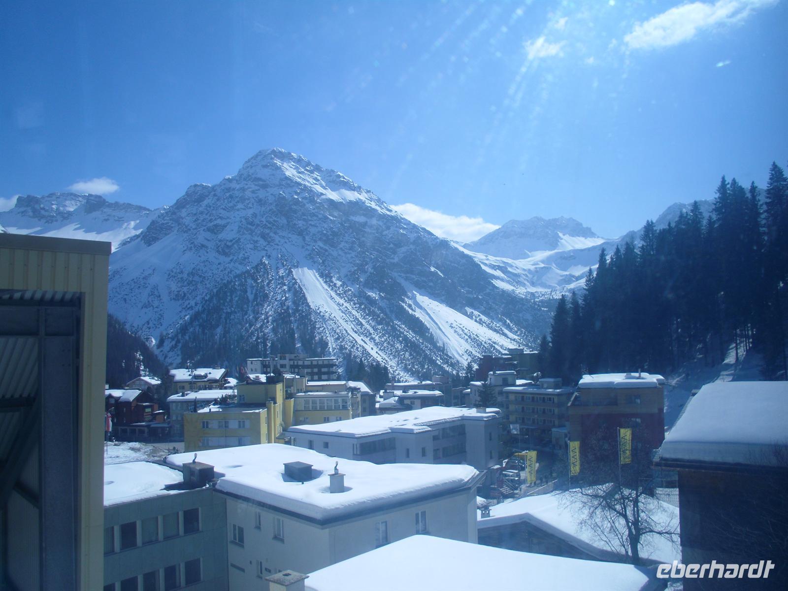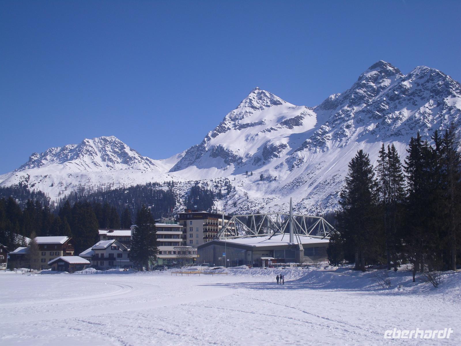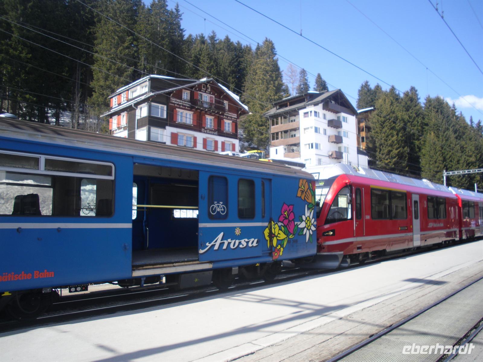 Gemächlich wie eine Strassenbahn zuckelt der Arosa Express durch Chur, vorbei an Stadtmauer, Malteserturm und Obertor, dem Wahrzeichen der Bündner Hauptstadt. Doch schon bald ist es vorbei mit dem Stadtbummel auf Schienen. An der Stadtgrenze wandelt sich der leuchtend blaue Arosa Express nämlich zur Gebirgsbahn und windet sich durchs wilde Schanfigger Tal hinauf nach Arosa. Ein bedeutender Ort auf dieser Fahrt ist Langwies. Er verdankt seinen Bekanntheitsgrad in erster Linie der Rhätischen Bahn. Der Langwieser Viadukt überspannt unterhalb des Ortes in 62 Meter Höhe die Plessur und ist mit 285 Meter die längste Brücke im Bündner Bahnnetz. Nach einer 1-stündigen Fahrt mit dem Arosa-Express kommen wir in Arosa an. Der Ort liegt am Ende des Schanfiggs in einem Talkessel. Vom Charakter der einstiegen Walser-Siedlung, die im 14. Jahrhundert entstand, ist im heutigen Zentrum nichts mehr zu spüren. Stattdessen bestimmt die Architektur aus der Zeit um 1900 das Ortsbild.