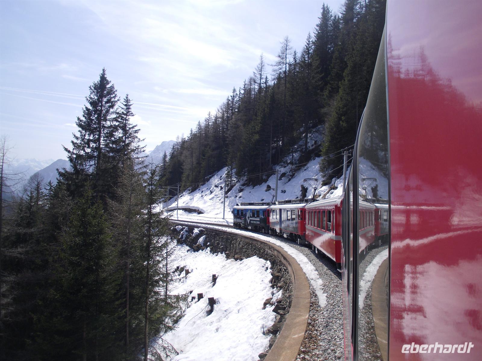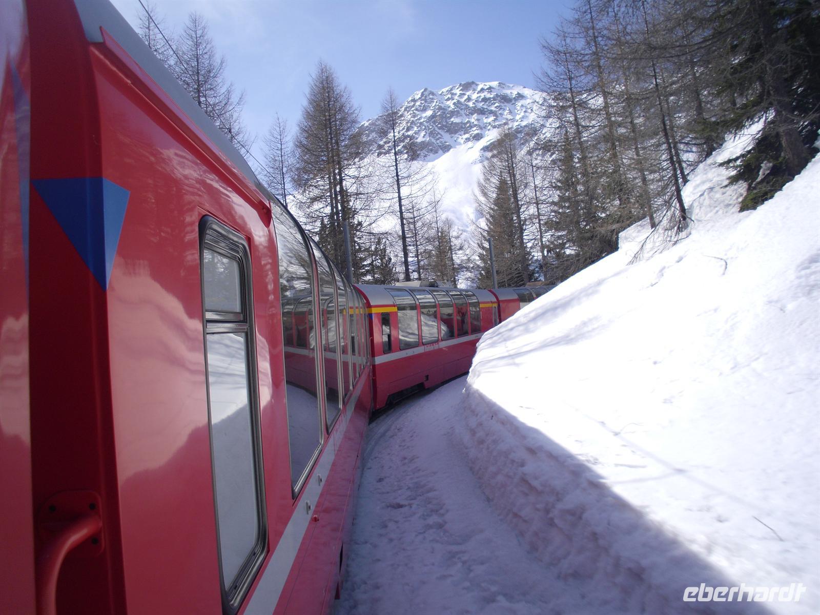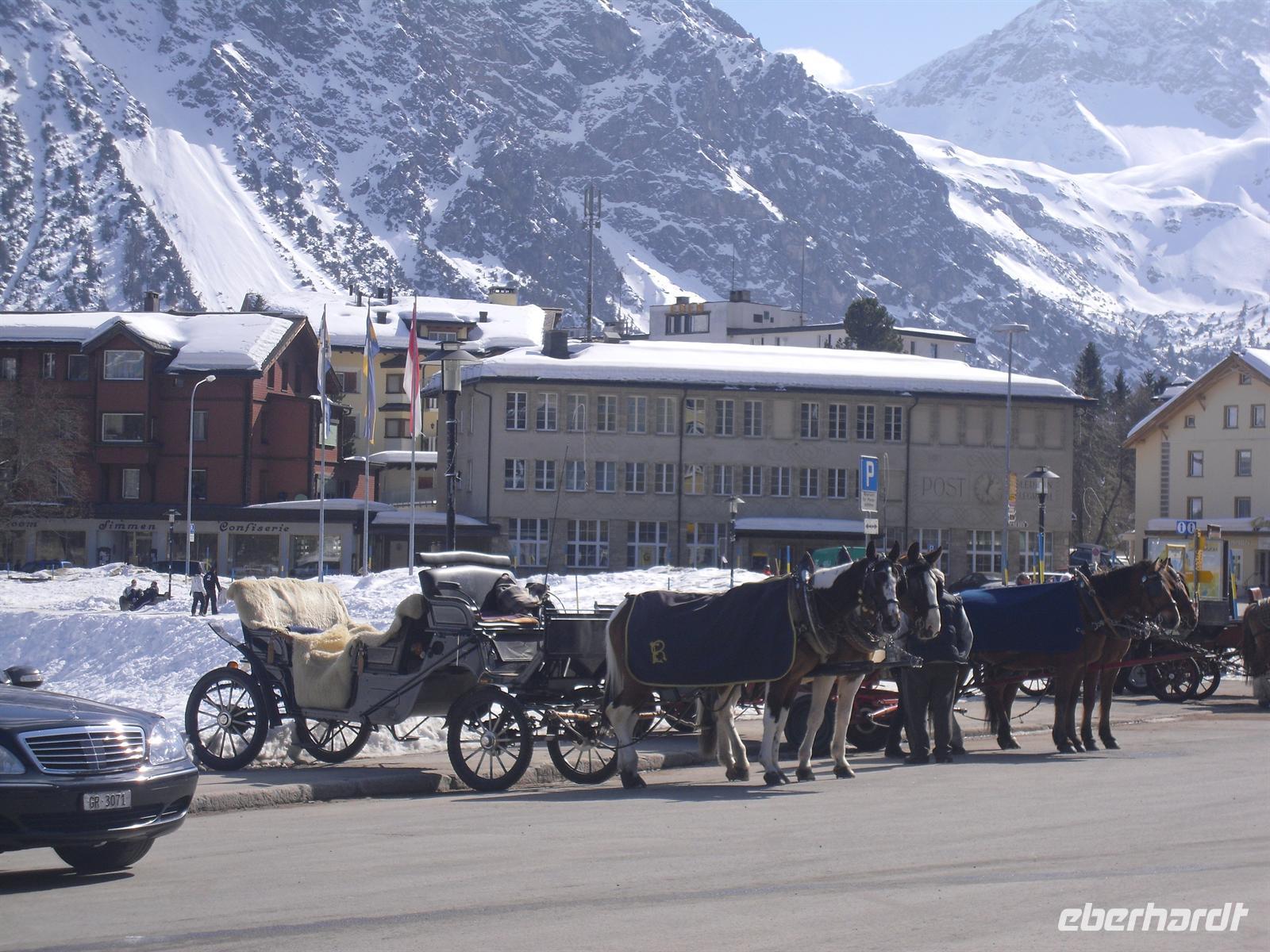 Heute steht bereits der nächste Höhepunkt dieser Reise, die Fahrt mit dem Bernina-Express, auf dem Programm. Mit unserem Bus geht es über den 2.284 Meter hohen Julier-Pass vorerst nach St. Moritz. St. Moritz ist der Inbegriff des Engadins schlechthin, bezeichnet sich selbst als "Top of the World" und hat als erster weltweit seinen Namen als Marke rechtlich schützen lassen. Hier verbringen die Schönen und Reichen ihren Winterurlaub, hier trifft man die höchste Dichte an Luxushotels der Schweiz, hier pulsiert im Winter das Leben... Aber welch eine Ernüchterung bei der Einfahrt in den Ort - gesichtslose Bauten aus der 60er und 70er Jahren wirken eher abstoßend. Alte Engadiner Häuser und verschwiegene Winkel findet man leider kaum noch. Wir sind uns alle einig - man muss den Ort zwar gesehen haben, aber wir fahren letztendlich schnell weiter und wollen nach Pontresina.