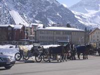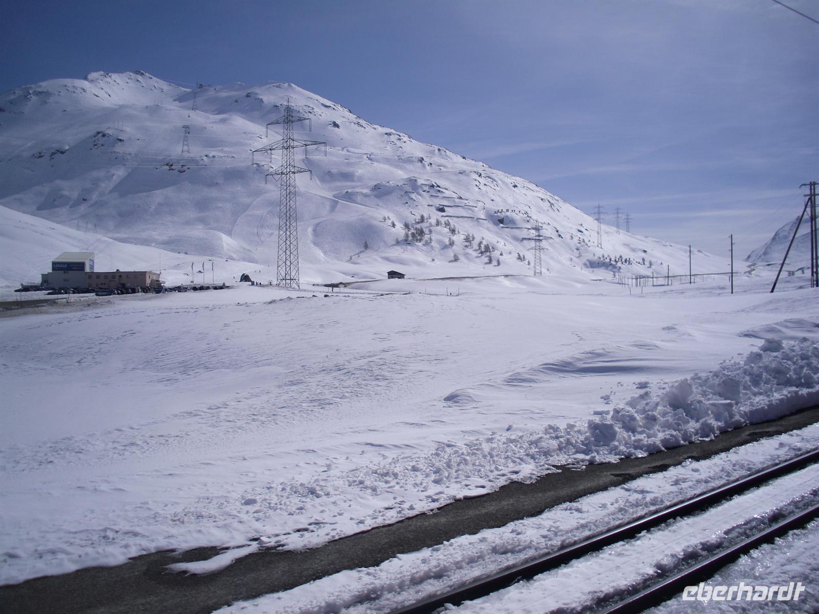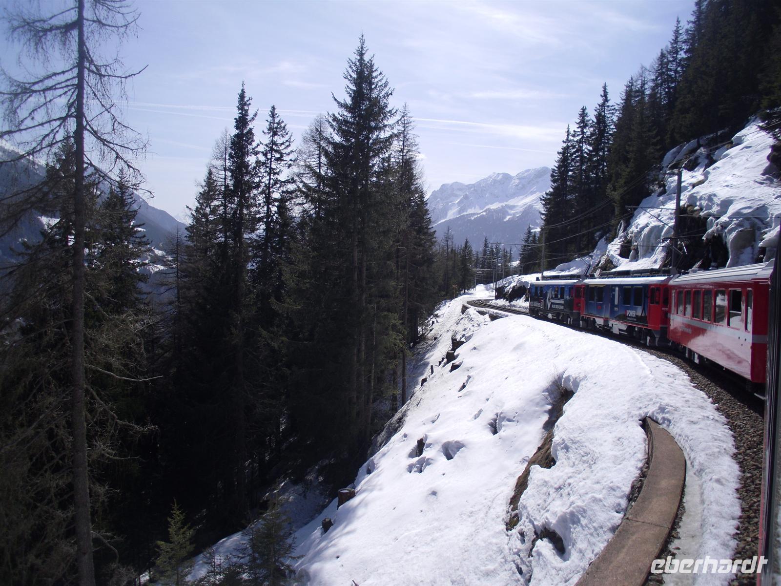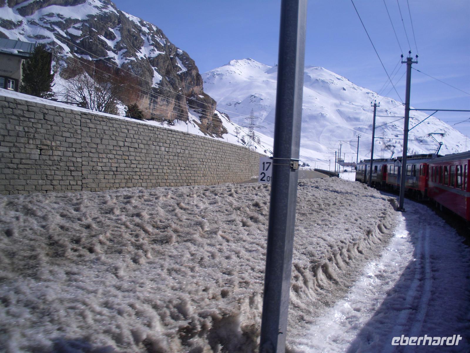 Heute steht bereits der nächste Höhepunkt dieser Reise, die Fahrt mit dem Bernina-Express, auf dem Programm. Mit unserem Bus geht es über den 2.284 Meter hohen Julier-Pass vorerst nach St. Moritz. St. Moritz ist der Inbegriff des Engadins schlechthin, bezeichnet sich selbst als "Top of the World" und hat als erster weltweit seinen Namen als Marke rechtlich schützen lassen. Hier verbringen die Schönen und Reichen ihren Winterurlaub, hier trifft man die höchste Dichte an Luxushotels der Schweiz, hier pulsiert im Winter das Leben... Aber welch eine Ernüchterung bei der Einfahrt in den Ort - gesichtslose Bauten aus der 60er und 70er Jahren wirken eher abstoßend. Alte Engadiner Häuser und verschwiegene Winkel findet man leider kaum noch. Wir sind uns alle einig - man muss den Ort zwar gesehen haben, aber wir fahren letztendlich schnell weiter und wollen nach Pontresina.