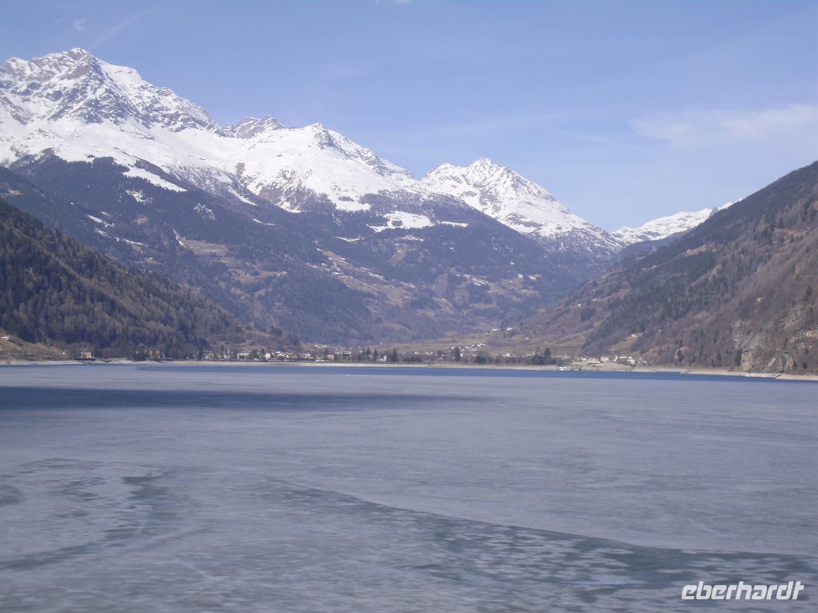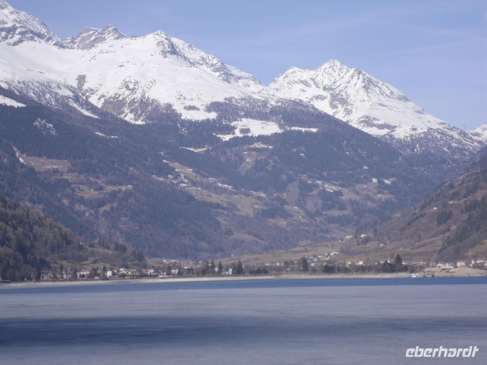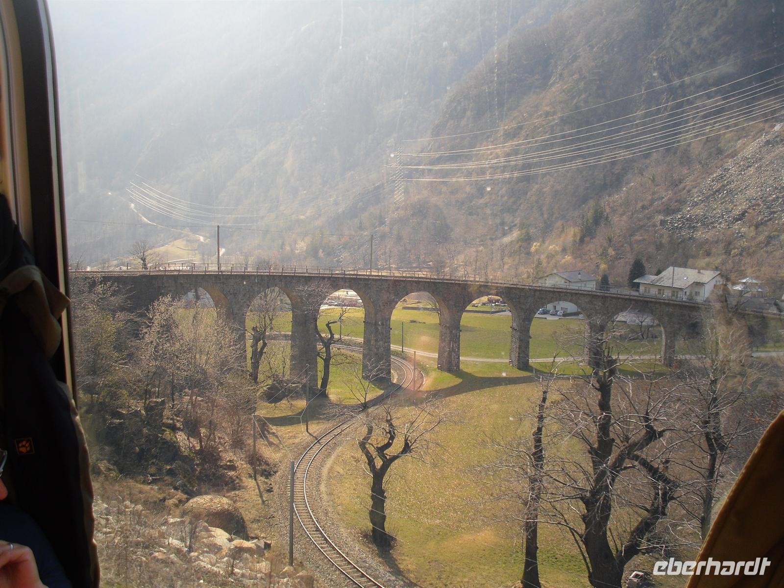 Dort steigen wir bei herrlichem Sonnenschein in den Bernina-Express ein. Die Bernina-Linie ist die einzige Schweizerbahn, die offen über die Alpen führt. Sie wurde 1910 fertig gestellt und bringt uns von den Gletschern des Berninapasses auf 2.253 m ü. d. M. hinunter auf 429 m ü. d. M. nach Tirano. Während der Höhenunterschied zwischen Ospizio Bernina und Tirano 1.824 Meter beträgt, misst die Horizontaldistanz nur 22 Kilometer. Diese Höhendifferenz wird ohne Zahnrad-Strecken überwunden - trotz Steigungen von bis zu 70o/oo. Das ist das absolute Maximum, das eine Adhäsionsbahn noch nutzbringend bewältigen kann. Besonders raffiniert ist übrigens auch die Wahl der Linienführung. Sie ermöglicht nicht nur die Überwindung der immensen Höhenunterschiede, sie eröffnet dem Reisenden auch atemberaubende Ausblicke auf eine imposante Bergwelt, auf Gletscher und Täler. Gegen Mittag kommen wir schließlich nach einer etwa 2-stündigen Fahrt im Bernina-Express im italienischen Tirano an. Unser Buschauffeur André hat schon die köstlichen "5-Gänge-Menüs" (Bockwurst/Wiener serviert auf einer Pappe + Senf + Brot + Serviette) vorbereitet und so stärken wir uns erstmal mit einem kleinen Imbiss aus dem Bus. Nun aber los - mit dem Bus fahren wir wiederum nach kurzer Zeit über die italienisch-schweizerische Grenze.