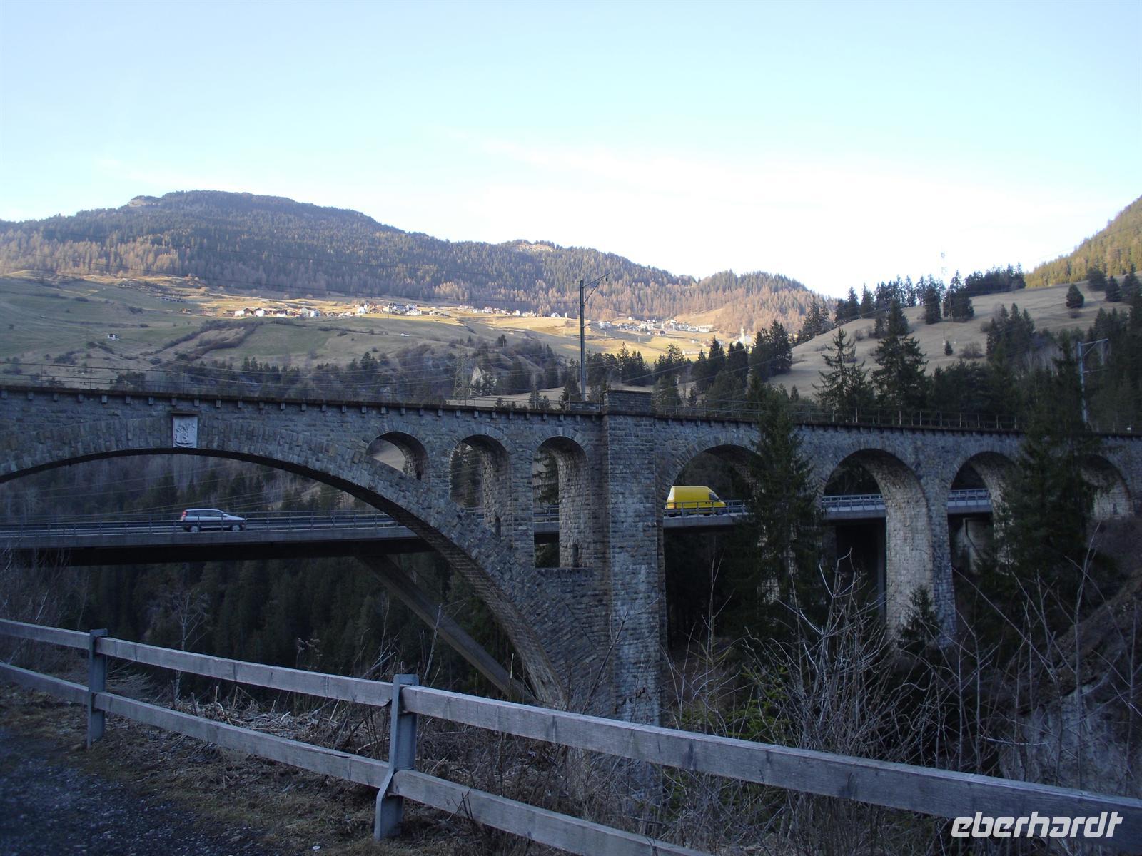 Brusio soll unser erstes Ziel sein, denn dort erlebt man eine wahre Einzigartigkeit - der Bernina-Express beschreibt eine Schleife über einen Kreisviadukt. 107 Meter ist er lang, und er dürfte zu den meistfotografierten Bauwerken der Rhätischen Bahn zählen. Diese 360-Grad-Kehre bringt wertvolle Höhenmeter, ein Griff in die Trickkiste der Bahnbauer, der sonst nur bei Kehrtunnels angewendet wird. Wir warten leider ca. 30 Minuten vergeblich auf einen Zug... - unsere Geduld wird auf eine harte Probe gestellt! Weiter hinauf geht es zum Lago di Poschiavo und durch die Ortschaften des Val di Poschiavo, einem italienischsprachigen Südtal des Kantons Graubünden. Nun erreichten wir die Bernina-Passstraße. Diese ist gewöhnlich ganzjährig geöffnet und stellt die Verbindung zwischen dem Puschlav im Süden und dem Engadin im Norden dar. Damit ist der Pass gleichzeitig eine Sprachgrenze. Eine gelbe Tafel auf dem Pass signalisiert die Europäische Wasserscheide, das Wasser in Richtung Süden gelangt über die Flüsse Poschiavino, Adda und Po ins Adriatische Meer und das Wasser in Richtung Norden wird über den Inn und die Donau ins Schwarze Meer geleitet. Noch ein kurzer Fotostopp mit Blick auf den Morteratsch-Gletscher und zurück geht es wieder über den Julier-Pass nach Thusis. Jetzt geht ein langer und erlebnisreicher Tag zu Ende. Heute geniessen wir zum Abendessen ein vorzügliches Bauernbuffet, hier ist für jeden von uns etwas dabei - na dann "Guten Appetit"!