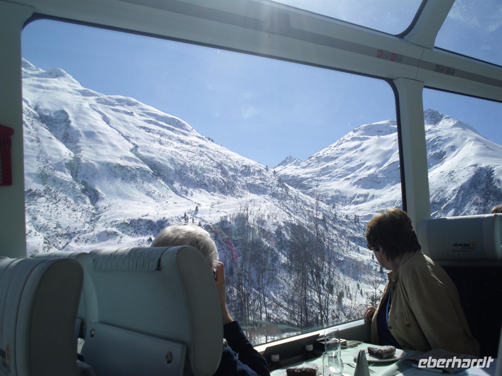 Nachdem wir es uns in unserem Panoramawagen der 2. Klasse gemütlich gemacht haben, geht es über Chur, Reichenau, die Vorderrheinschlucht, Disentis, über den 2.033 Meter hohen Oberalppass, Andermatt und das Goms nach Brig. Die Bahnfahrt mit dem langsamsten Schnellzug der Welt (durchschnittlich 35 km/h) dauert für uns etwa fünf Stunden, aber keine Angst - niemandem von uns wurde langweilig. Das Landschaftsbild verändert sich ständig und es gibt verdammt viel zu sehen...! Zudem werden wir zum Mittagessen kulinarisch verwöhnt, es gibt Geschnetzeltes und anschließend ein Dessert. Am Nachmittag erreichen wir Brig, den Hauptort des deutschsprachigen Wallis. Buschauffeur André erwartet uns bereits am Bahnhof und so fahren wir weiter durch das Rhonetal nach Martigny. In Martigny werden wir für die nächsten drei Nächte im Hotel "Alpes & Rhones" Quartier beziehen. Die Kleinstadt Martigny am Rhoneknie im Unterwallis ist Knotenpunkt der Passrouten über Simplon, Grosser Sankt Bernhard und Forclaz. Sie überzeugt durch ihr kulturell-historisches Erbe ebenso wie durch südländisches Flair und schmackhafte Gastronomie.