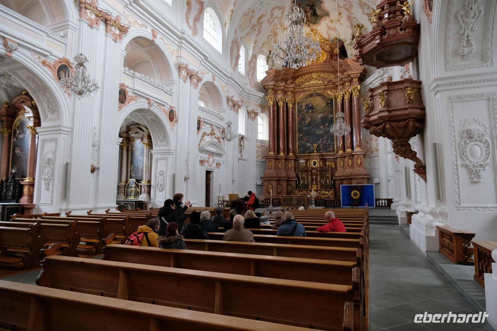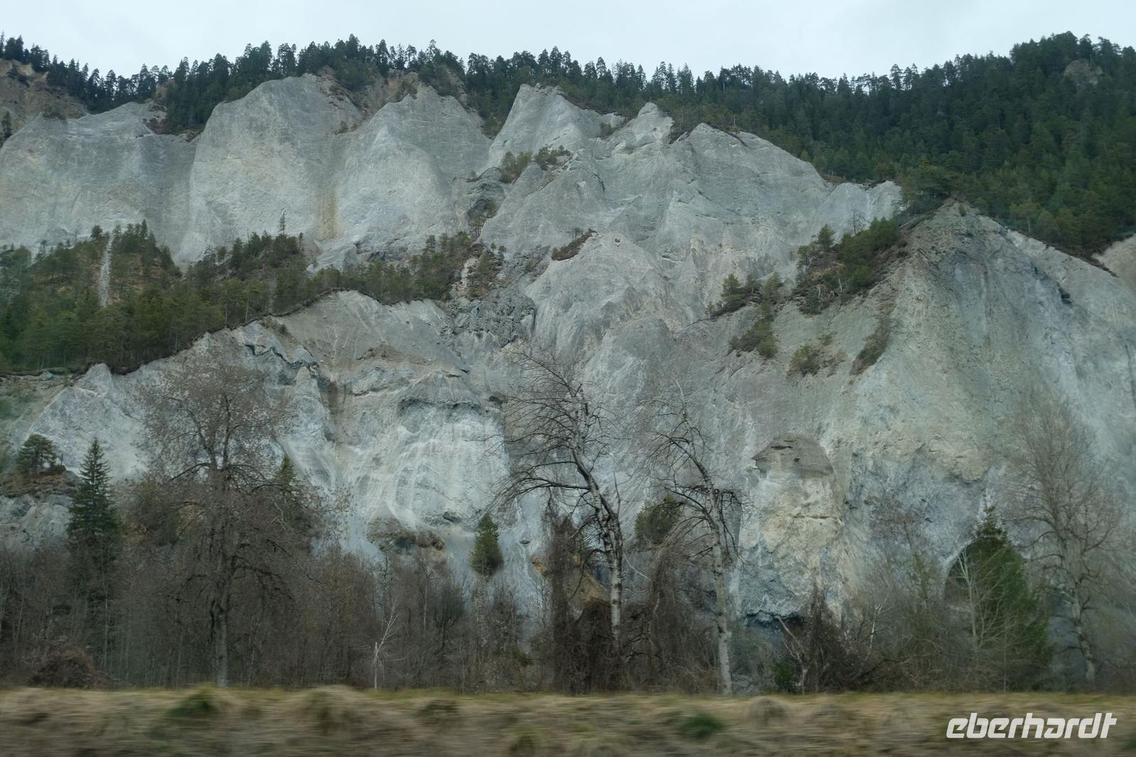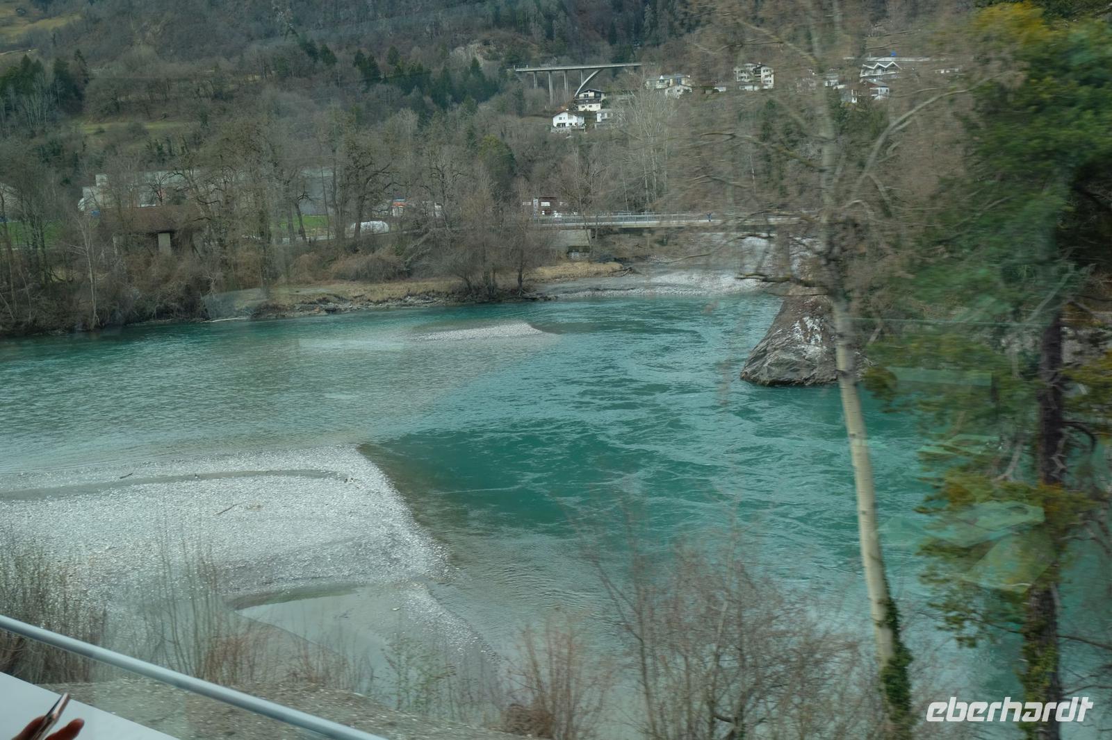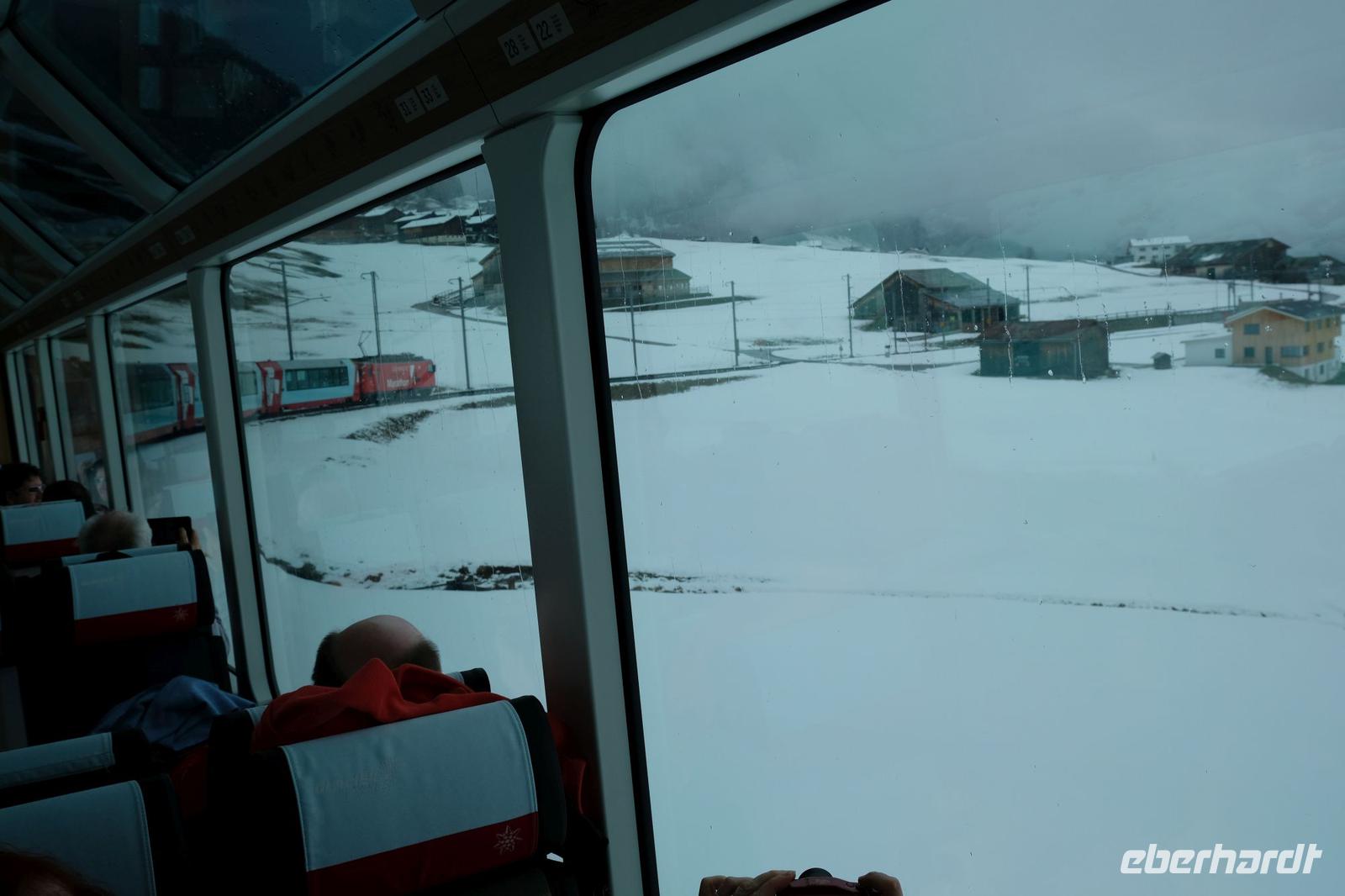Heute mussten die Koffer im Bus verladen werden, denn wir wechselten das Hotel. Unsere Fahrt ging nach dem Frühstück nach Andermatt. Dort erwartete uns der Glacier-Express. Während es am Vierwaldstädter See schon fast Frühling war, erreichten wir Andermatt bei Nebel und Schneefall. Es war ein richtiger Wintertag. Bei einem Spaziergang durch den Ort konnte man die großen Veränderungen der letzten Jahre bemerken. Mit dem Tourismusprojekt Andermatt Swiss Alps, des ägyptischen Multimilliardärs und Investors Samih Sawiris, hofft man auf eine starke touristische Entwicklung. Er investiert in dieser Tourismusregion in mehrere Hotels, Apartmenthäuser, 25 Villen, eine Eissporthalle, Hallenbad, eine Konzert- und Kongresshalle und einen Golfplatz. Pünktlich11.54 Uhr fuhr unser Zug Richtung Chur. Den Aufstieg zum Oberalppass konnte man aufgrund des Nebels nicht so genießen, aber die Sicht und auch die Laune wurden besser. In Disentis konnten wir das Benediktinerkloster St. Martin aus dem Zug heraus bewundern.