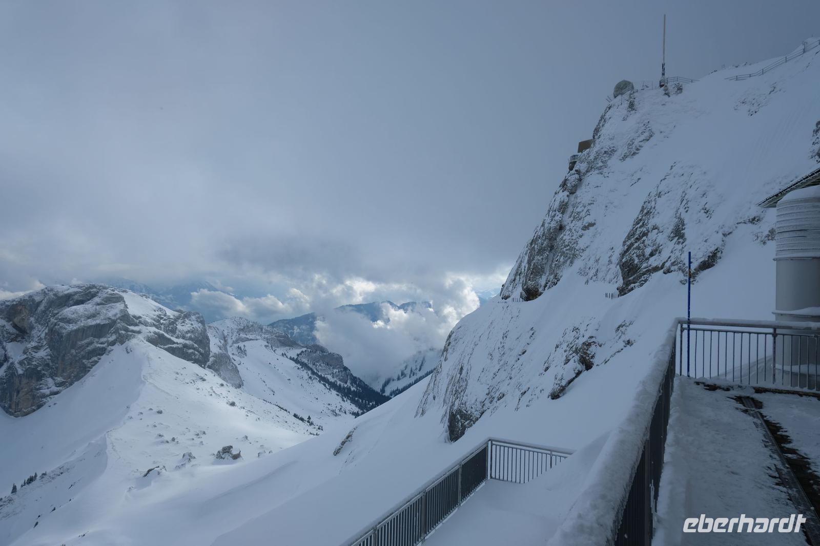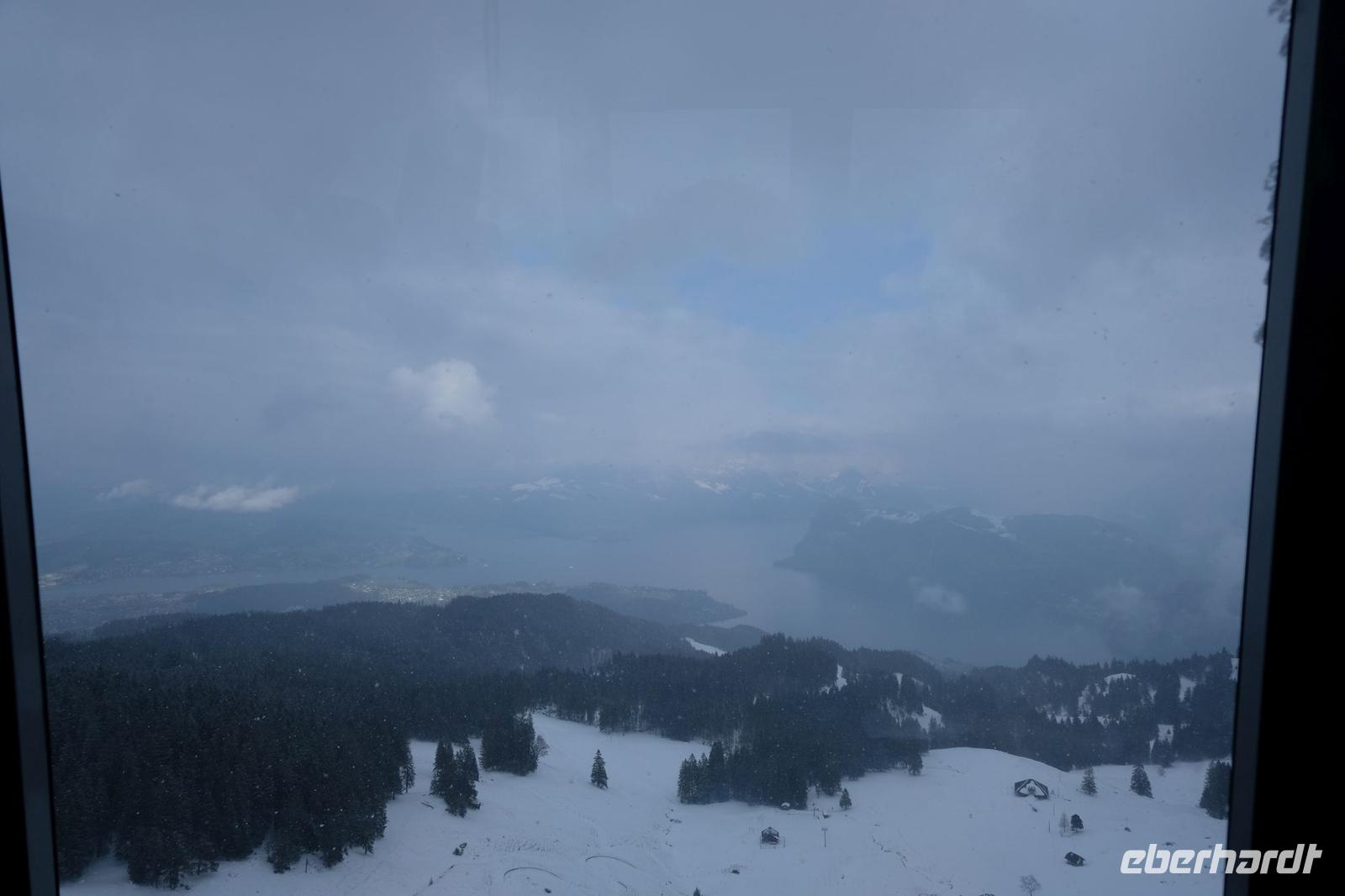 Anschließend fuhren alle Gäste nach Kriens. Trotz Nebel wollten wir alle auf den Pilatus, in der Hoffnung auf einigermaßen schöne Sicht. Zunächst mit der 4er Gondel bis nach Fräkmüntegg, danach weiter mit der Kabinenbahn bis zum Pilatus. Der Esel, als zentraler Gipfel (2122m) war nicht zu erklimmen, die Schneemassen waren noch zu heftig. Das Wetter klarte langsam auf, sodass sogar die Berge in der Umgebung zu sehen waren.